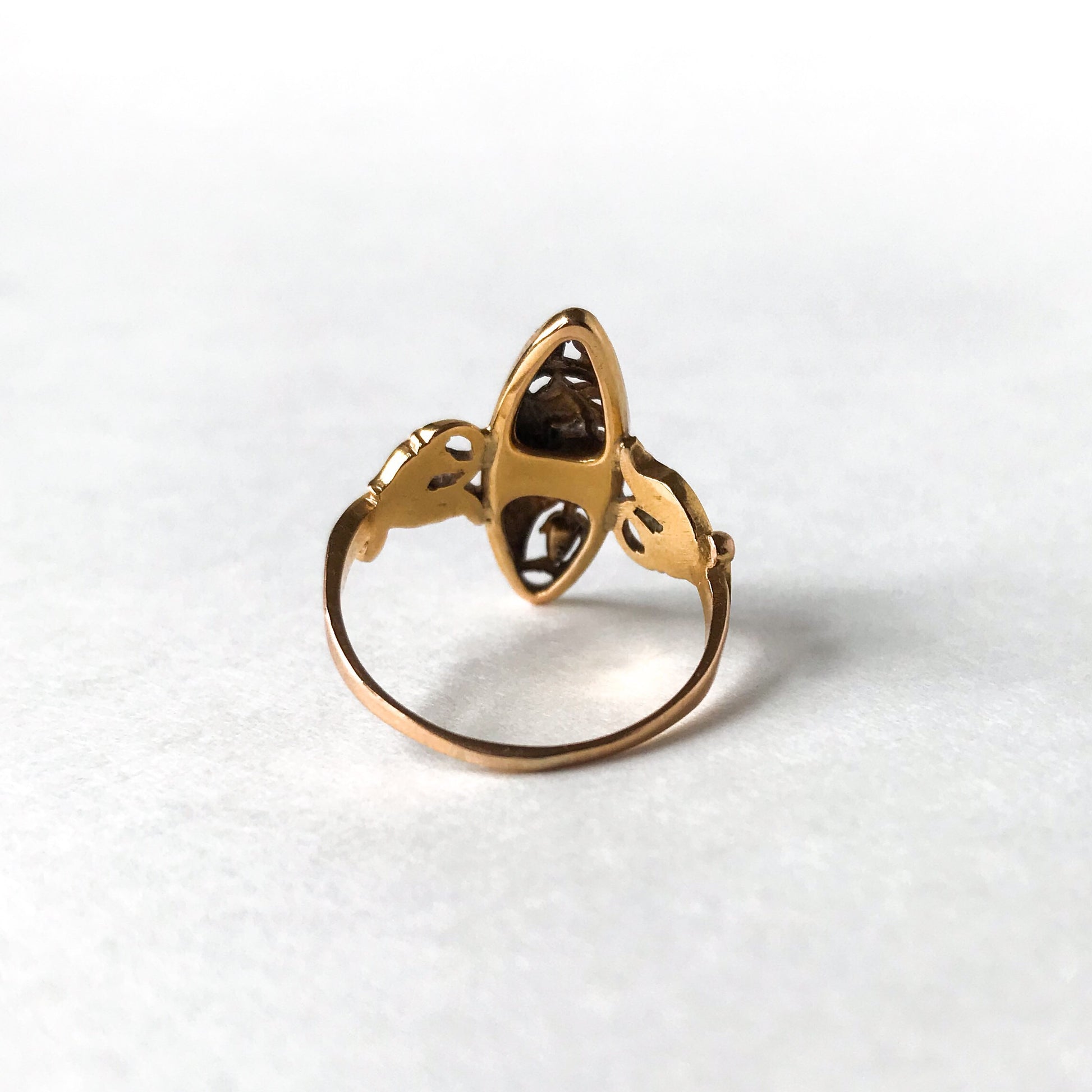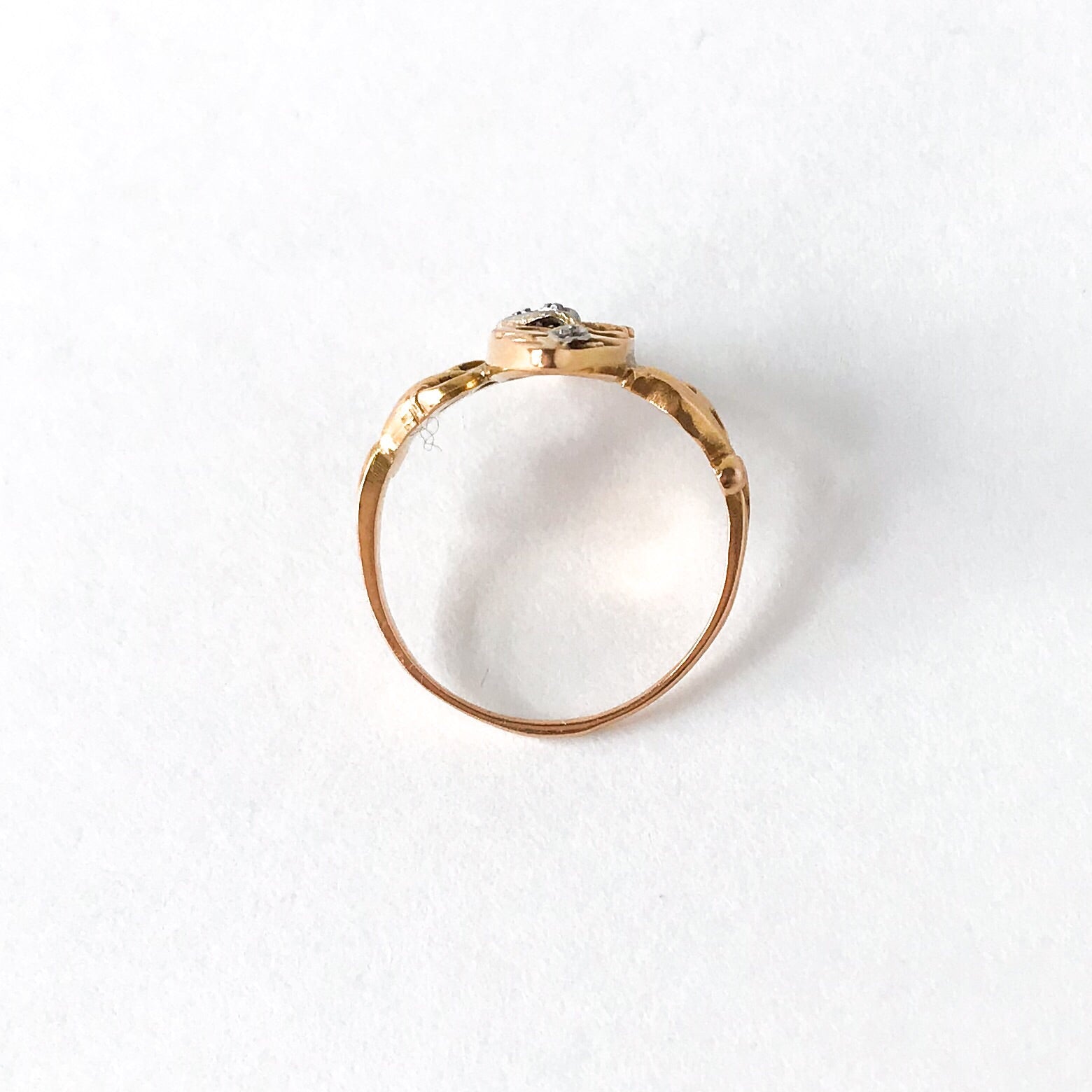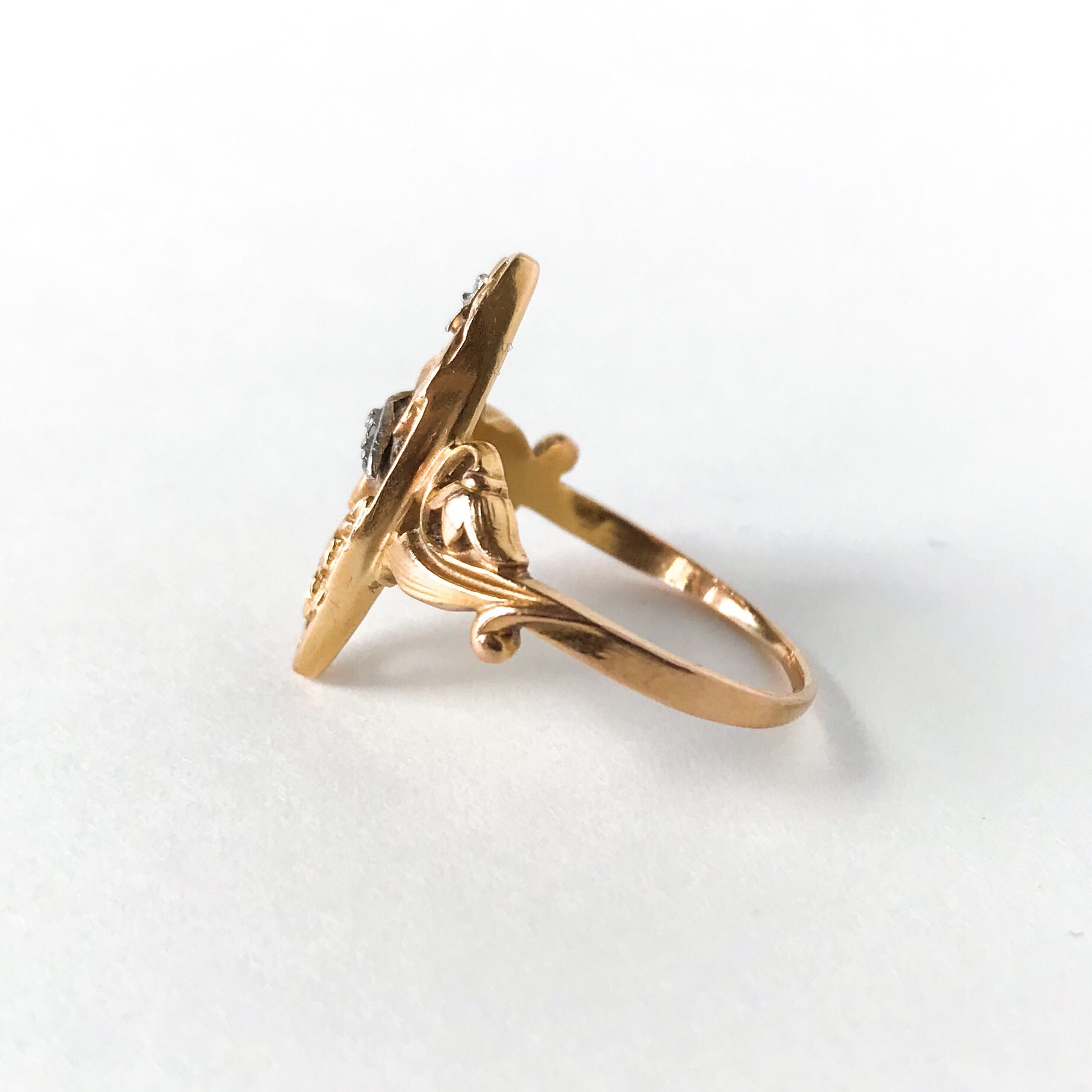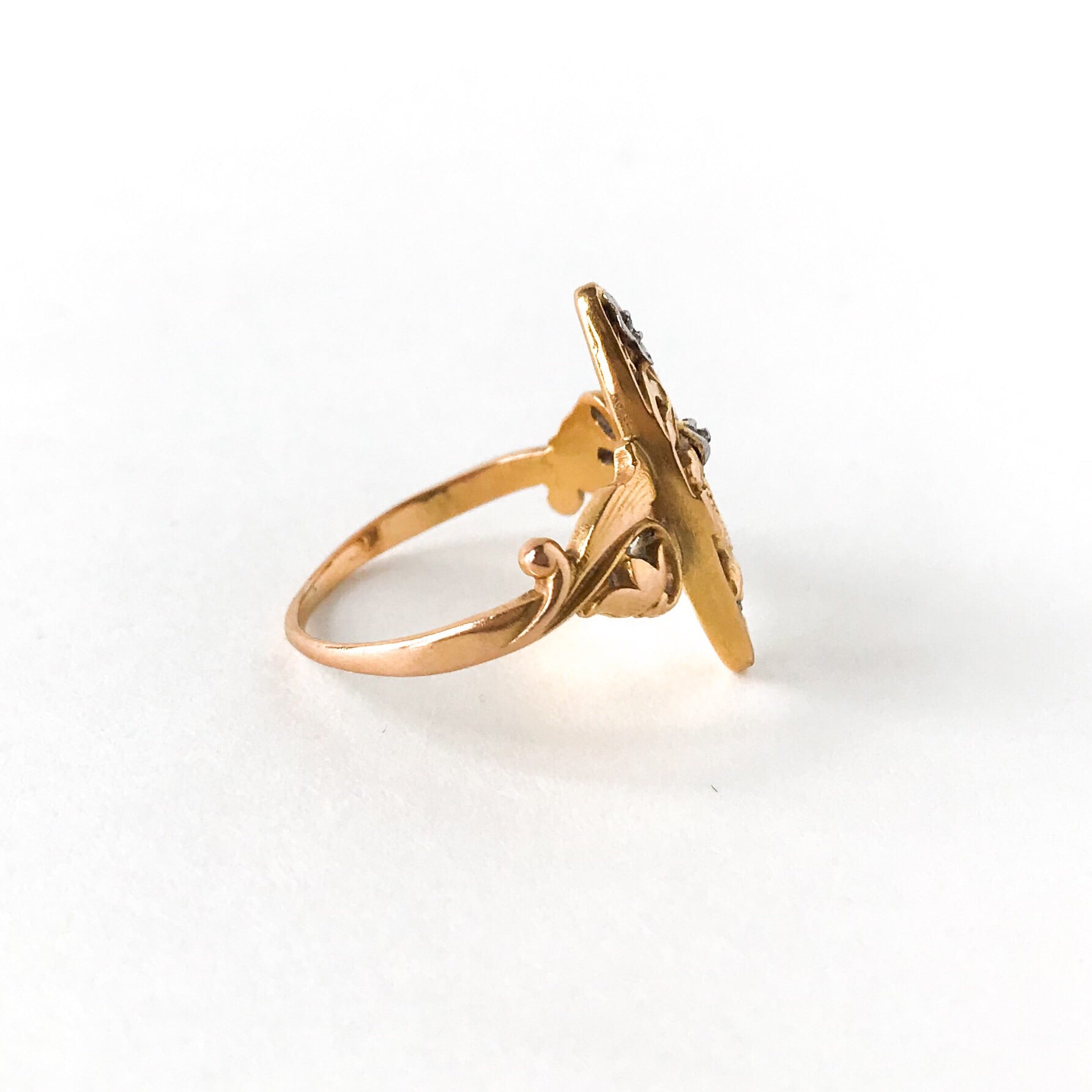 A beautiful, romantic navette shaped diamond ring from the early 1900's featuring three tiny rose cut diamonds set in silver leaves amongst an 18k yellow gold floral openwork mounting. This ring looks very French to me, but it has been resized at some point and there are no hallmarks. I love the gorgeous, flowing, intricate design on this ring-- it is reminiscent of a fairytale!