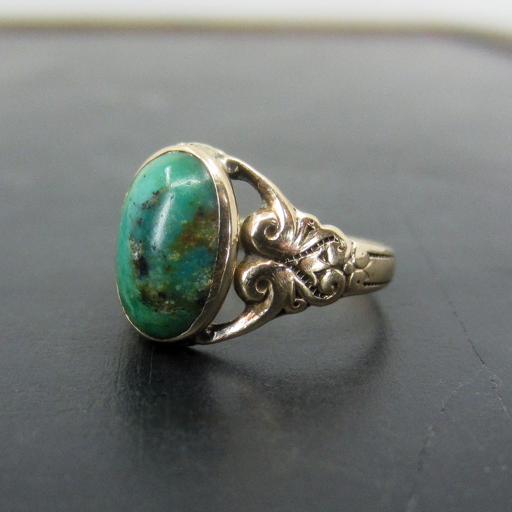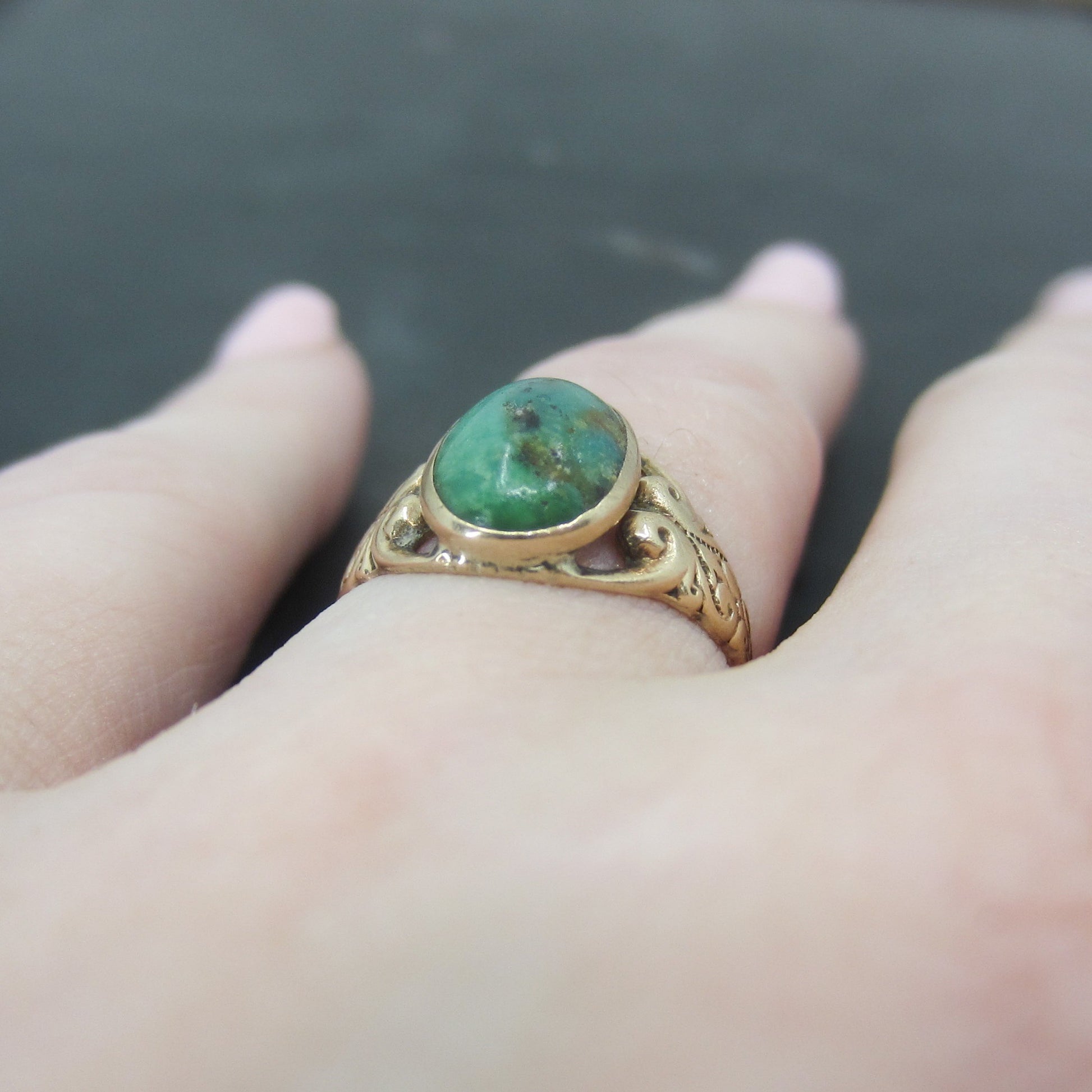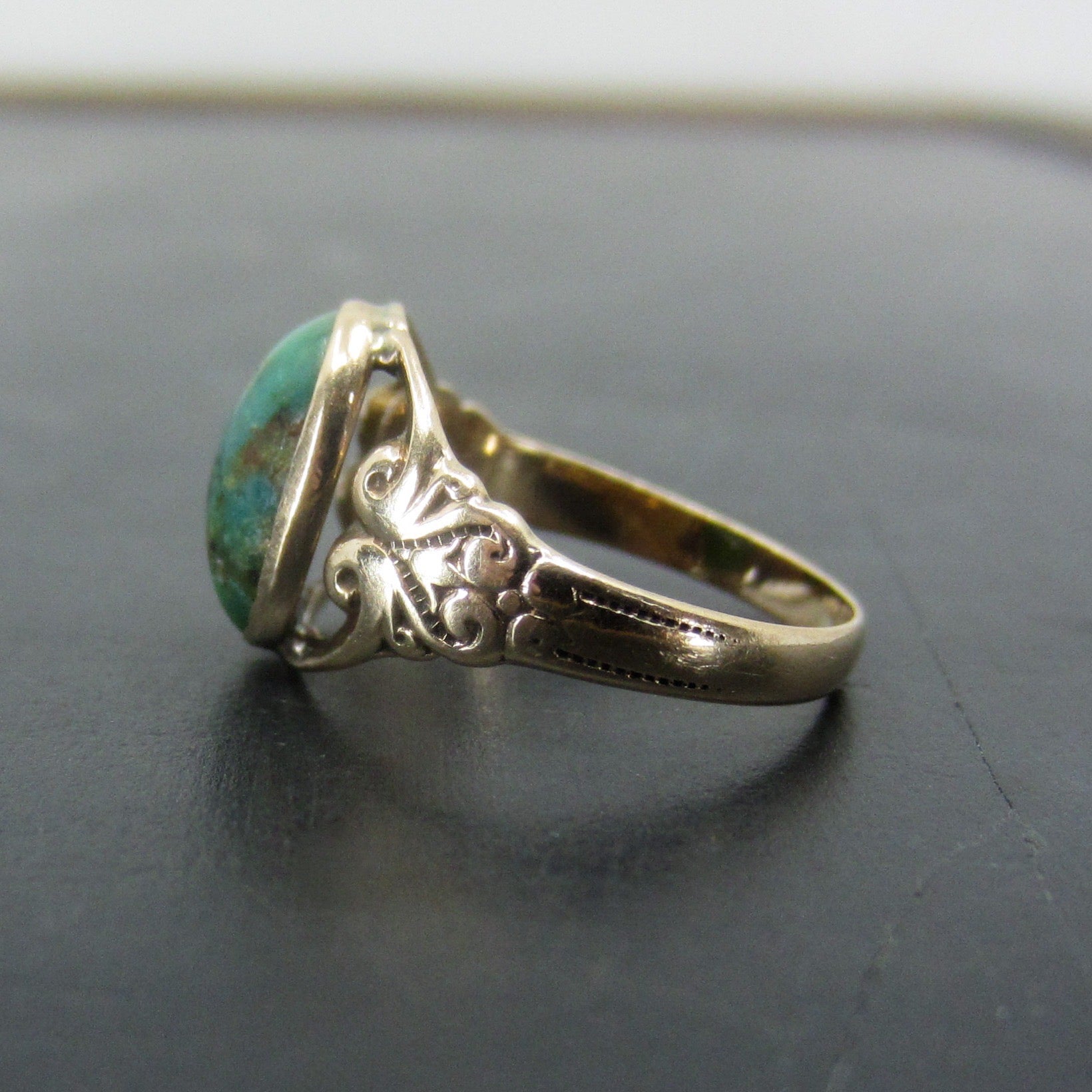 This is a lovely little ring, made in the late 1930's in 10k yellow gold with beautiful Art Deco details on the shoulder and a bezel set natural turquoise in the center. This ring almost has an Egyptian Revival feel to it and the design may have been influenced by that movement. Looks great on a ring finger but would also make an amazing pinky ring!