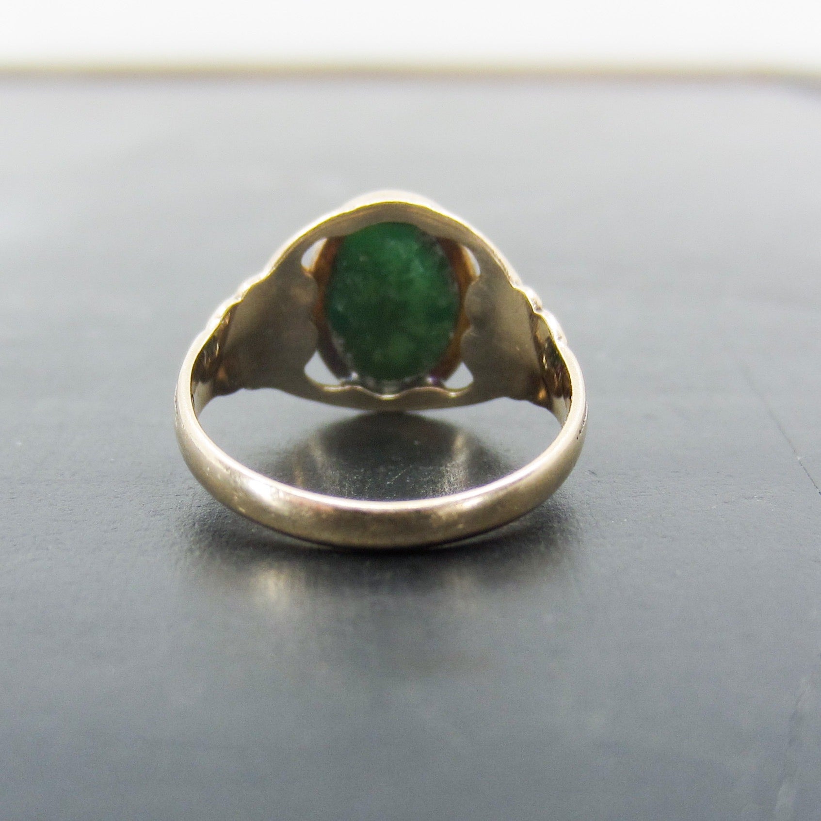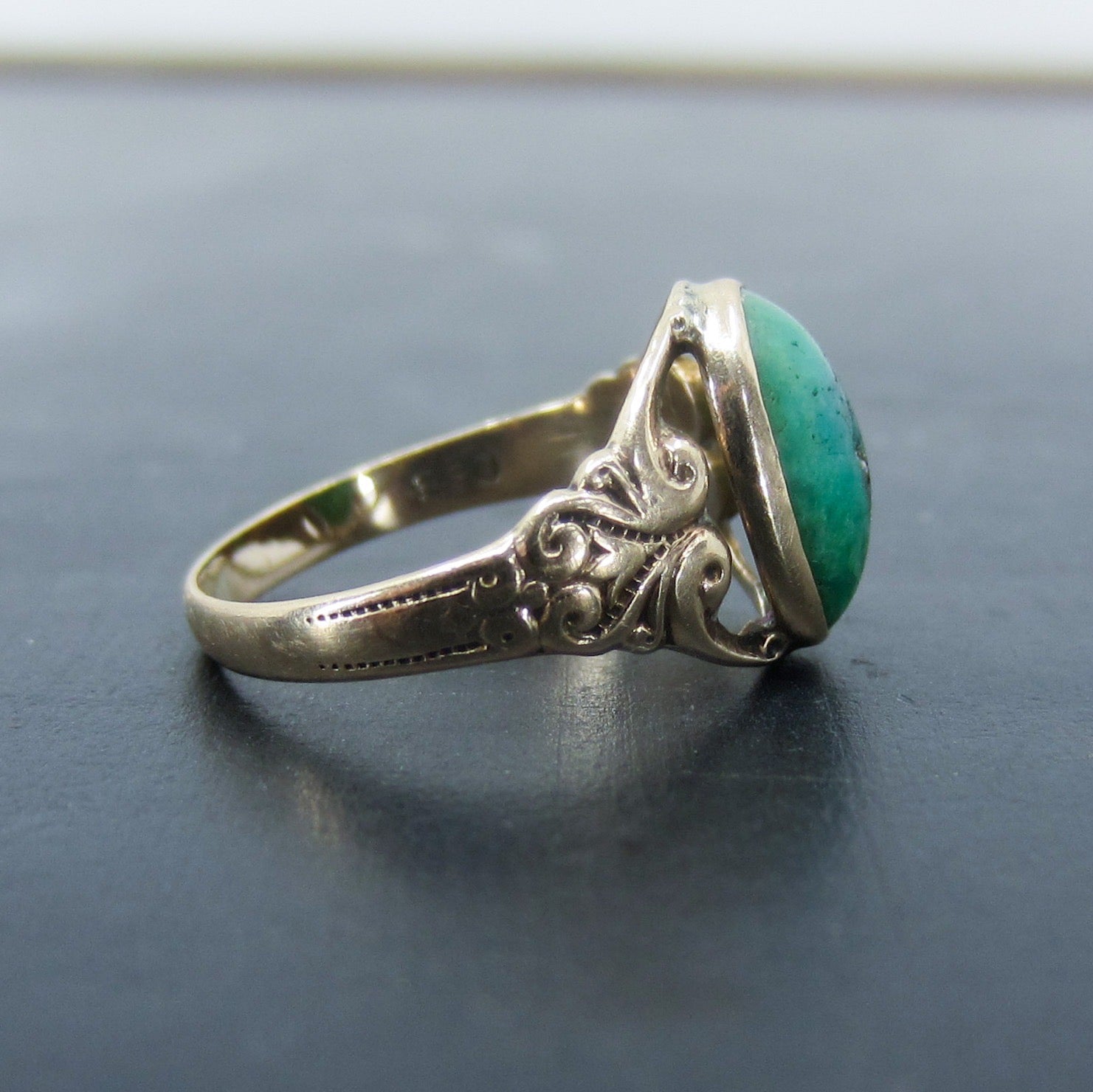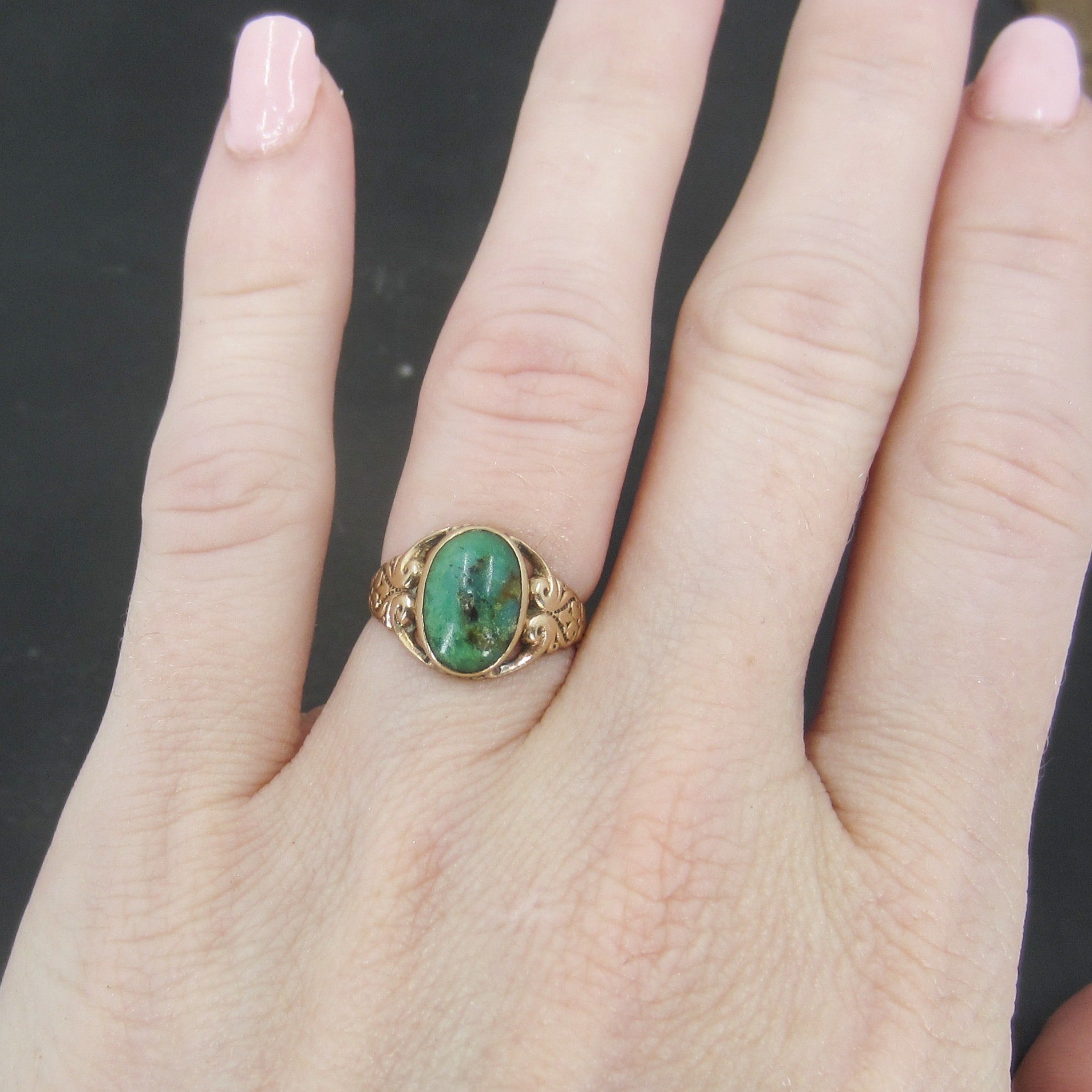 This is a lovely little ring, made in the late 1930's in 10k yellow gold with beautiful Art Deco details on the shoulder and a bezel set natural turquoise in the center. This ring almost has an Egyptian Revival feel to it and the design may have been influenced by that movement. Looks great on a ring finger but would also make an amazing pinky ring!