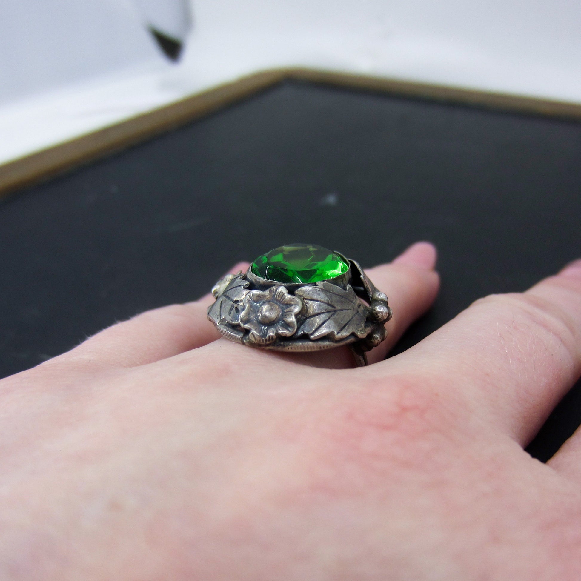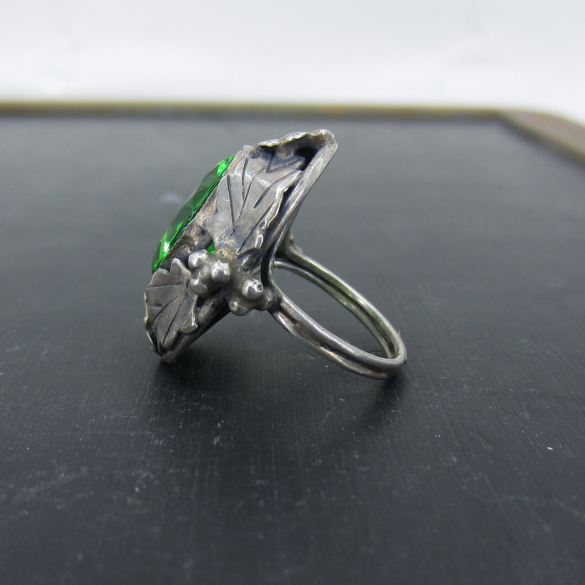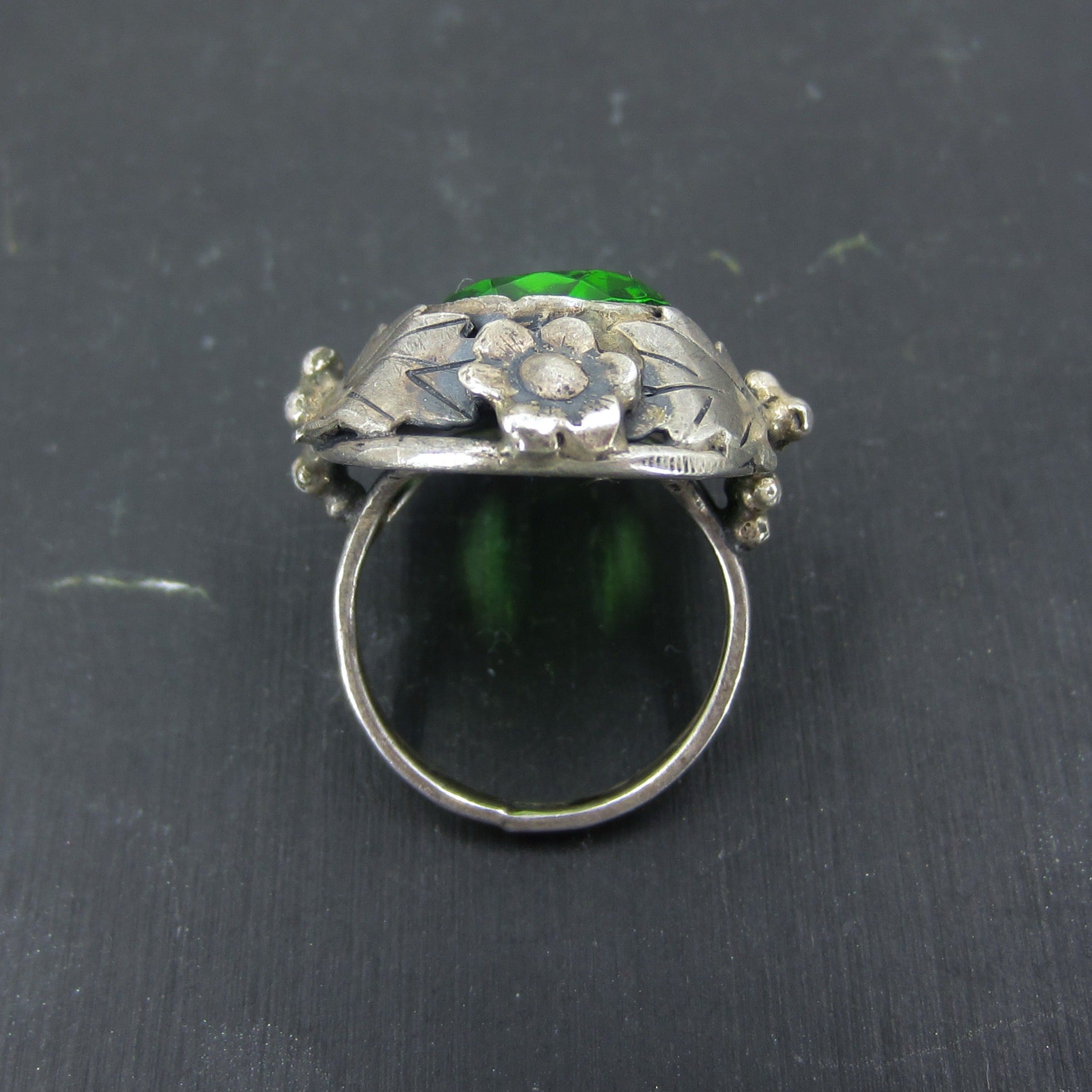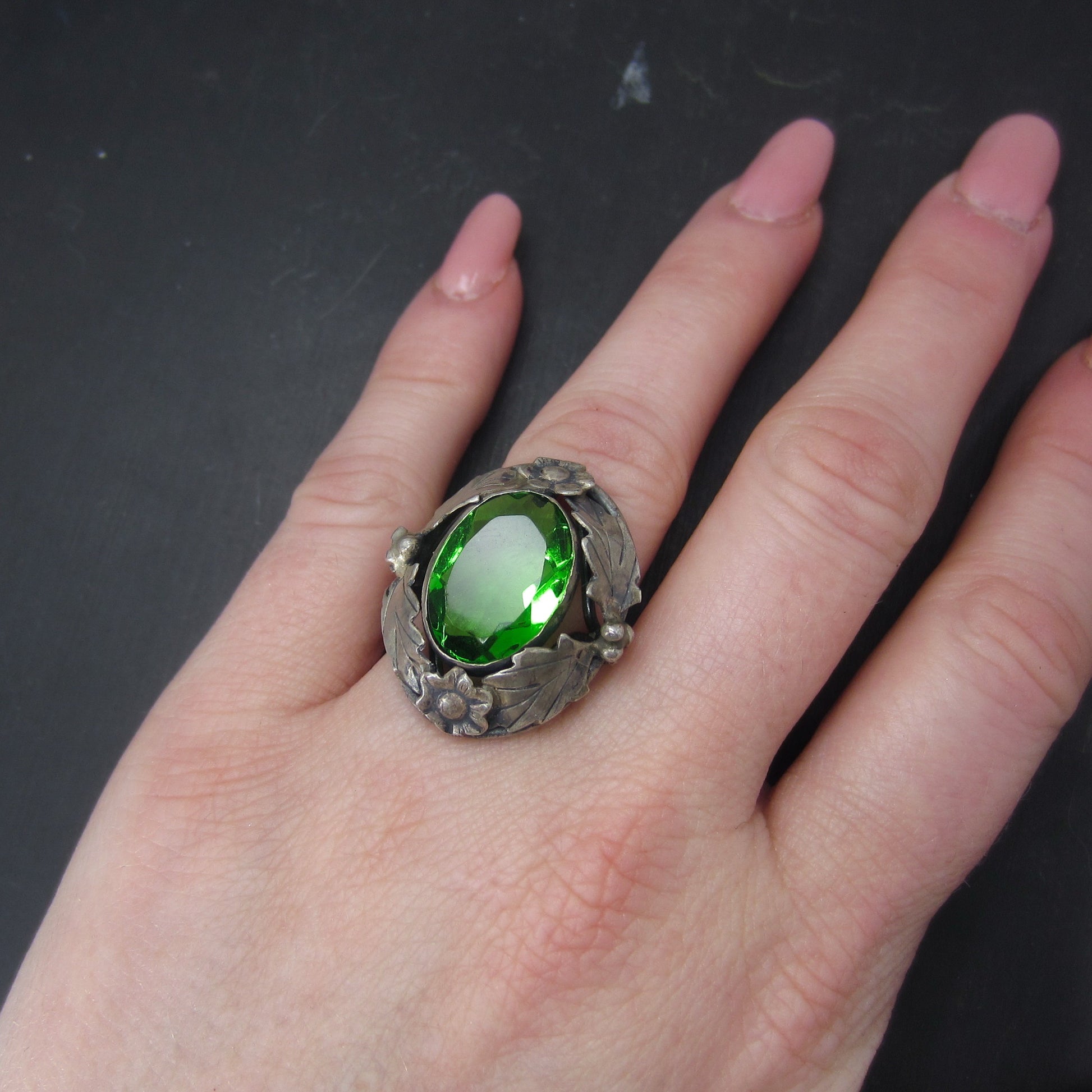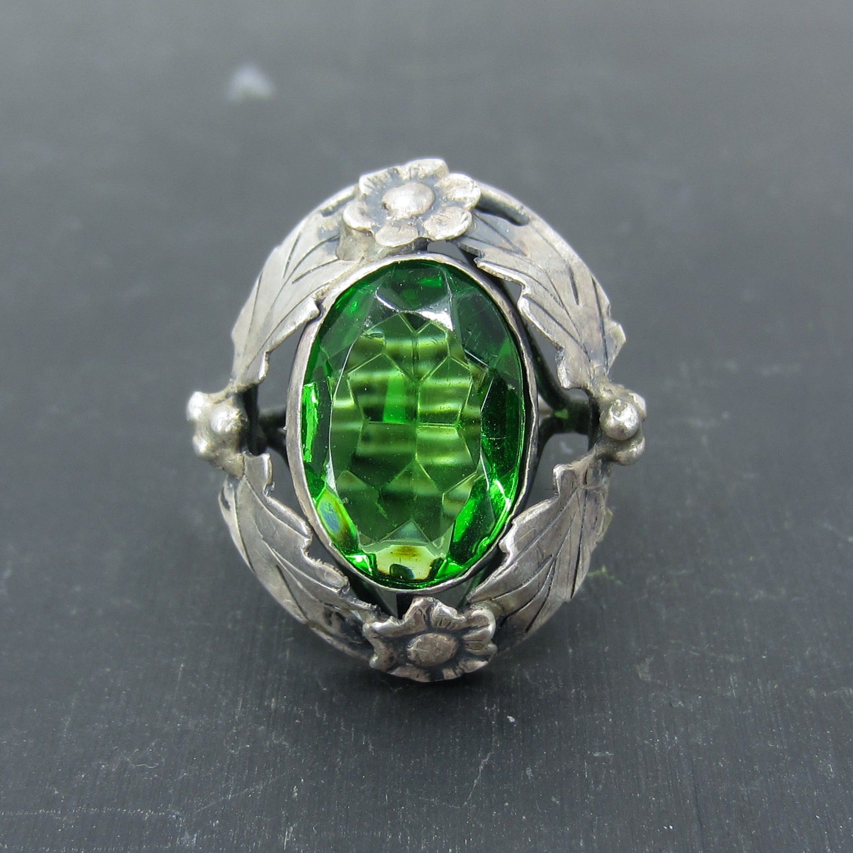 This is a really beautiful ring in person, made during the Arts & Crafts period with a large faceted green glass stone set in a sterling silver mounting with a floral motif. Circa 1920.