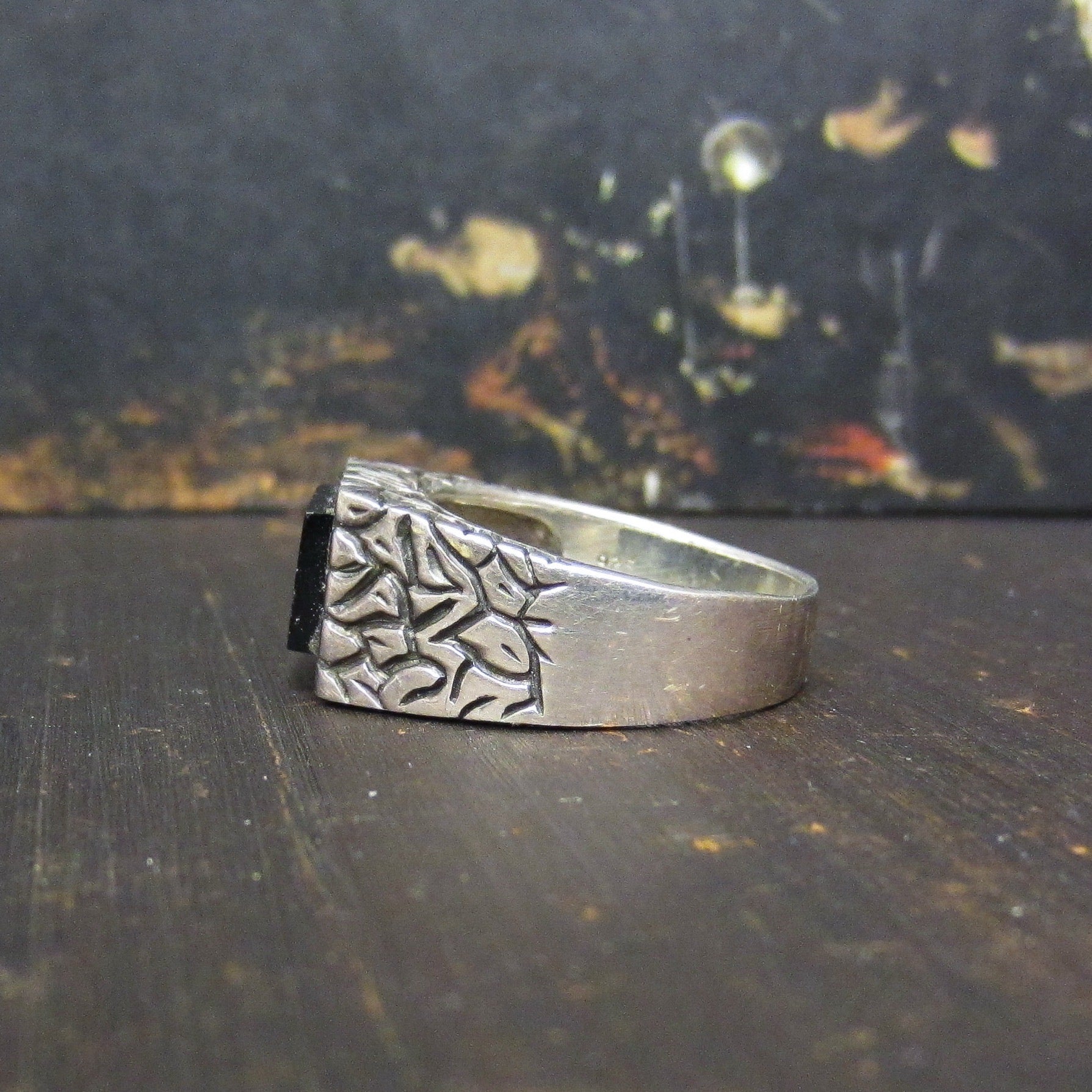 Do you want to look like a cool guy who is hanging out in 1960's Vegas but you don't want to commit to a giant gold nugget pinky ring? Well check this out! This is a Mid-Century men's onyx signet with a cool hand-engraved stone texture to the setting. Made in sterling silver circa 1960.