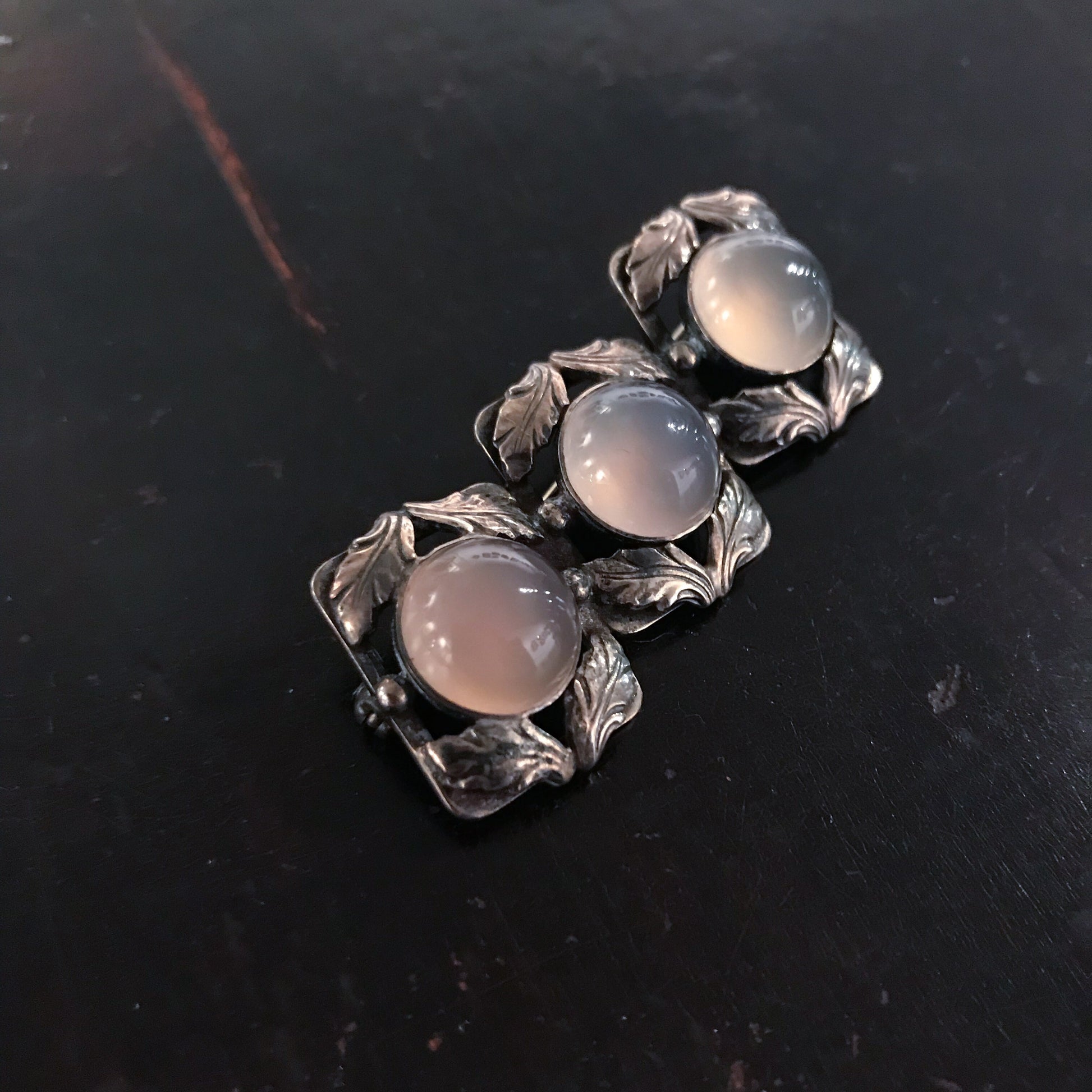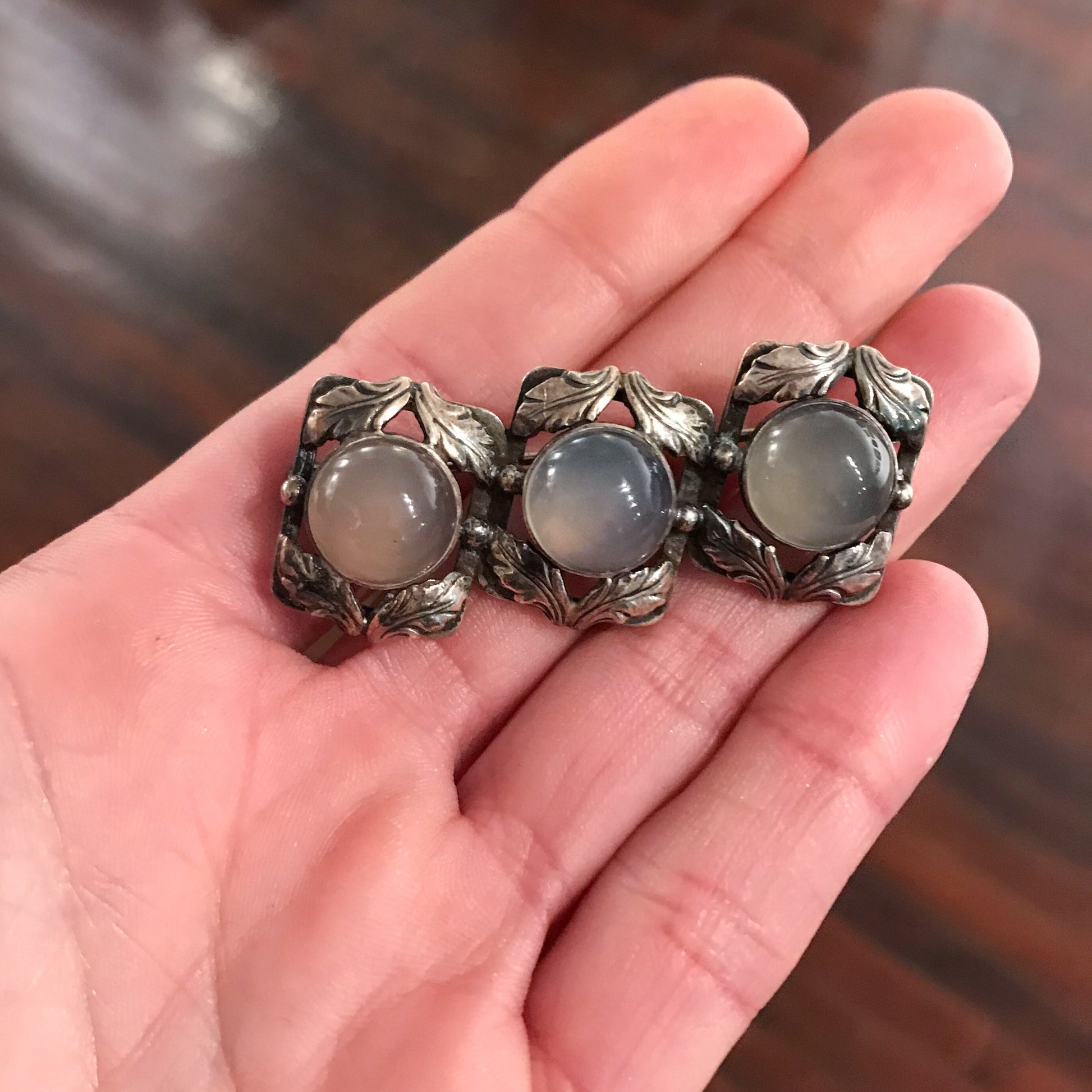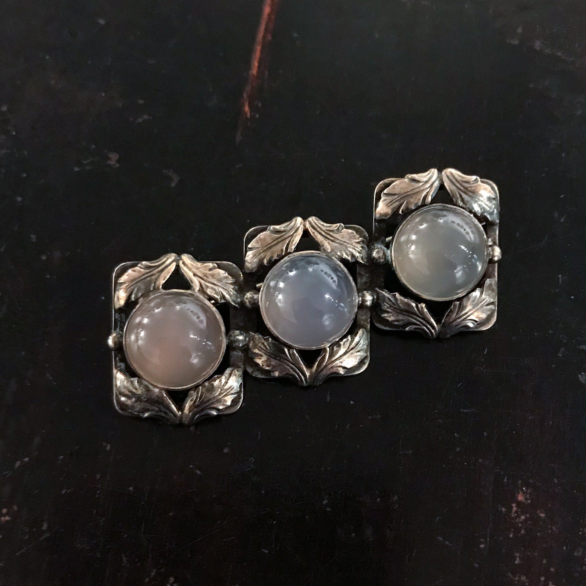 This beautiful mid-century Scandinavian brooch was made by Bjorklund Brothers c. 1950. Three luminous moonstones are set in a sterling silver leaf motif frame. Much prettier than in the photos!