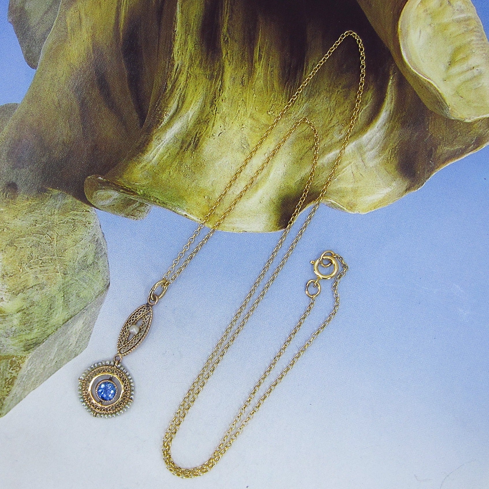 SOLD-Edwardian Seed Pearl and Blue Glass Pendant 10k c. 1910