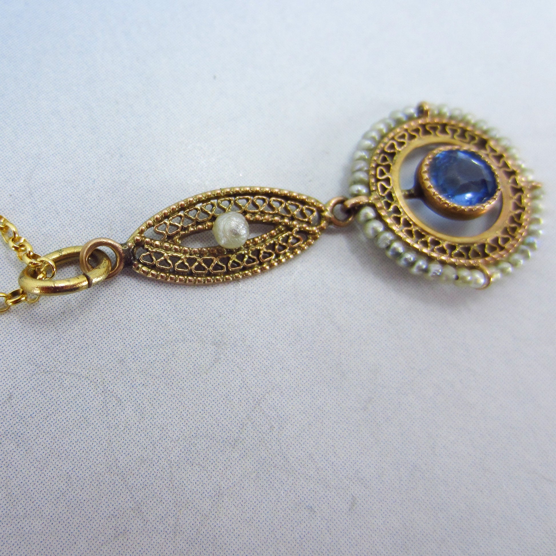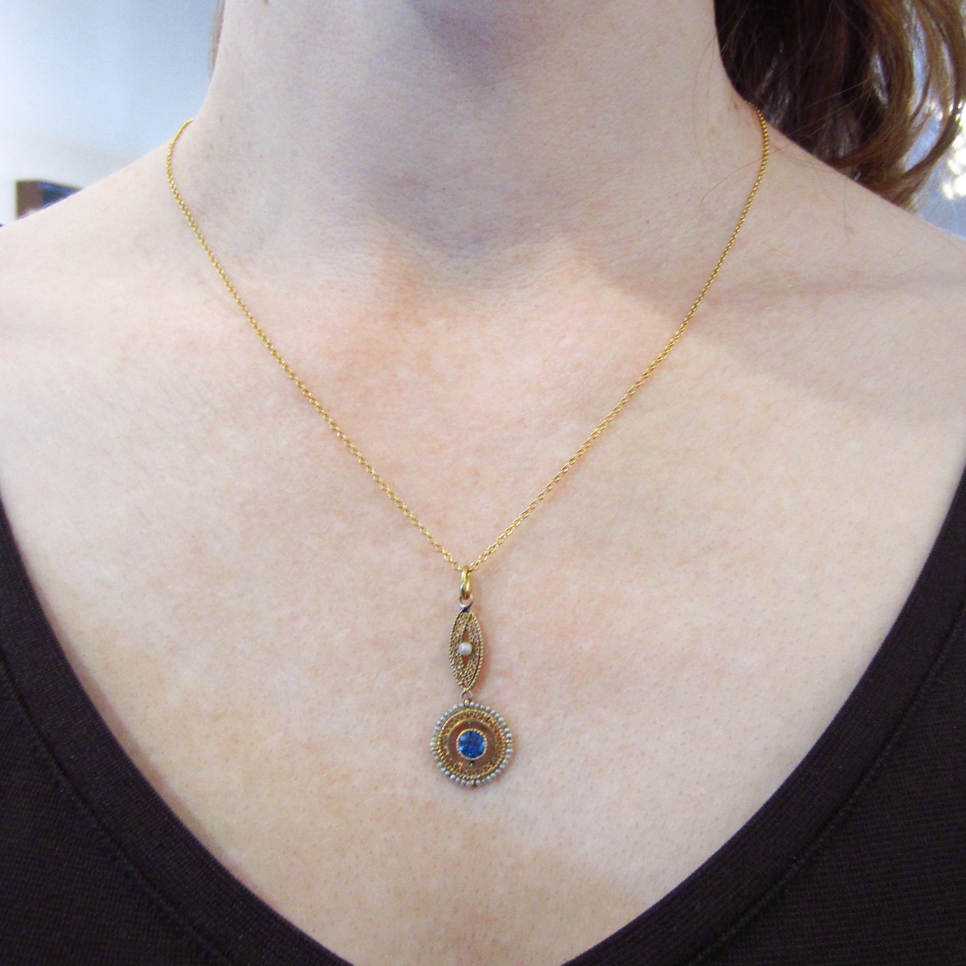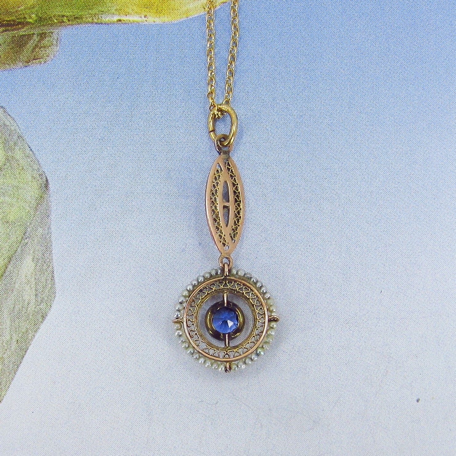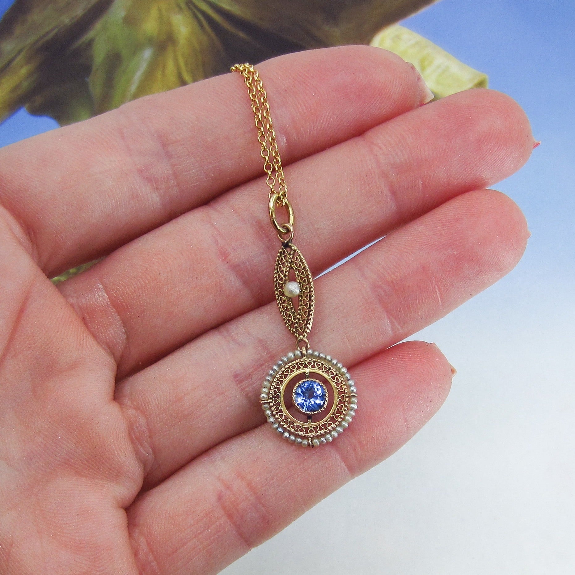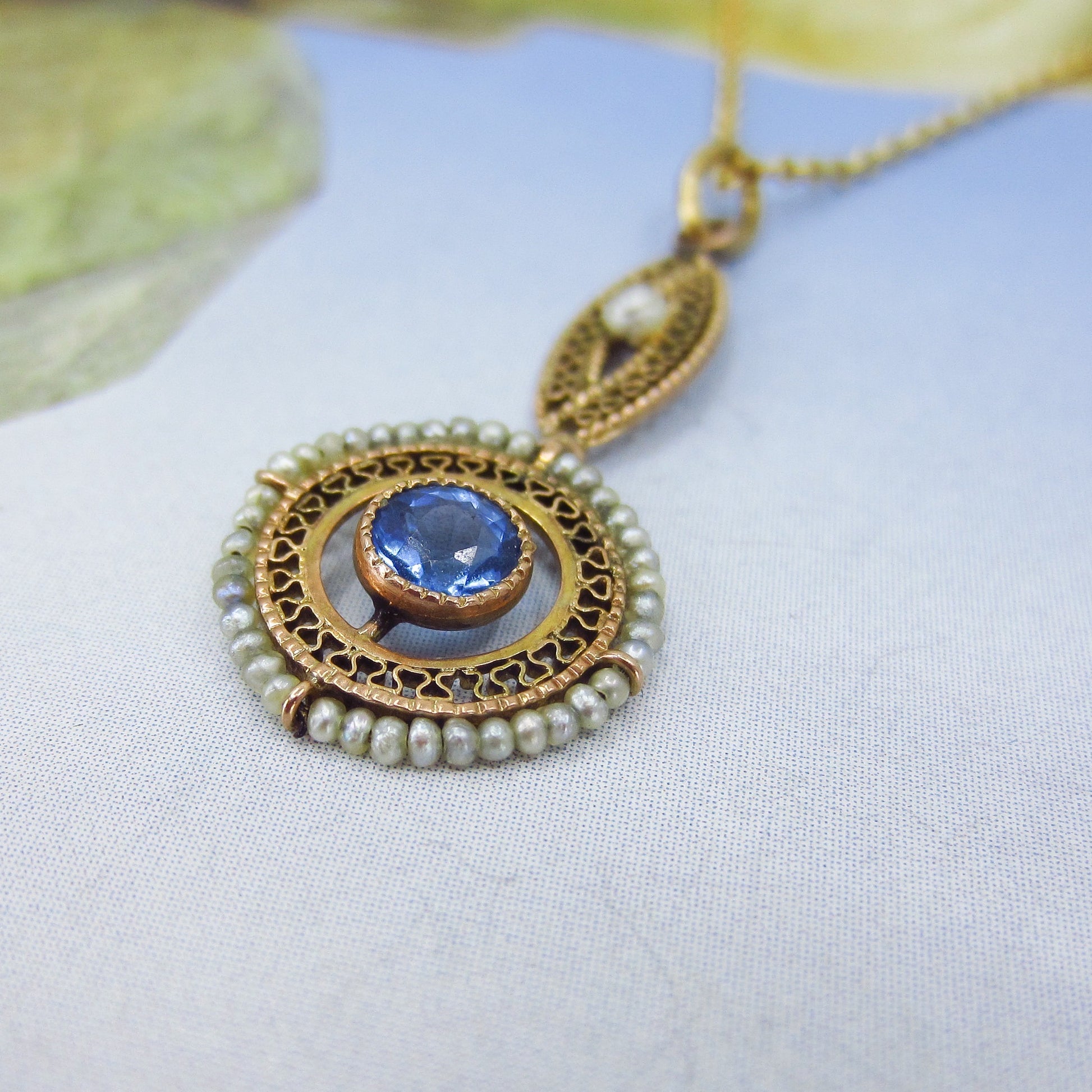 This is a beautiful and delicate example from the first era of mass produced jewelry starting in the late 1800's. Prior to this fine jewelry was generally owned only by the upper classes. In the late Victorian period a consumer could buy a pendant like this through a mail order catalog which, if you've never seen one, are so fantastic because there are of course drawings of the jewelry instead of photographs! This pendant hails from circa 1910 and features natural seed peals framing a sapphire-like blue glass stone, bezel set in 10k yellow gold. The work is incredibly fine, particularly the hand millegrained bezel and the design is so evocative of the period. Lovely to wear on its own, or to stack with other necklaces!