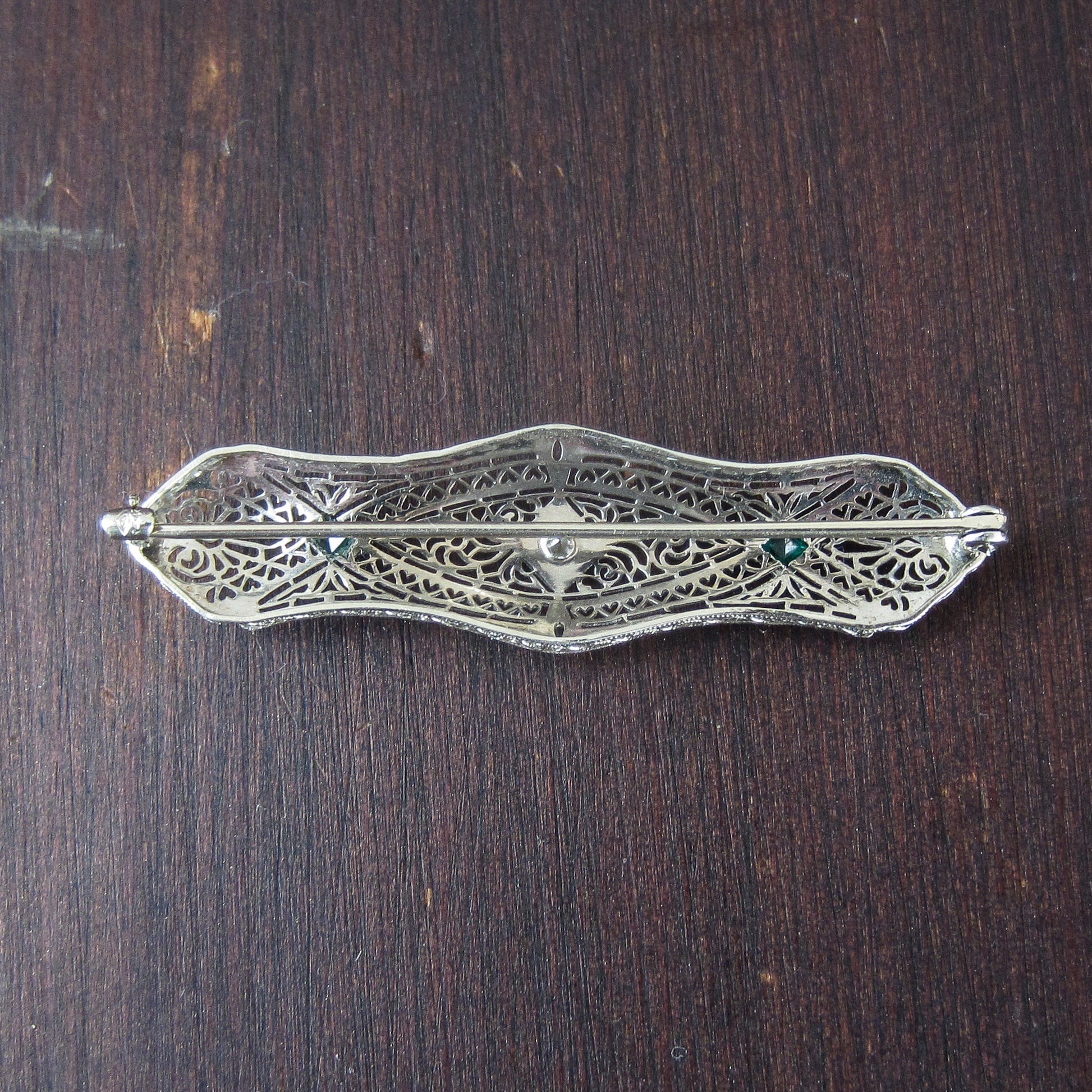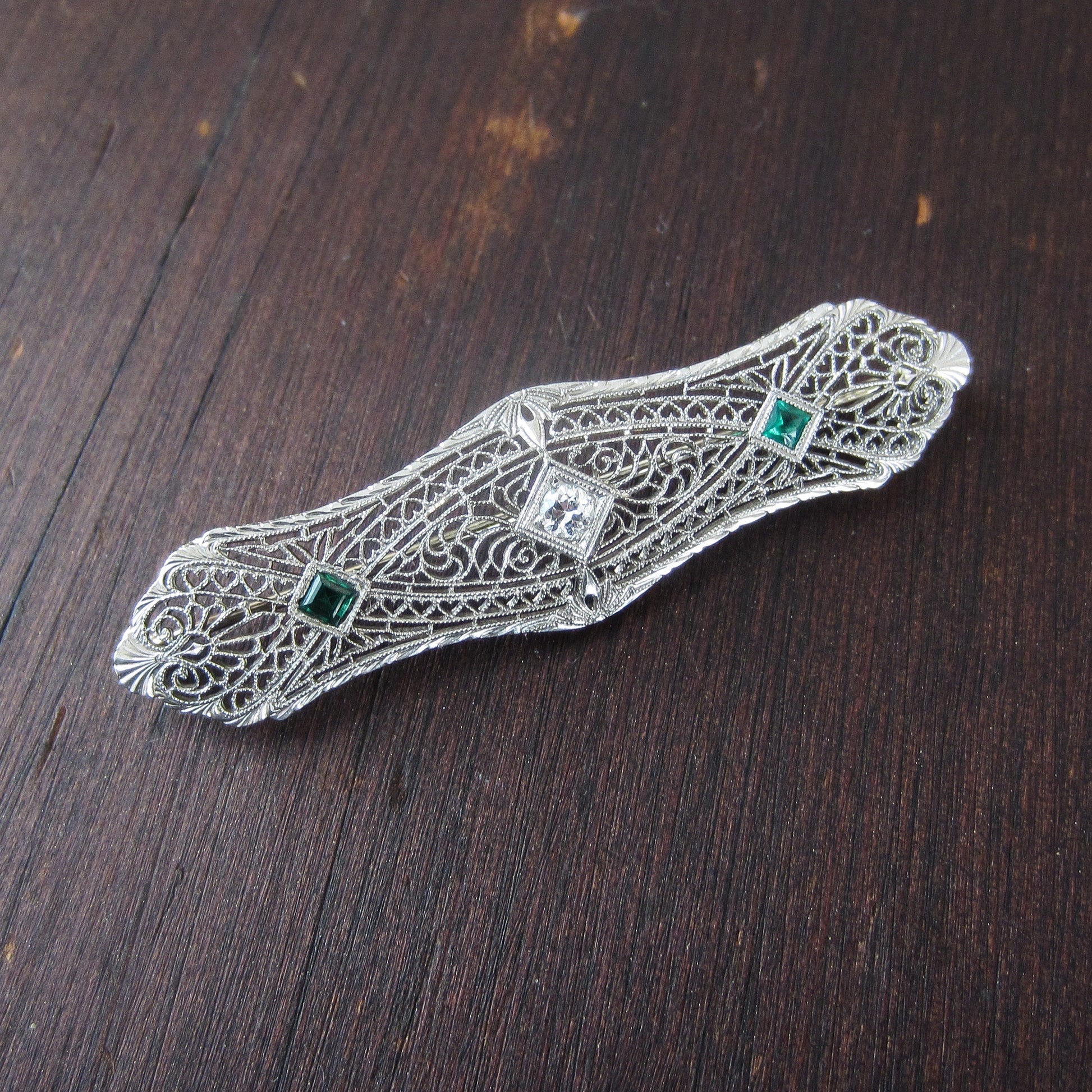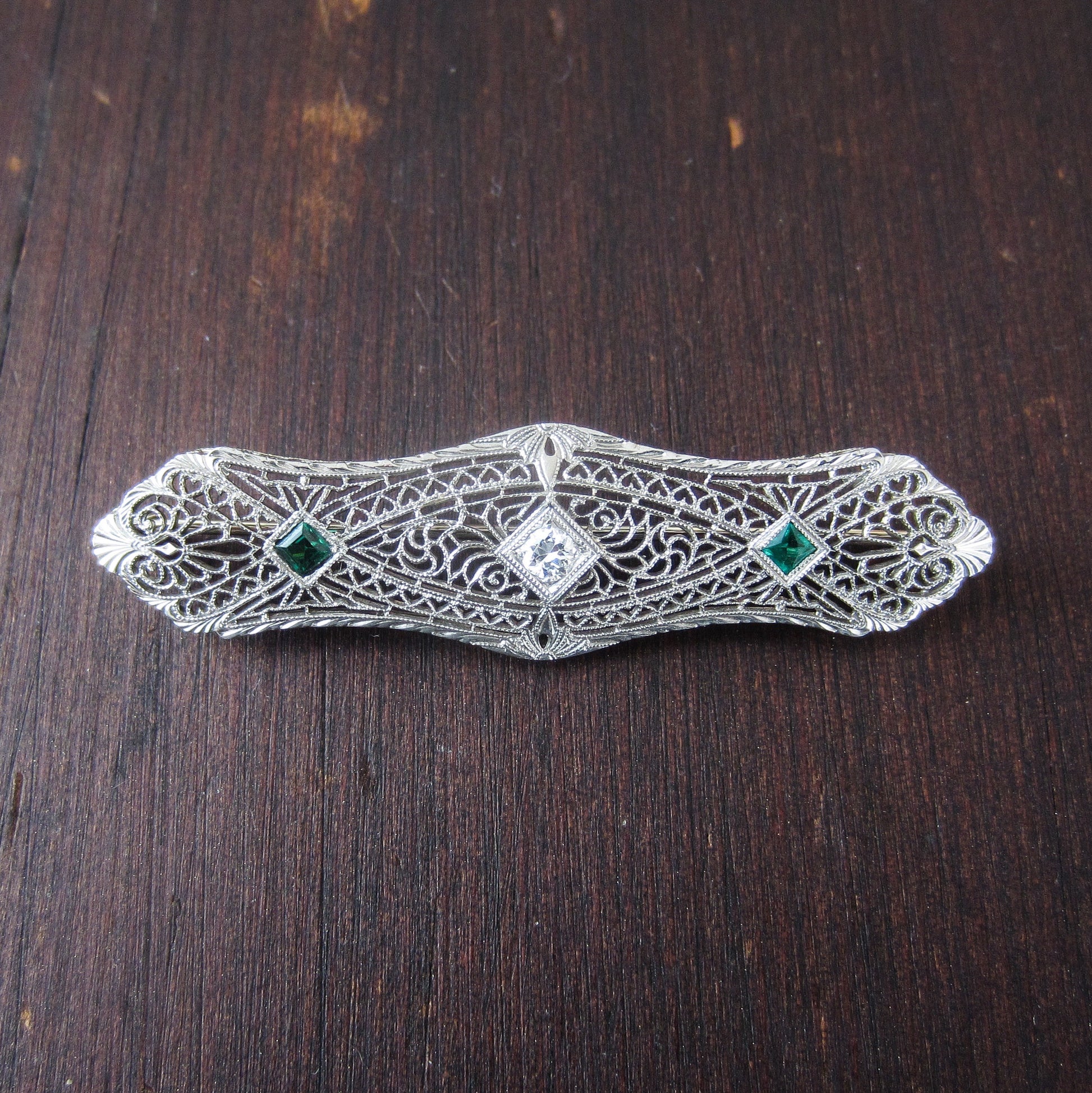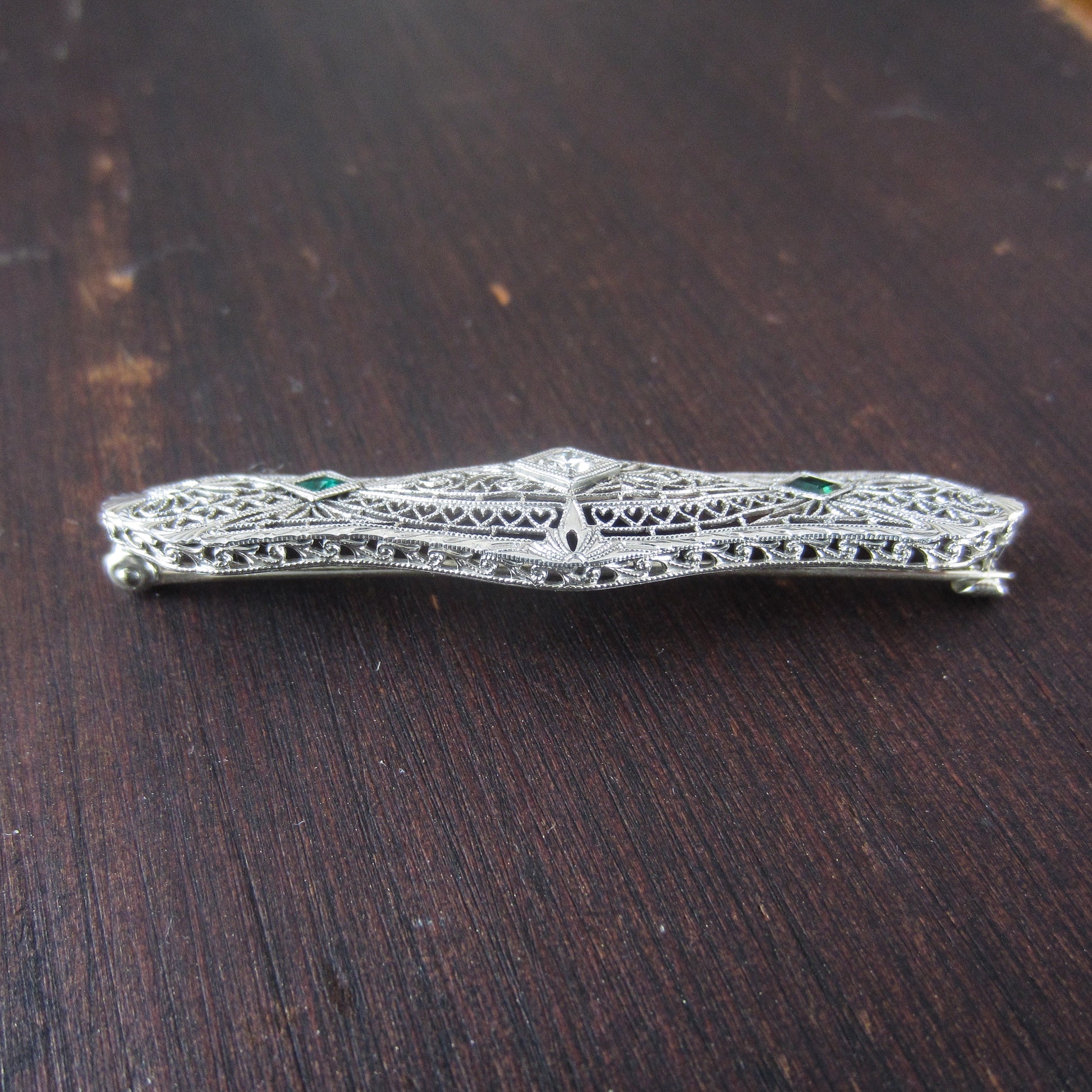 A beautifully made brooch dating to the late Edwardian/early Deco era circa 1920. Made by Brod & Co of Newark, NJ and centering an old brilliant cut diamond set in immaculate filigree with two square cut emerald simulants, which are typical for colored accent stones of the time period. Note that this brooch is detailed in 360 degrees, every edge and corner has been designed and decorated. And also note the little frame of filigree hearts! Just lovely and very wearable!