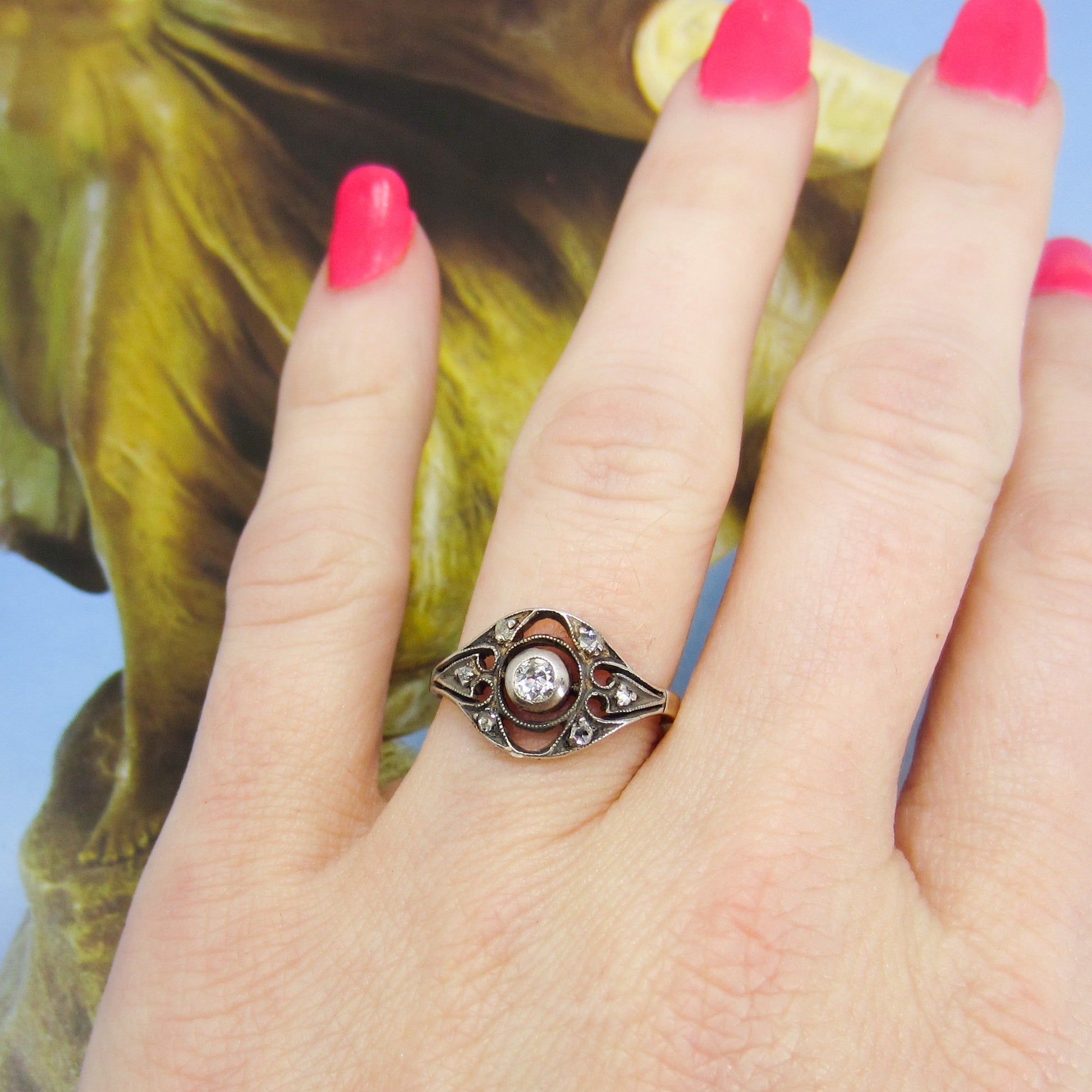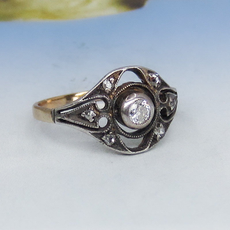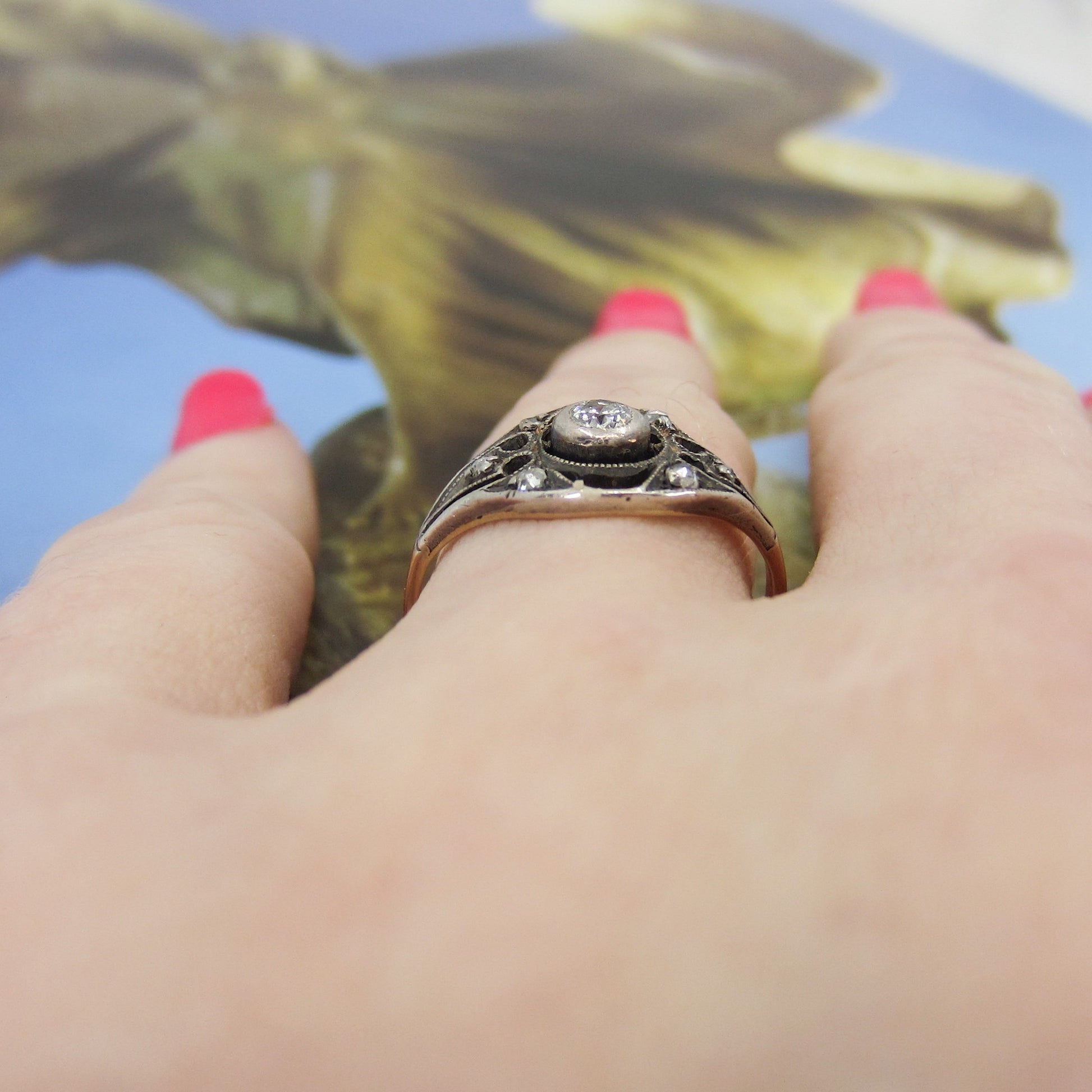 This beautiful little ring was made in Austria in the early 1900's and features a bezel set Old European Cut diamond set in a silver topped 14k gold mounting with little rose cut diamond accents. Hand-millegrained edges and sits nice and flat on the hand. Would make an amazing engagement ring!