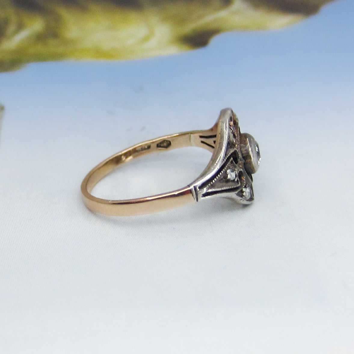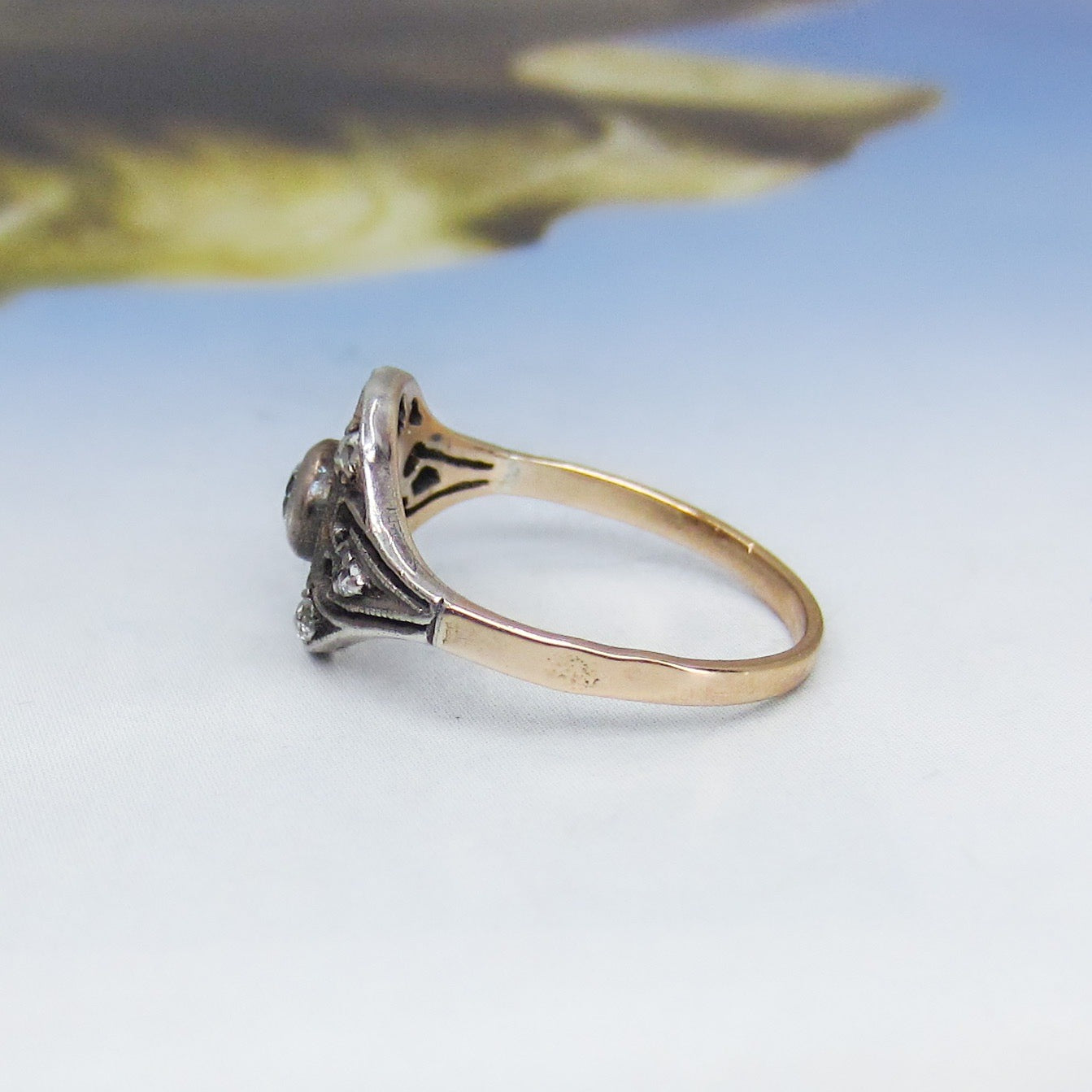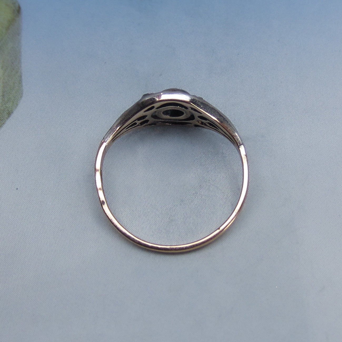 This beautiful little ring was made in Austria in the early 1900's and features a bezel set Old European Cut diamond set in a silver topped 14k gold mounting with little rose cut diamond accents. Hand-millegrained edges and sits nice and flat on the hand. Would make an amazing engagement ring!