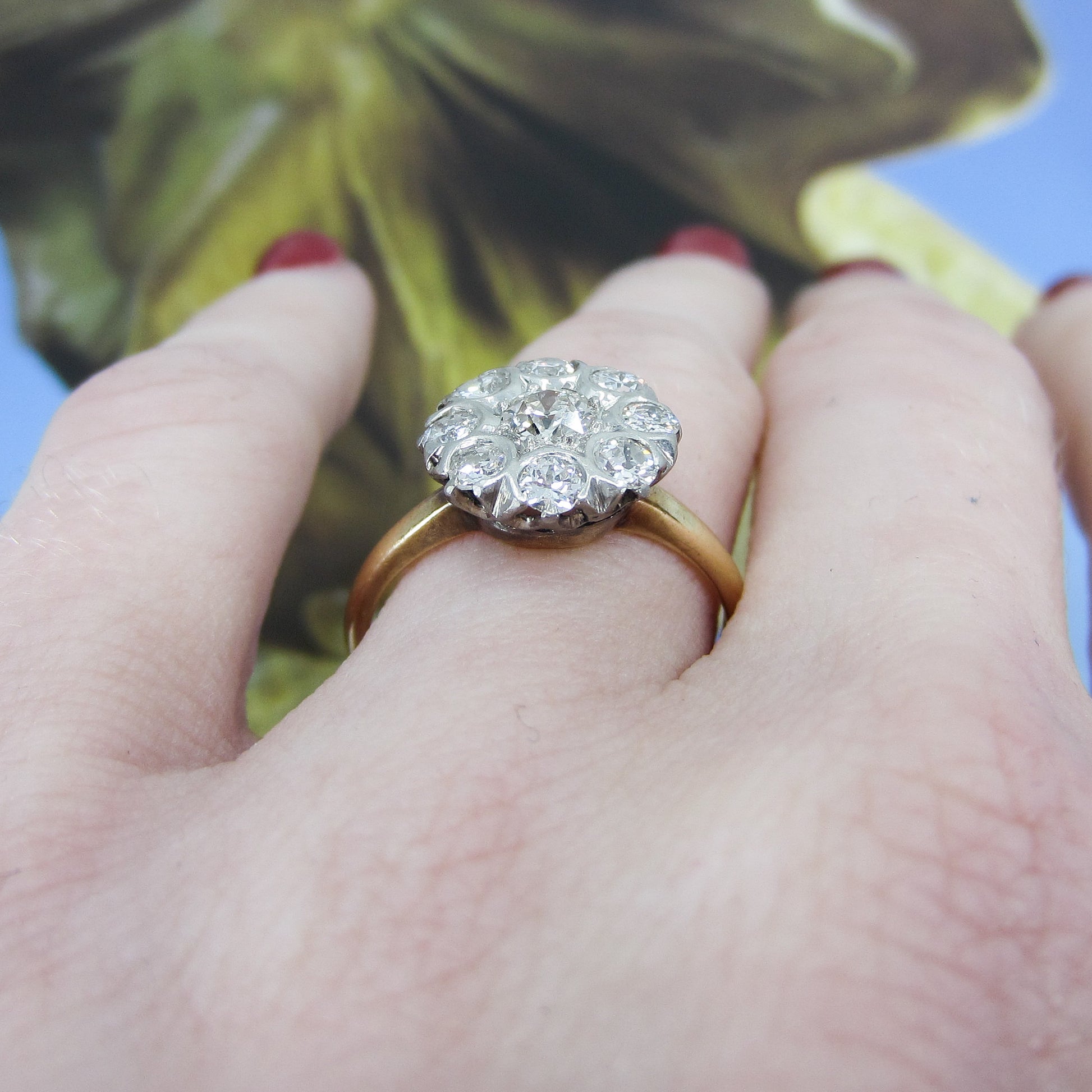 Here is another gorgeous old cut cluster ring that packs massive sparkle with into a delicate package! This Art Deco era ring, circa 1920, holds one Old European cut diamond center and eight old cut diamonds in the frame, weighing approximately .80ctw and set in a 14k white gold gallery with a 14k yellow gold band. These diamonds have everything you could want from an old cut--all the rainbow flashes and pillowy crowns you could possibly desire! The ring sits nice and low on the hand and is tough--tough enough to wear every day and not worry about it, despite it being over 100 years old! A perfect engagement ring for big sparkle and antique romance lovers!