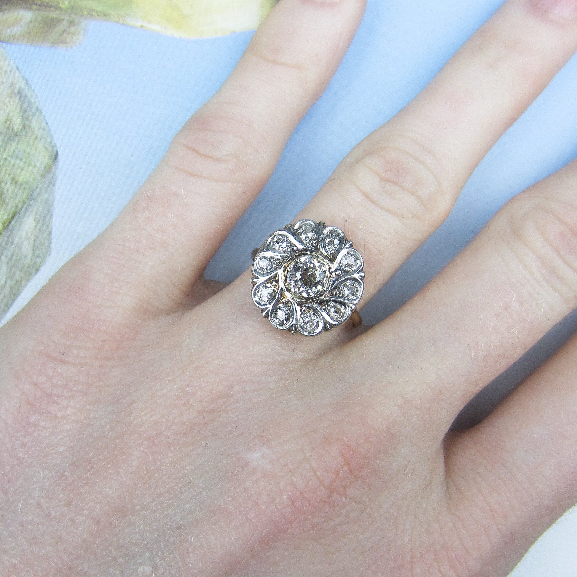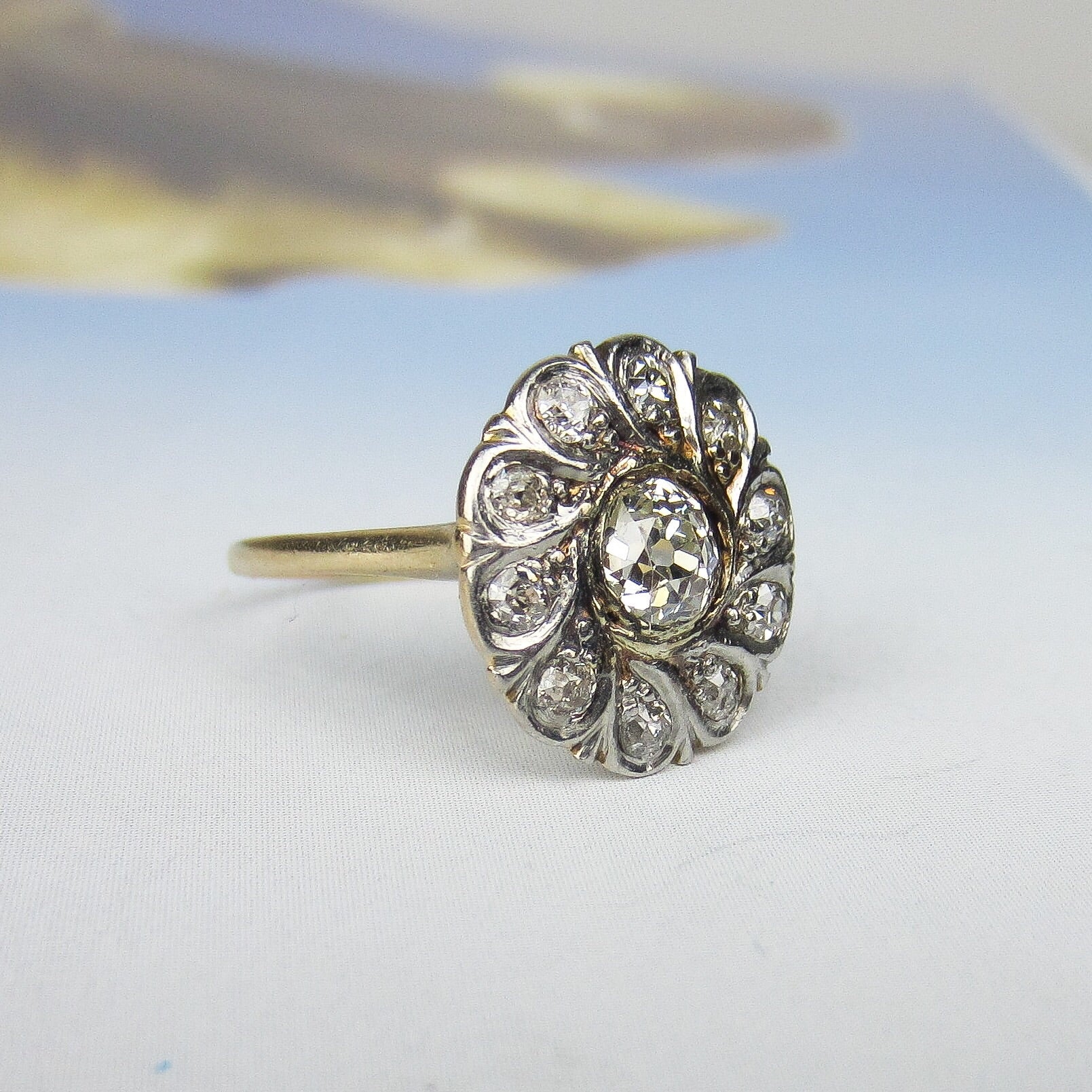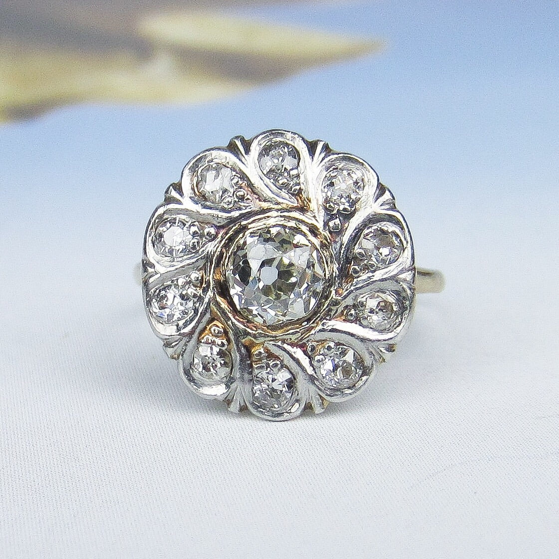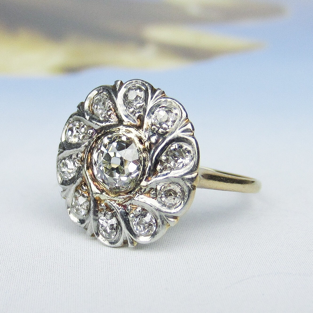 SOLD--Edwardian Old Mine Diamond Cluster Ring Platinum/14k c. 1910