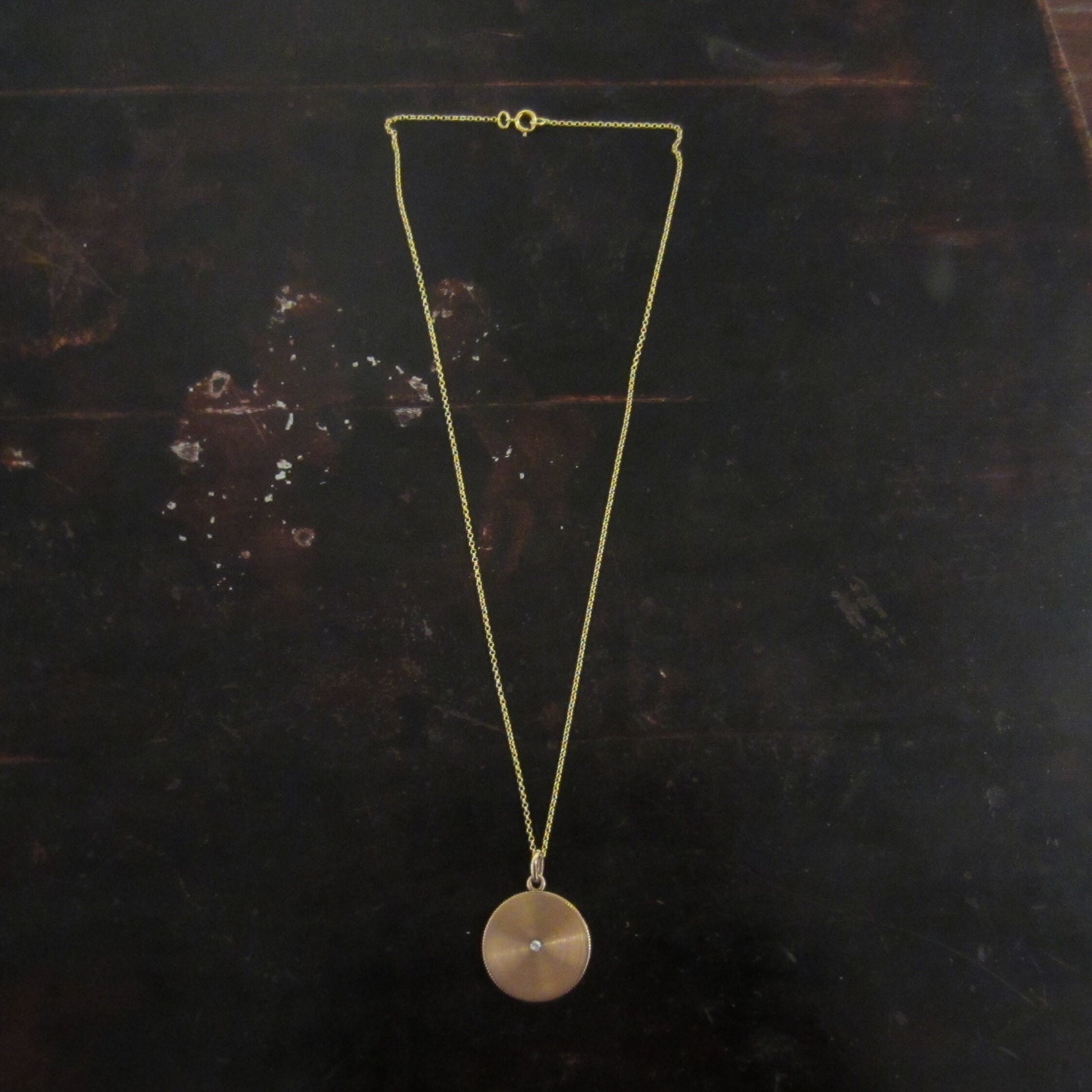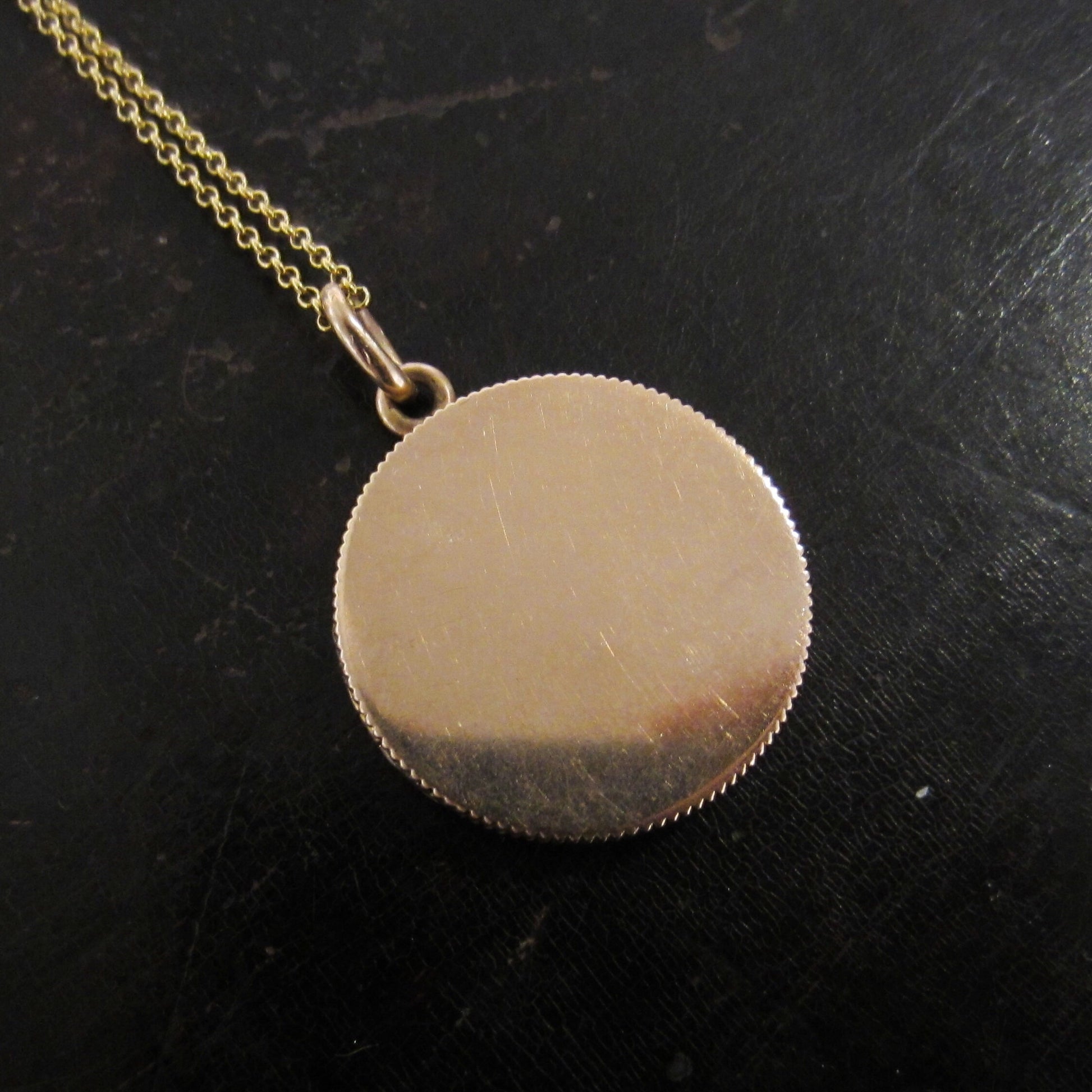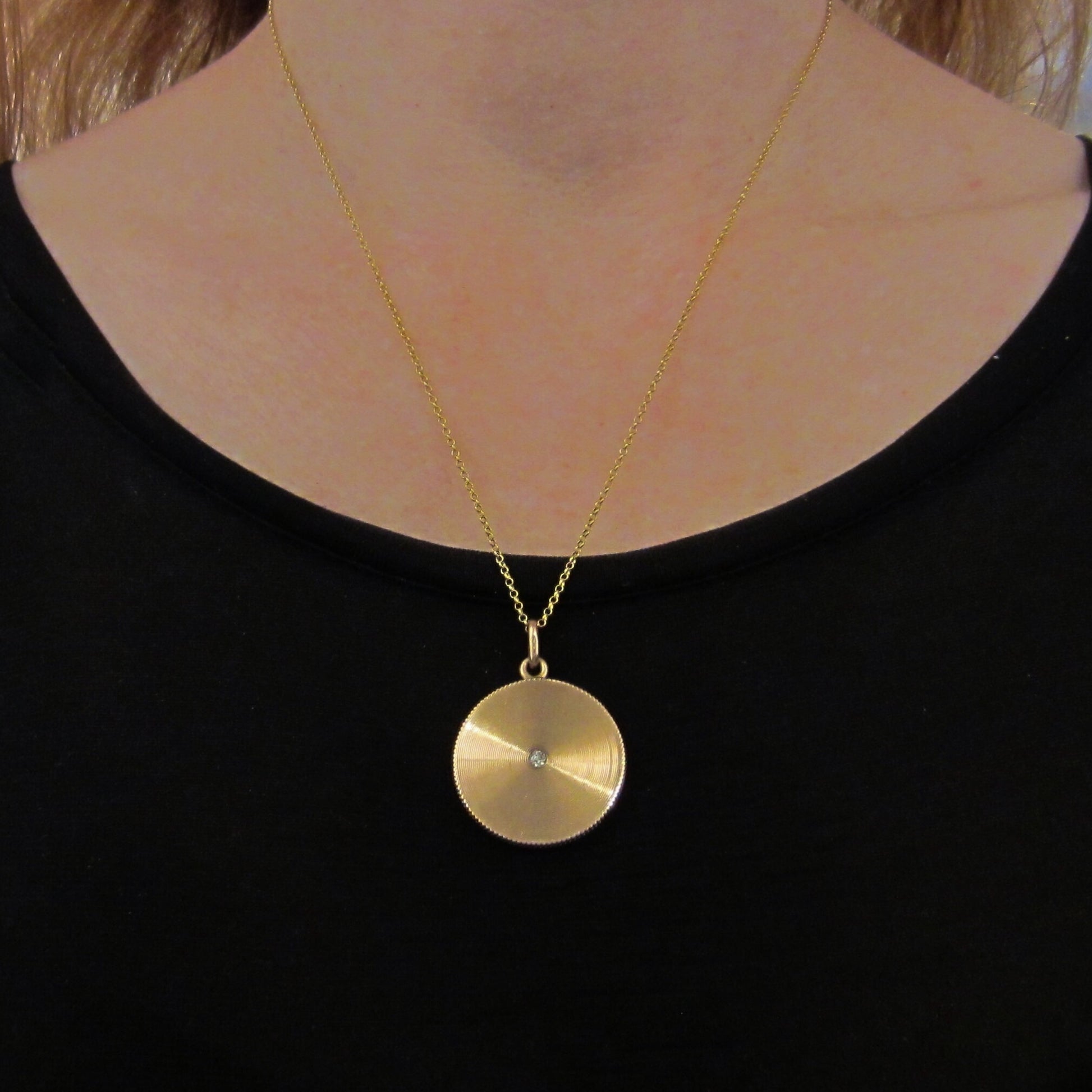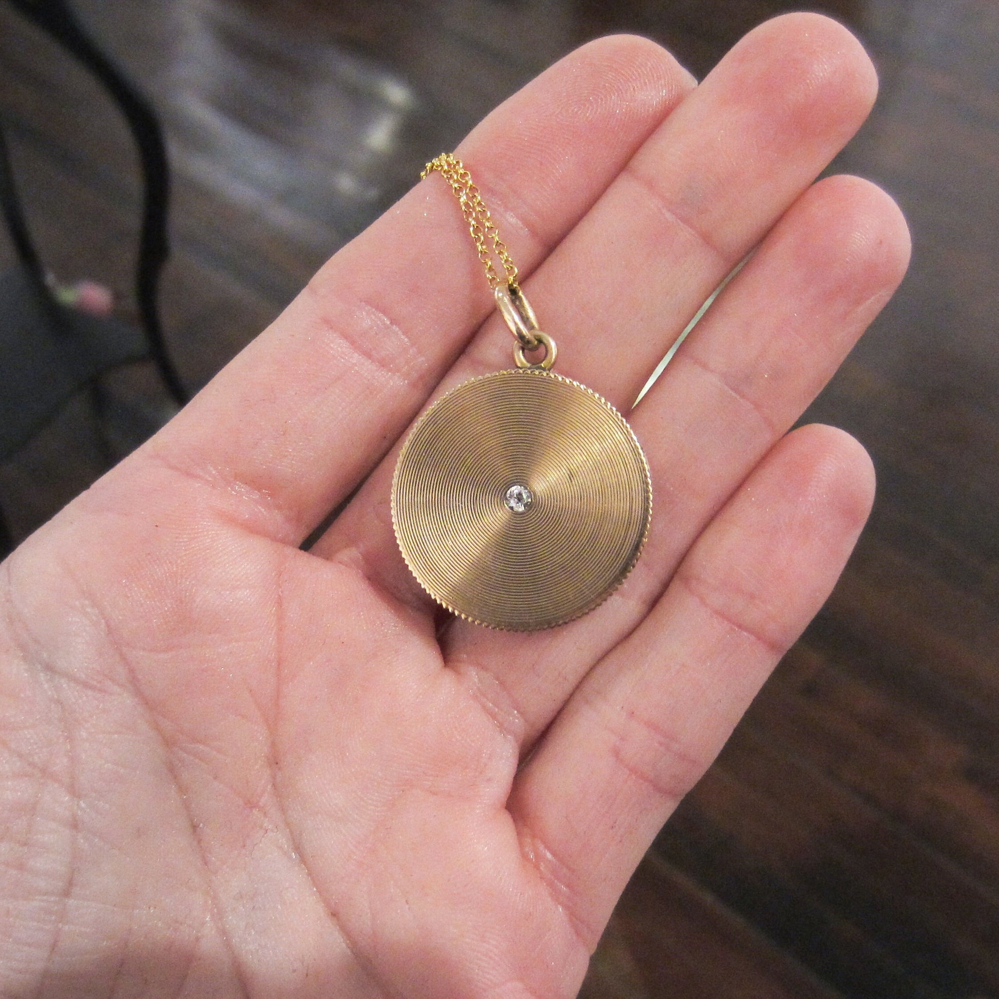 Everyone who sees this locket remarks how it looks like a vinyl record--and it does! This early Edwardian 10k rose gold locket is engine turned, creating an engraved surface of concentric circles that gives it its record-like texture. Central is a sweet little Old Mine cut diamond and the locket is finished off with a coin edge. The interior of the locket is also engine turned and comes complete with its original frame and celluloid. This locket photographed much more yellow than it is--it is very rose gold! This would make a great sentimental gift and can be worn every day!
