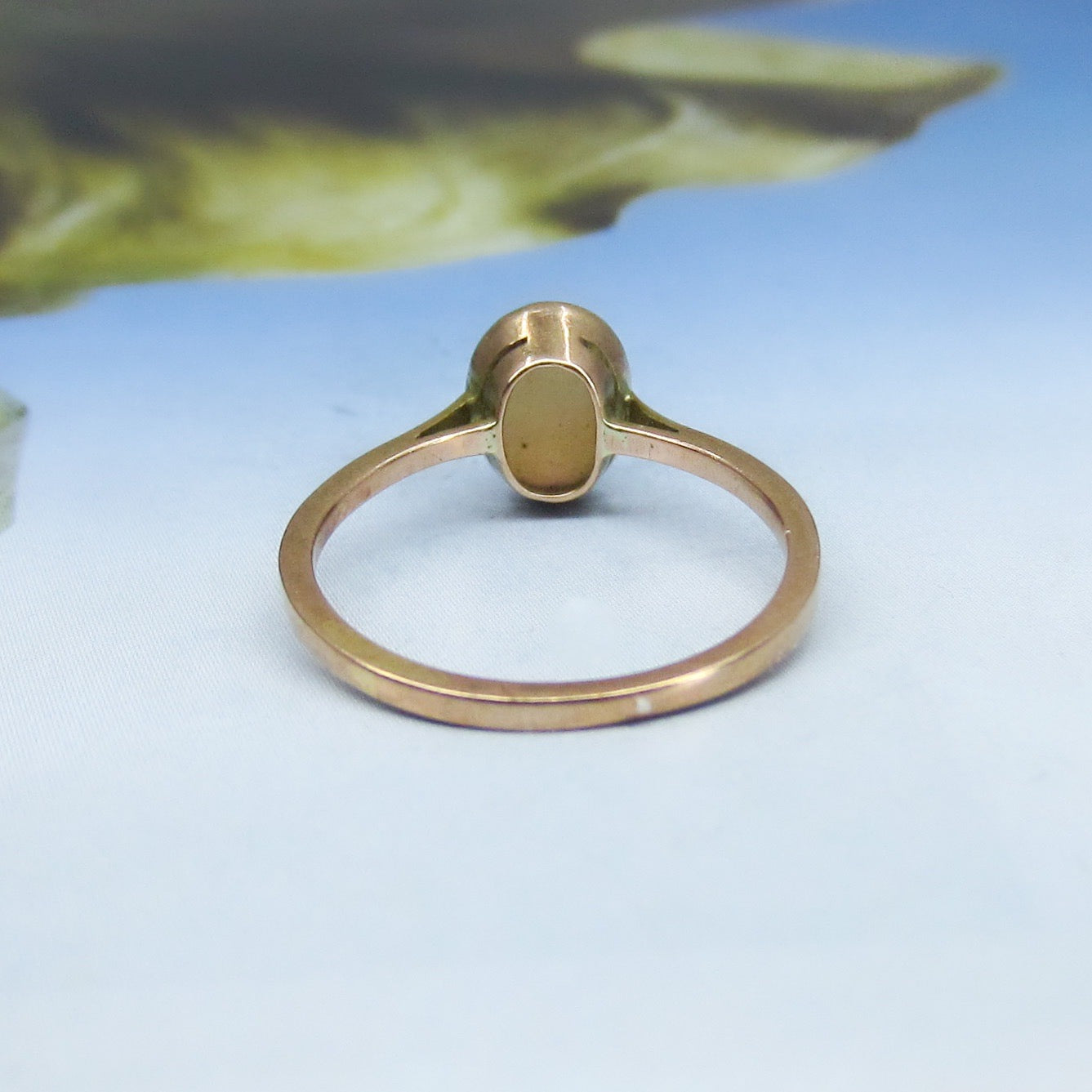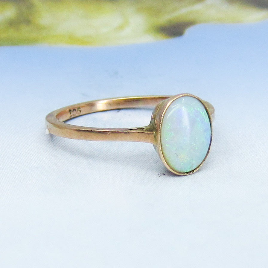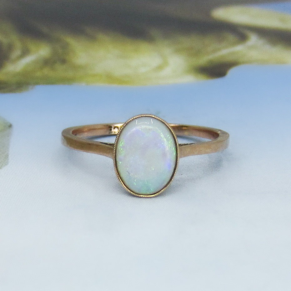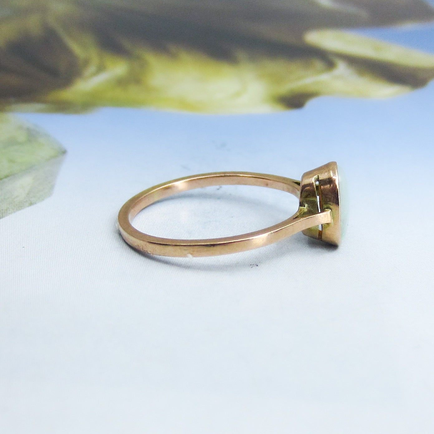 A classic late Victorian/early Edwardian ring featuring a light but lively cabochon opal set in rosy 9k gold. European c. 1900.
