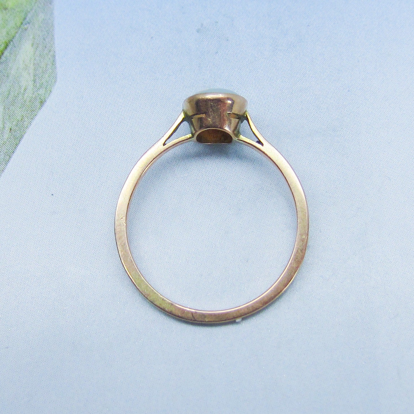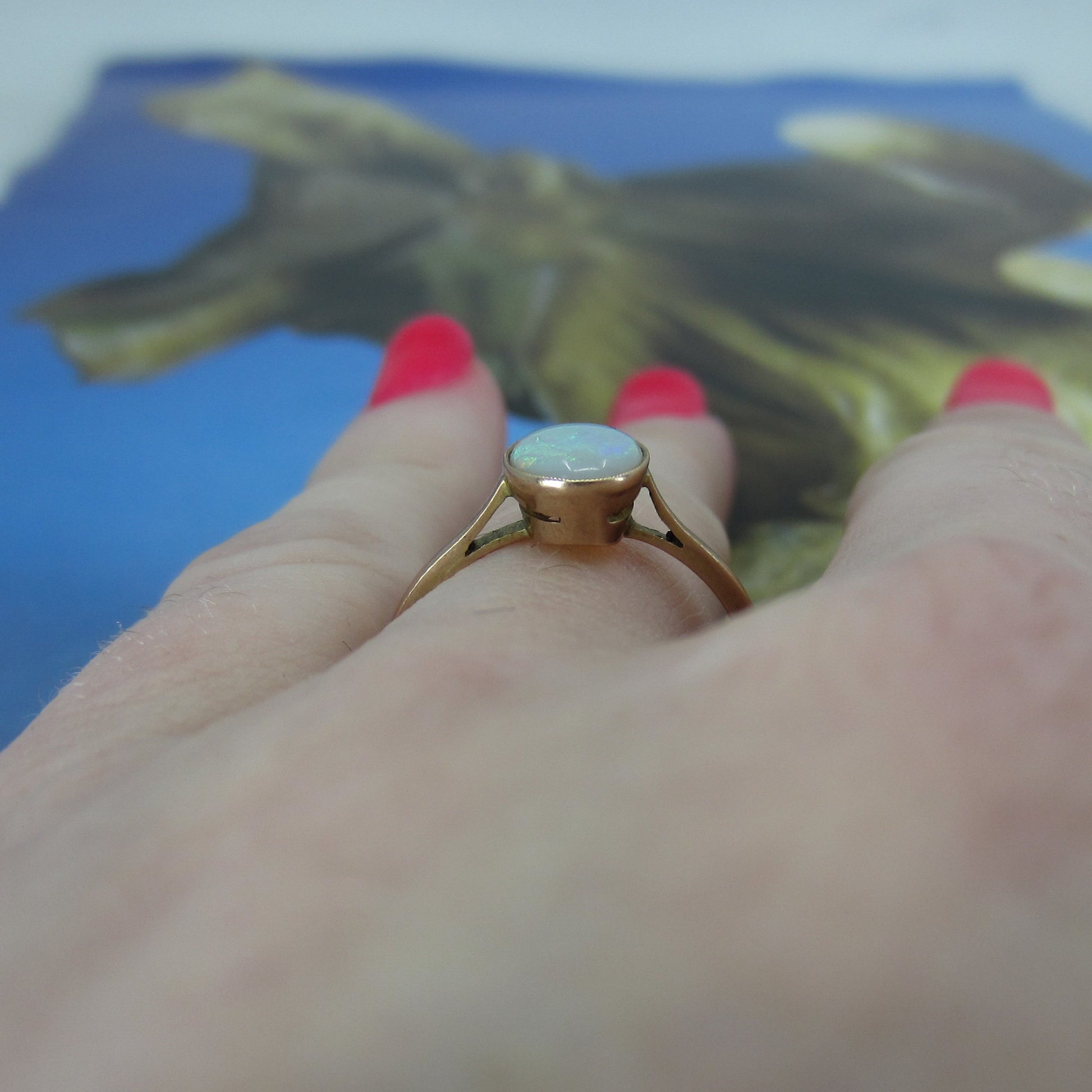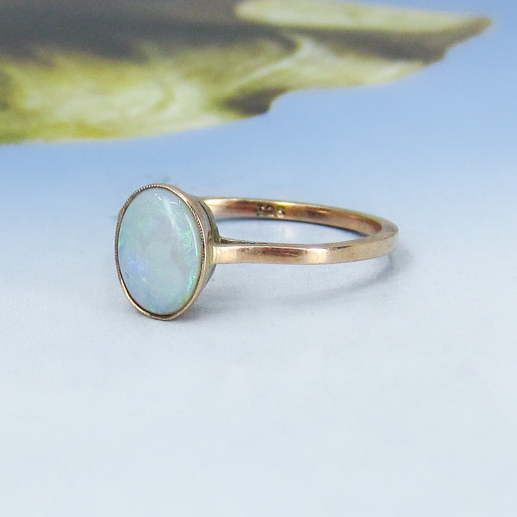A classic late Victorian/early Edwardian ring featuring a light but lively cabochon opal set in rosy 9k gold. European c. 1900.