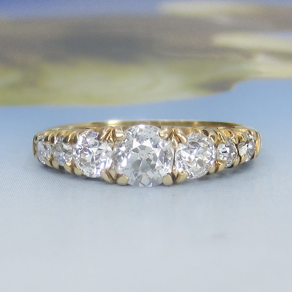 Contains seven natural Old European cut diamonds weighing approximately 1.40ctw (center diamond weighs approximately .60ct) with F-G Color and VS2 Clarity.