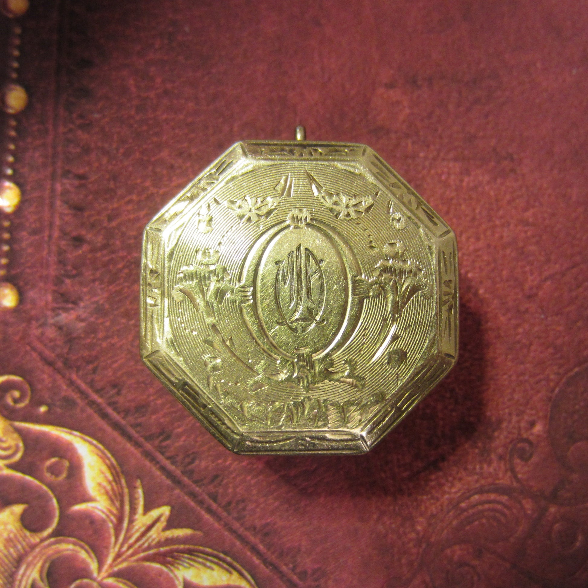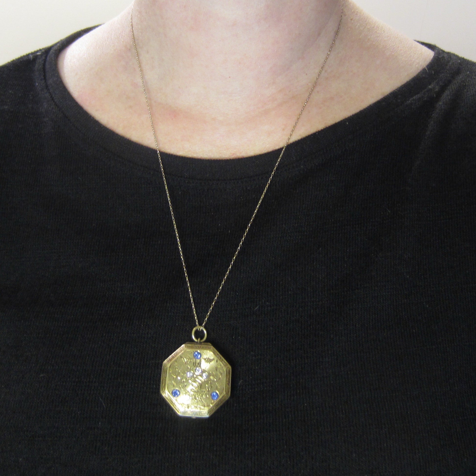 Own a piece of jewelry history with this rare Edwardian era mirrored pill box of 14k made by Tiffany & Co circa 1910. The face of the piece has a hand-engraved basket holding three old cut diamonds surrounded by a laurel wreath and three inset sapphires. The sides have a wavy guilloche engraved textured and the reverse a monogram of "MJA" in a frame. It is just lovely and is even lovelier under magnification where you can see all the precise, perfect work that Tiffany of that time is known for. Inside there is a small, curved mirror that has a very wide field of view so you can see your entire face easily! Wear it like a pendant, put your favorite keepsake in it and enjoy having such a special jewel in your collection!