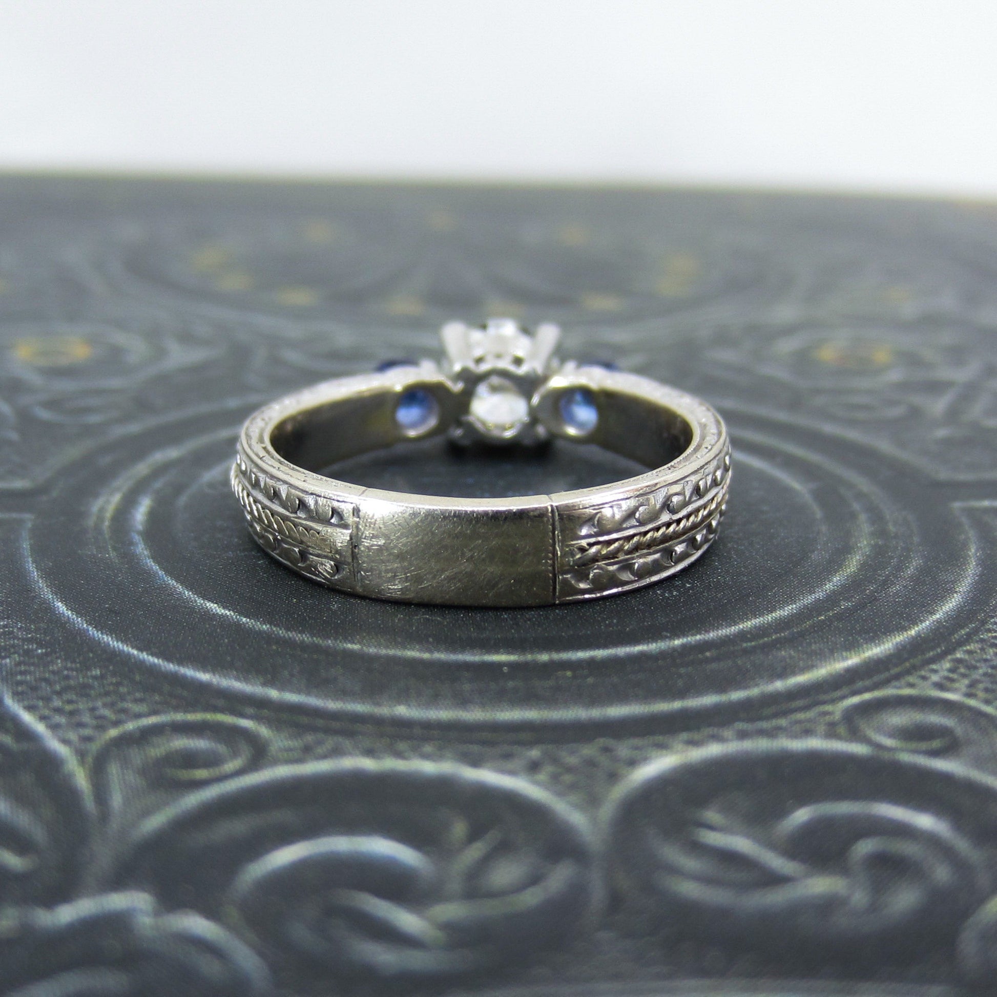 A romantic estate ring made in platinum and 18k white gold with a central natural Round Brilliant Cut diamond weighing approximately .84ct with H-I Color and VS2 Clarity, set between two natural round cut sapphires weighing approximately .20ct each with brilliant blue color. The setting is weighty and has lots of Art Deco style details throughout. This diamond faces up beautifully and is as bright and sparkly as can be! This ring is ready for its new home and it stacks perfectly flush with a band.