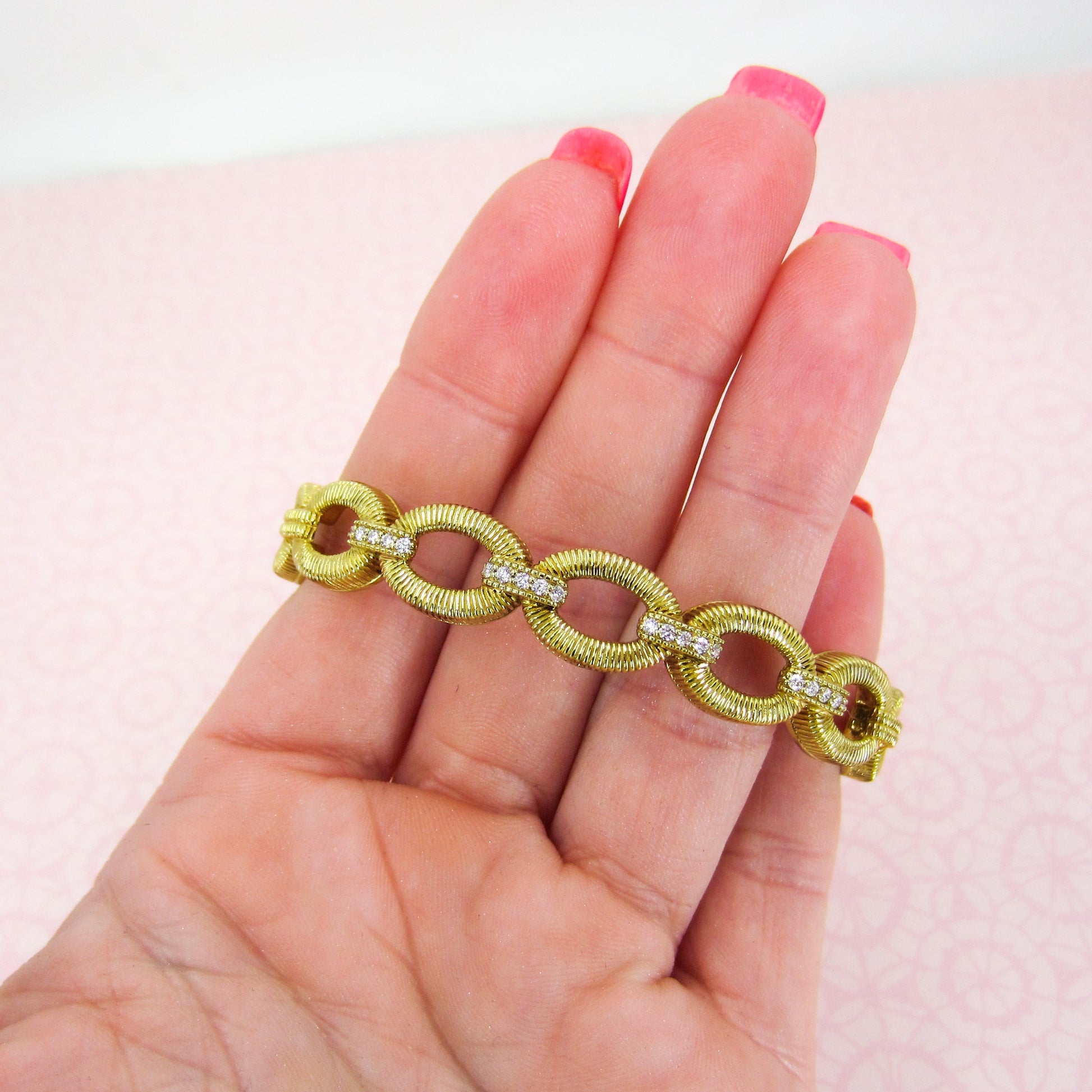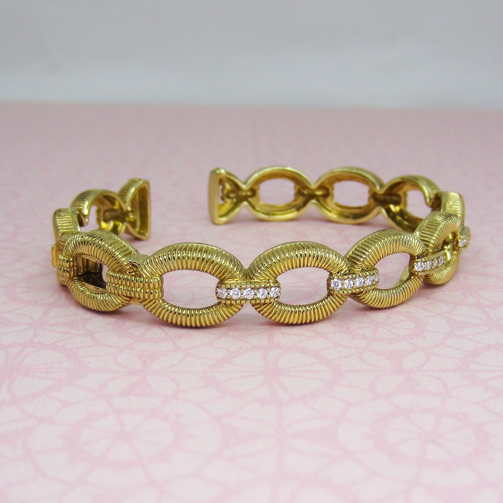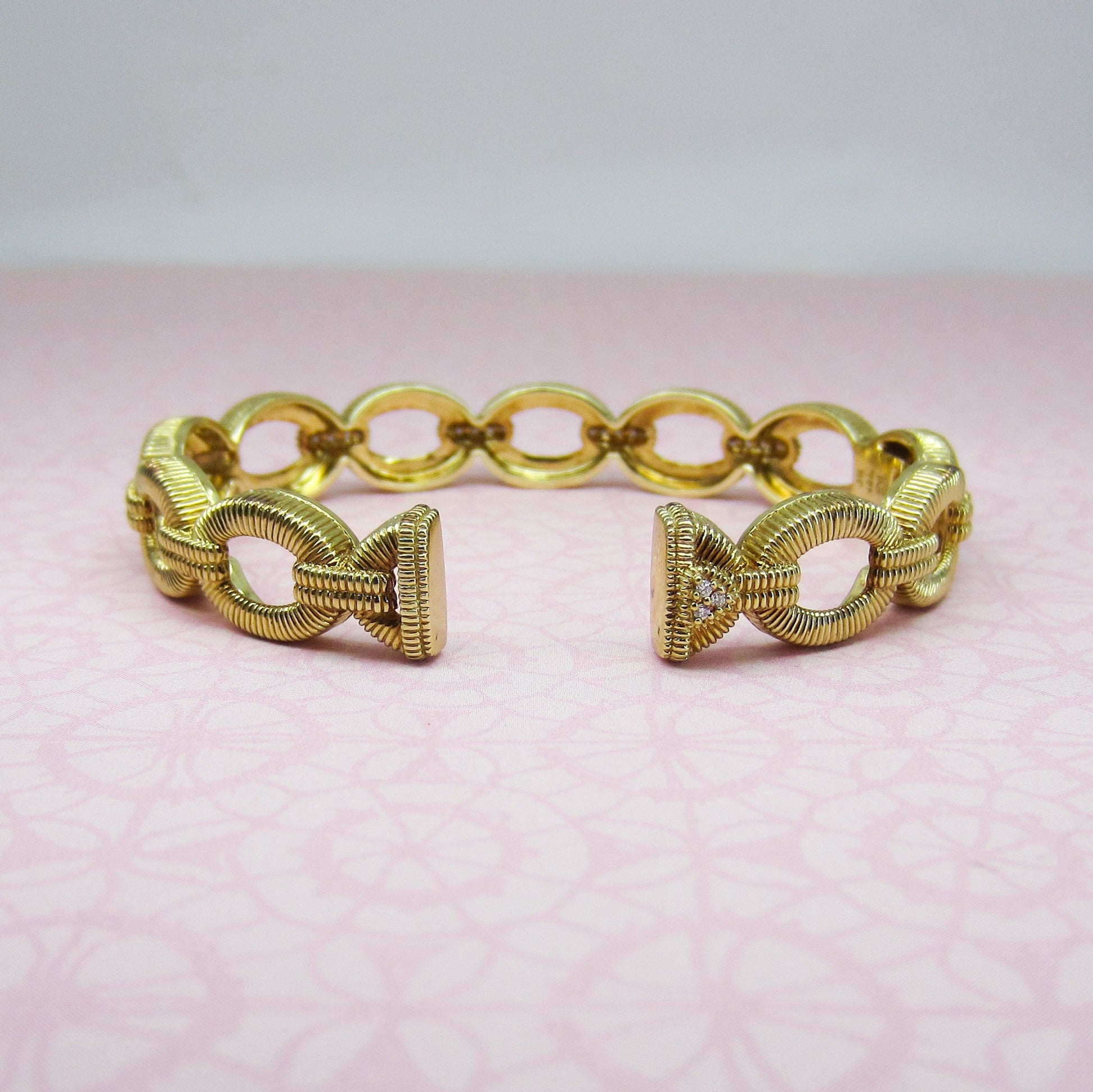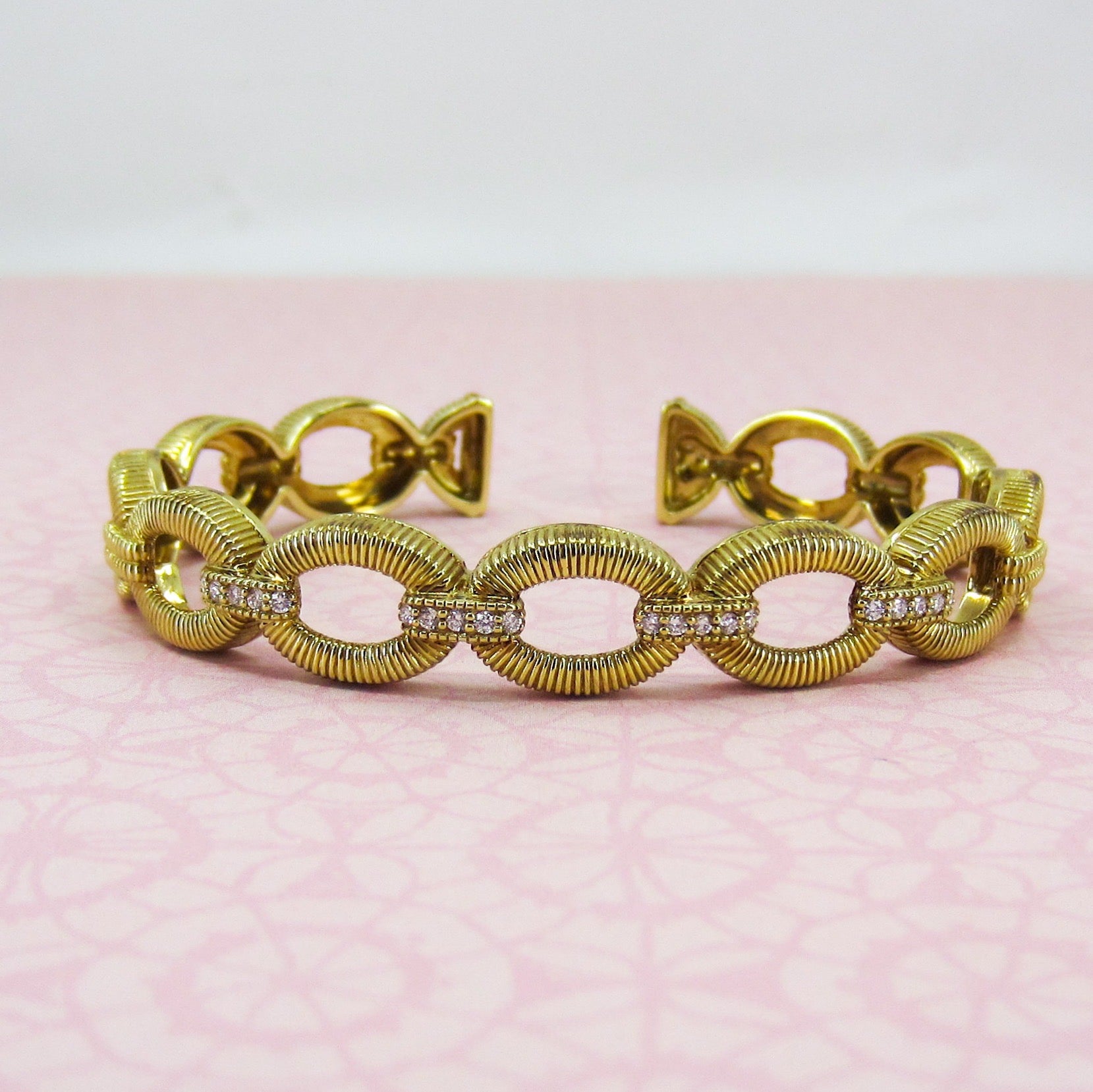 This is one of my favorite pieces we have in the store right now, it is so pretty and wearable and feminine! Made by Judith Ripka, this 18k yellow gold cuff consists of textured ovals with diamond set connectors. Hinged at the end so it is easy to put on, so nice. This bracelet is much more gorgeous than my photographs could capture and is sure to become your everyday tastefully chic bracelet! Comes with original Judith Ripka box and dust bag.