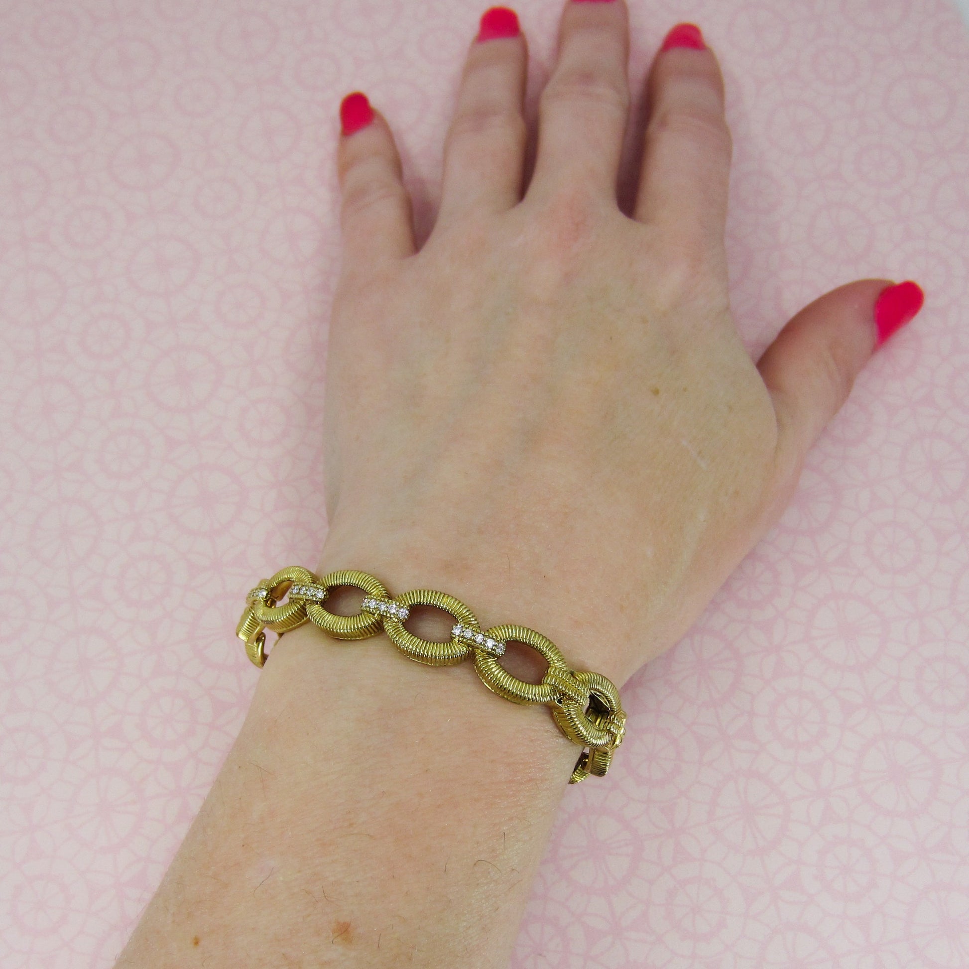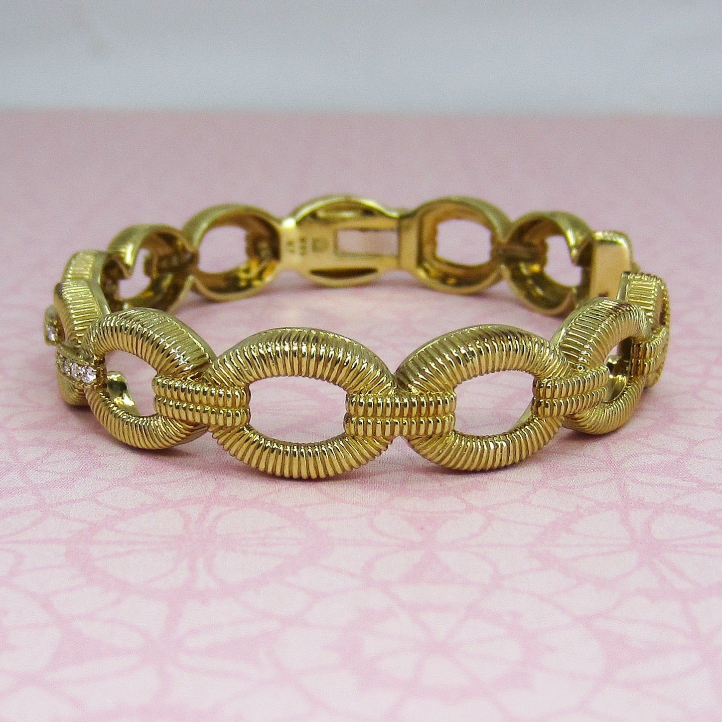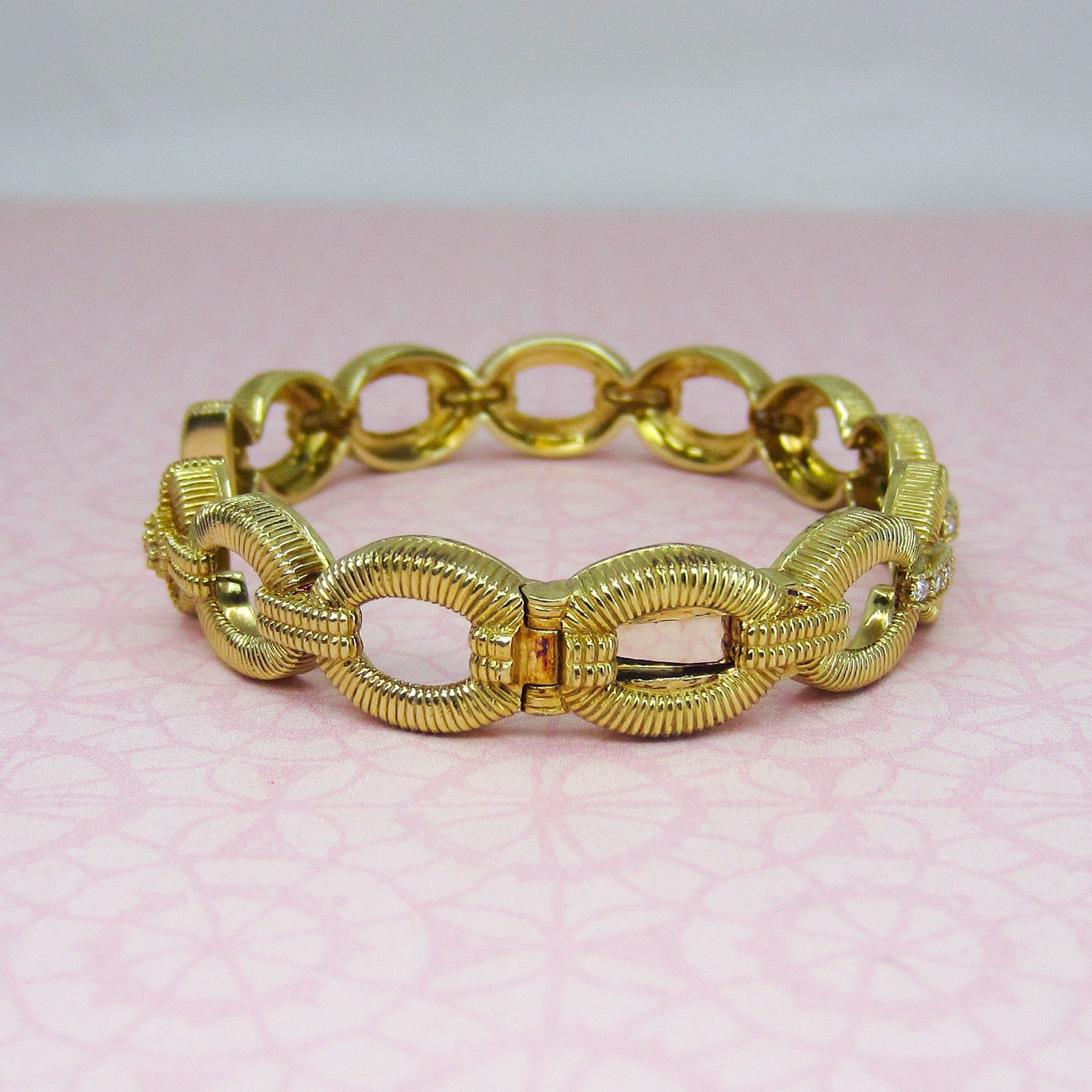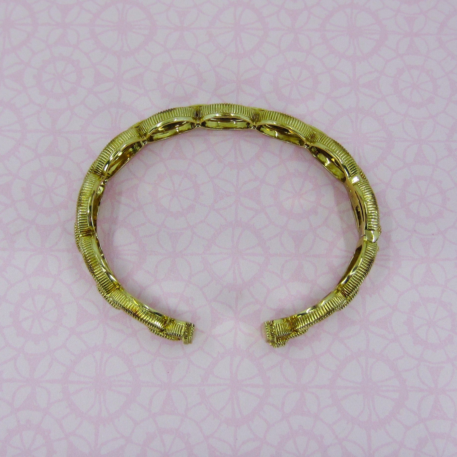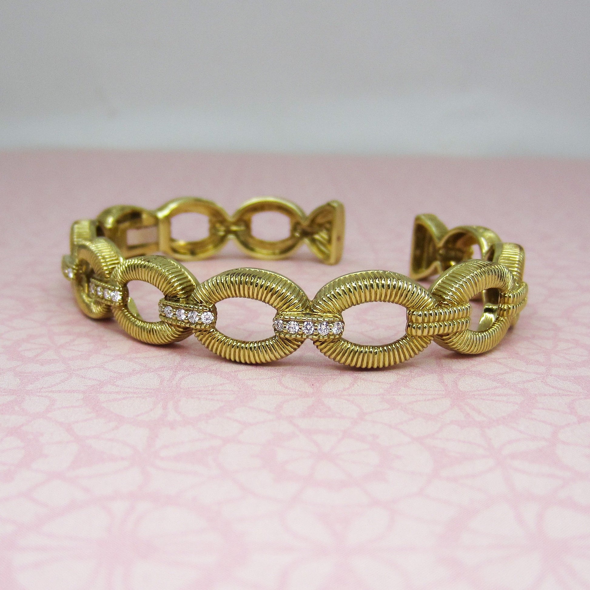 This is one of my favorite pieces we have in the store right now, it is so pretty and wearable and feminine! Made by Judith Ripka, this 18k yellow gold cuff consists of textured ovals with diamond set connectors. Hinged at the end so it is easy to put on, so nice. This bracelet is much more gorgeous than my photographs could capture and is sure to become your everyday tastefully chic bracelet! Comes with original Judith Ripka box and dust bag.