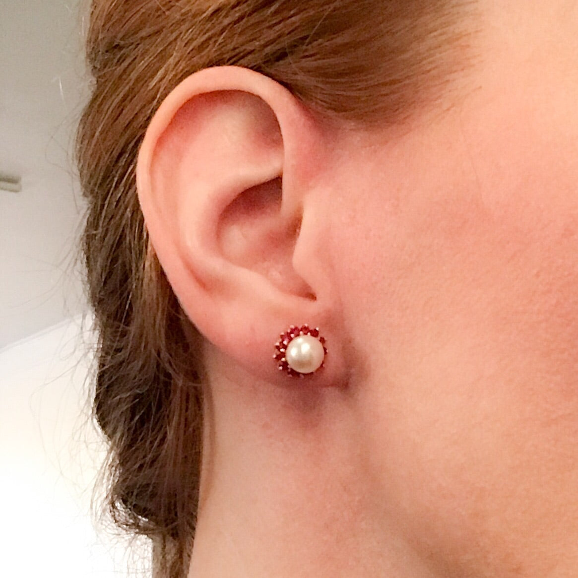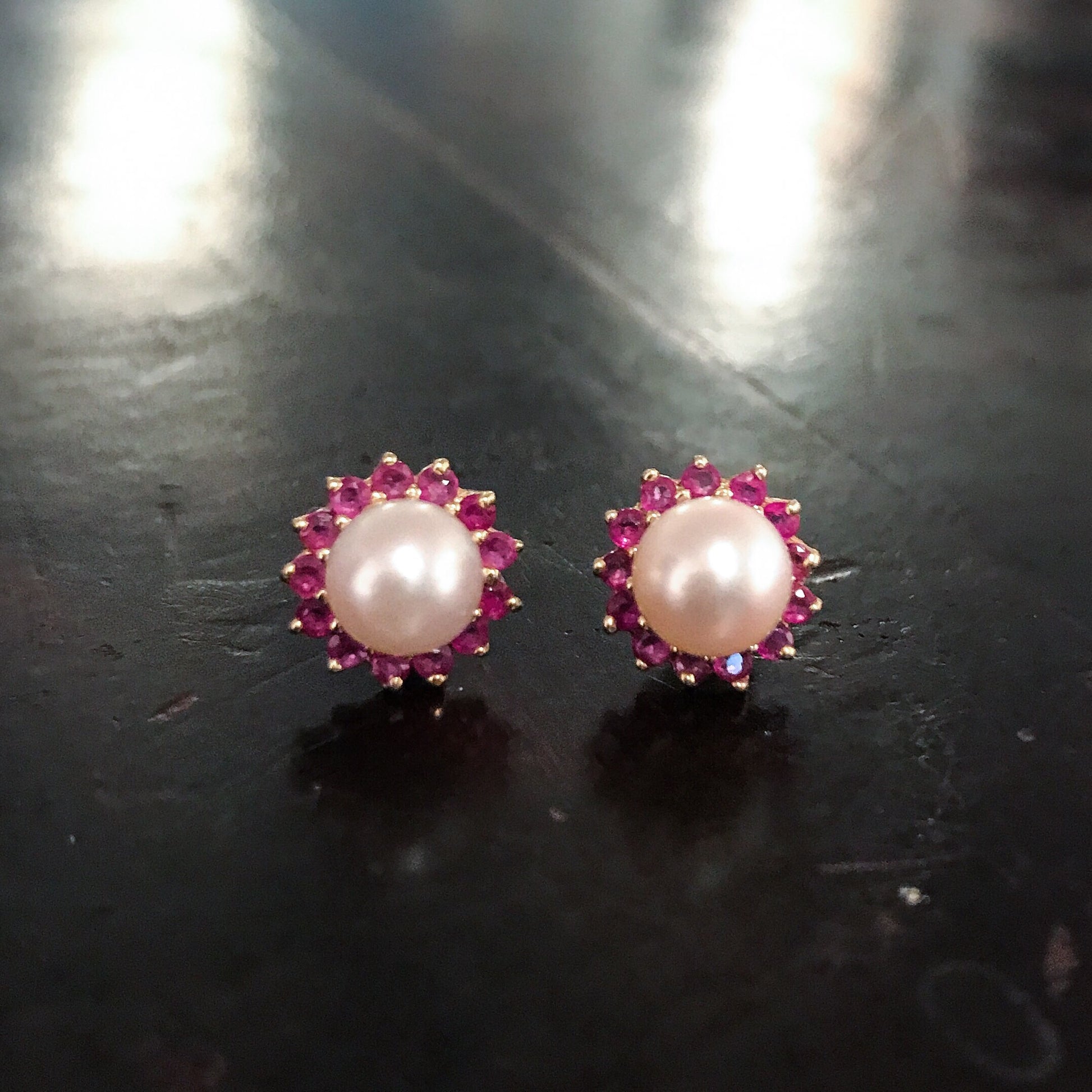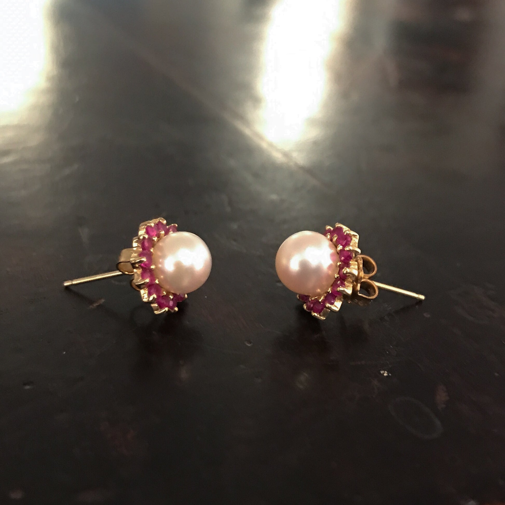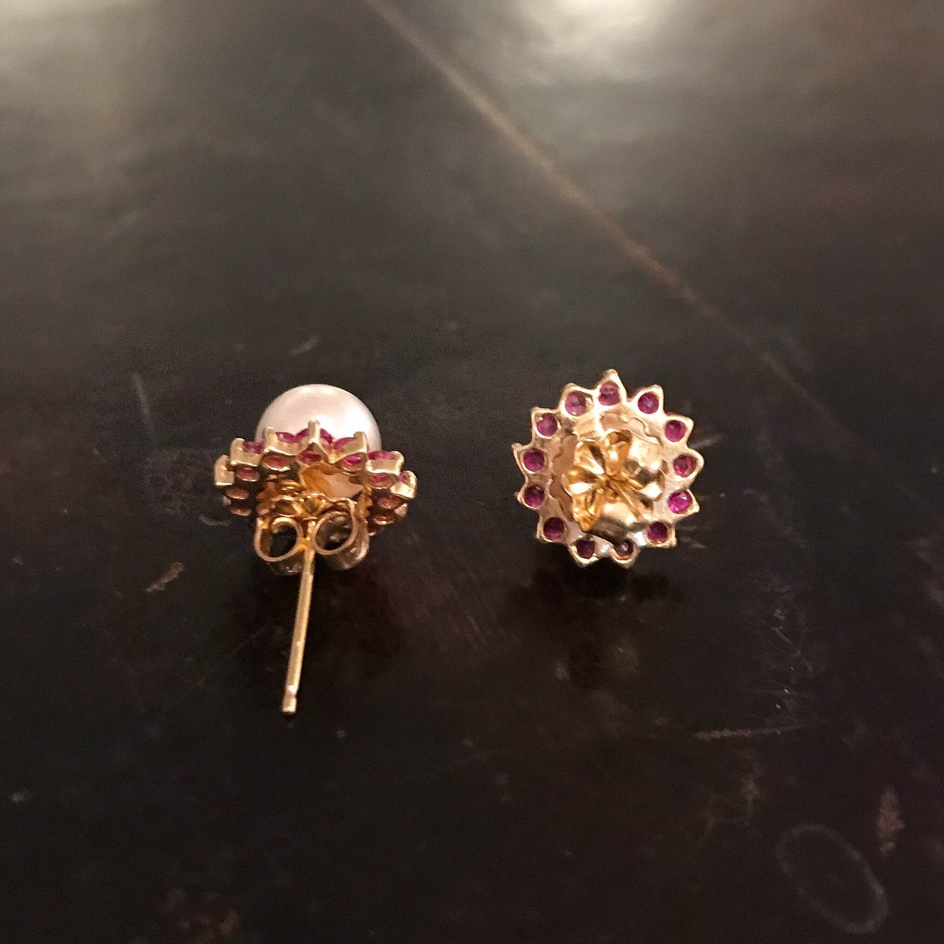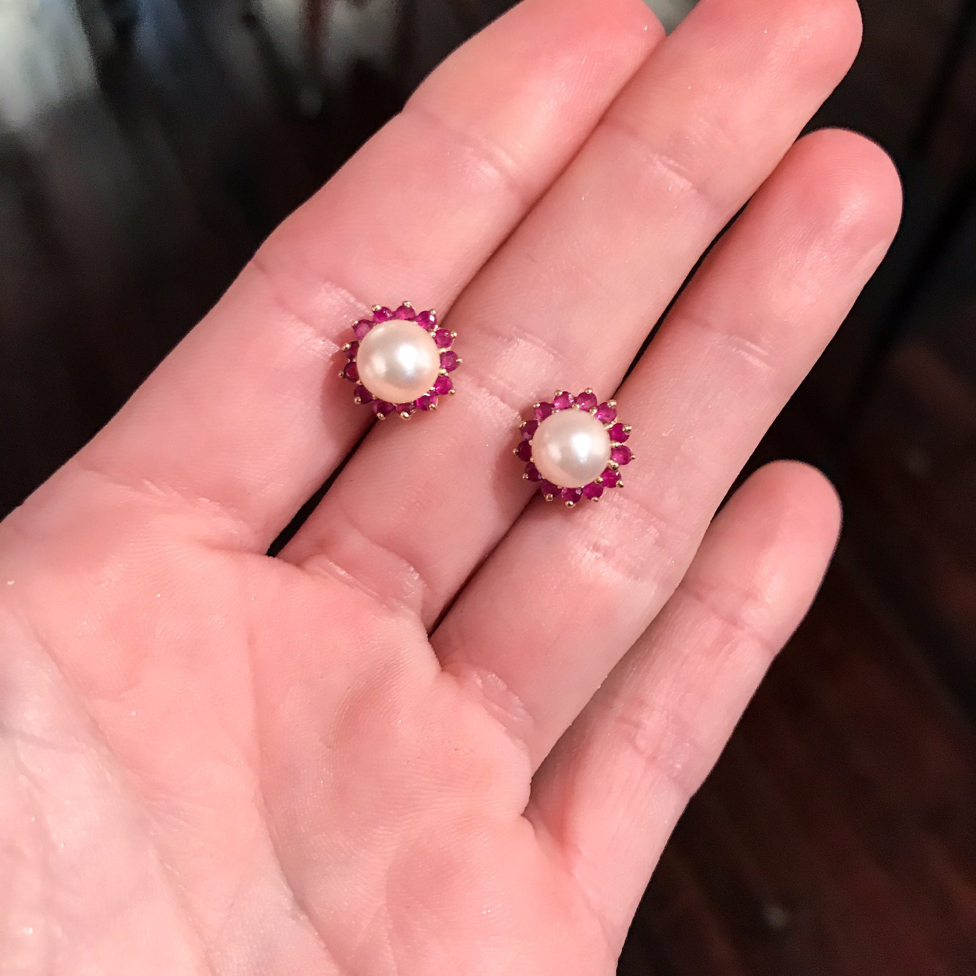 This classic pair of cultured pearl and ruby earrings would make a great gift! They would make a great self-gift too! These earrings feature two light ivory cultured pearls surrounded by thirteen natural round cut rubies (each, twenty six rubies total) in 14k yellow gold. Both the pearls and the gold photographed a tad more rosy than they are in person.
