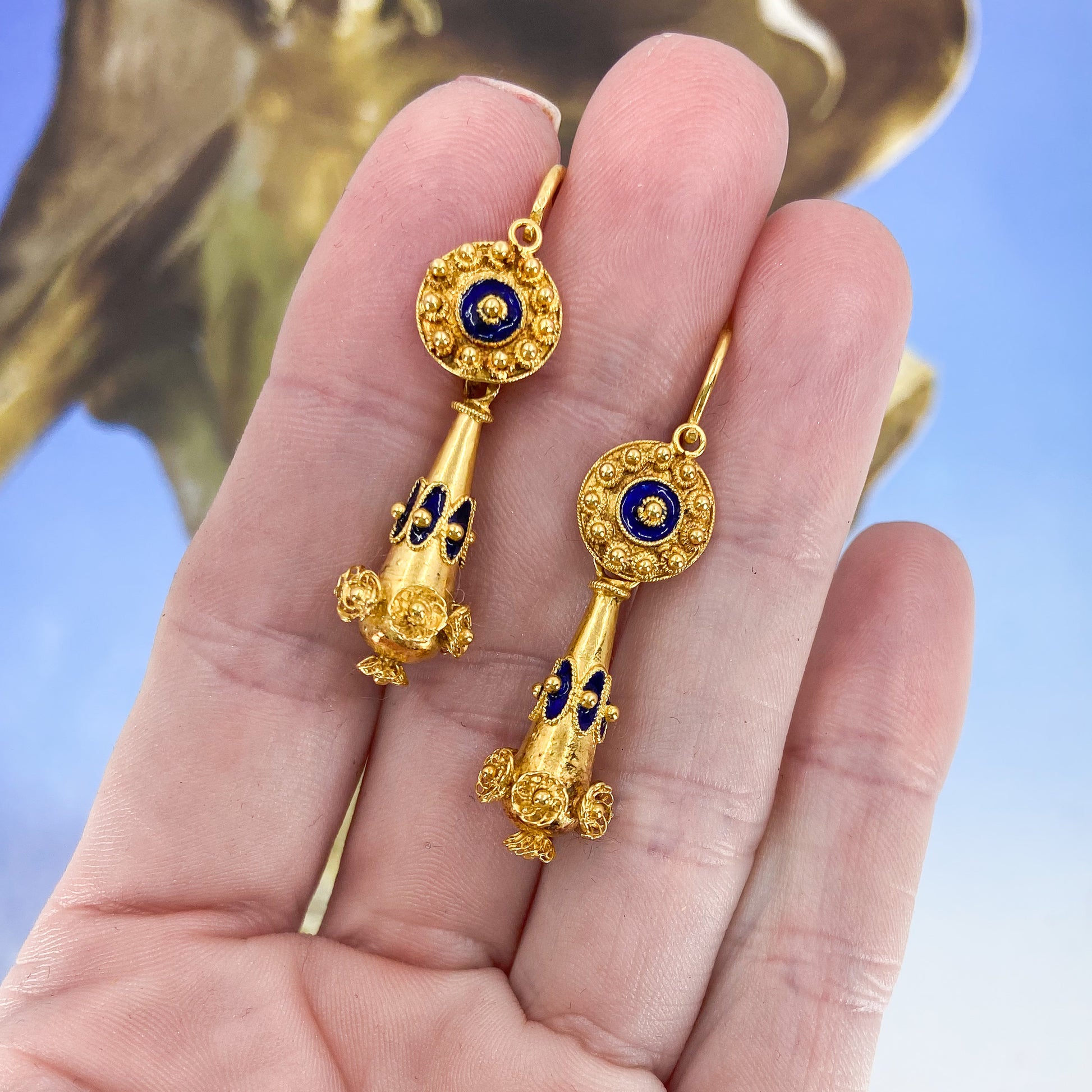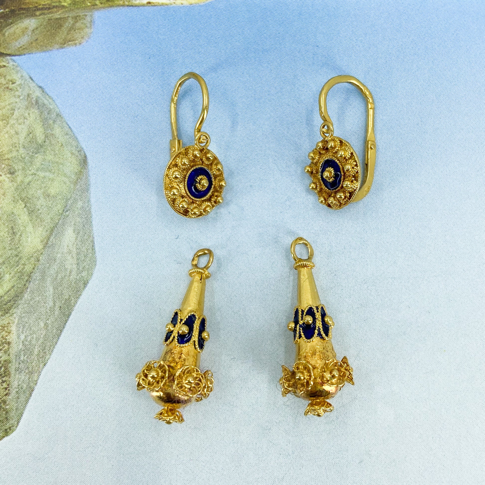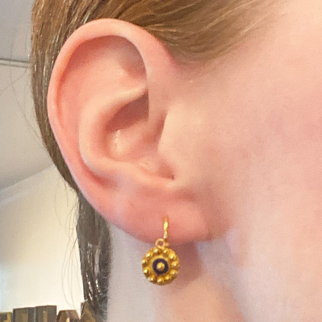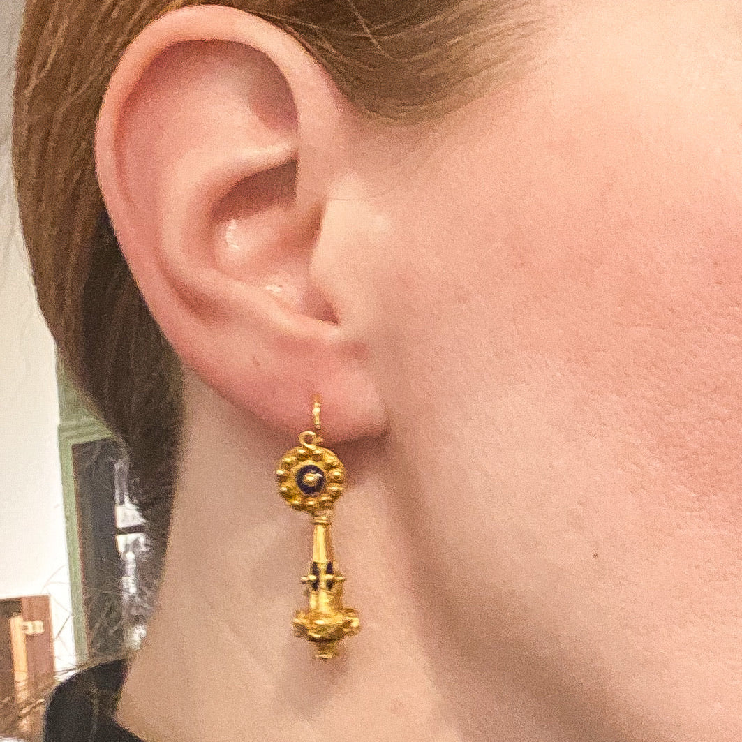 Look at these beauties! If you couldn't tell by now, I love a beautiful pair of day/night earrings because you get two earrings in one! These Mid-Century circa 1950's Victorian Revival earrings were made in Portugal with the Portuguese gold standard of 19.2k, so you get that really lush and vibrant gold color that is so reminiscent of Victorian pieces of similar design--and it really pops against the traditional cobalt blue enamel accents. Wear the drop for a swingy, more antique look or unhook the drop and wear just the top as your go-to everyday pair!