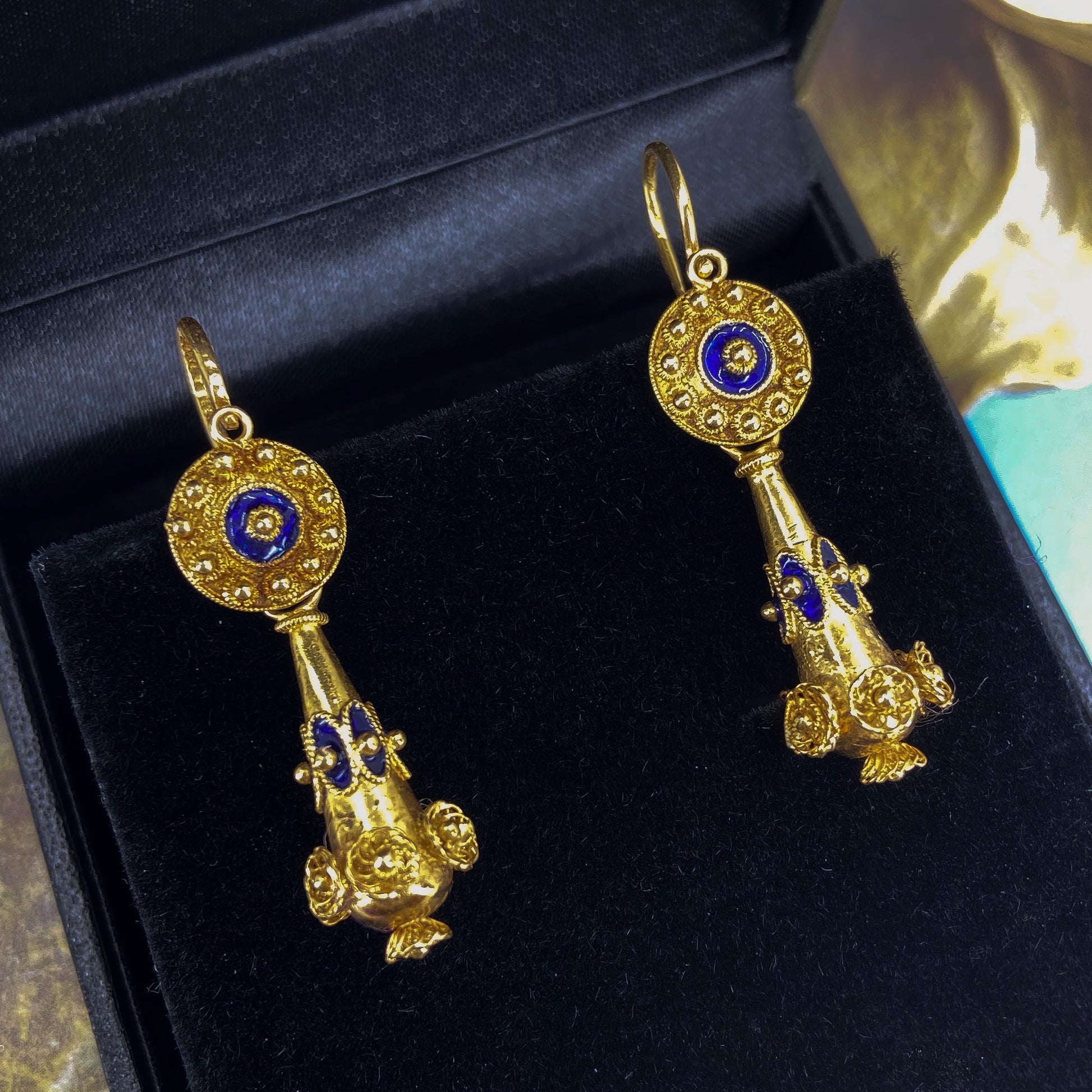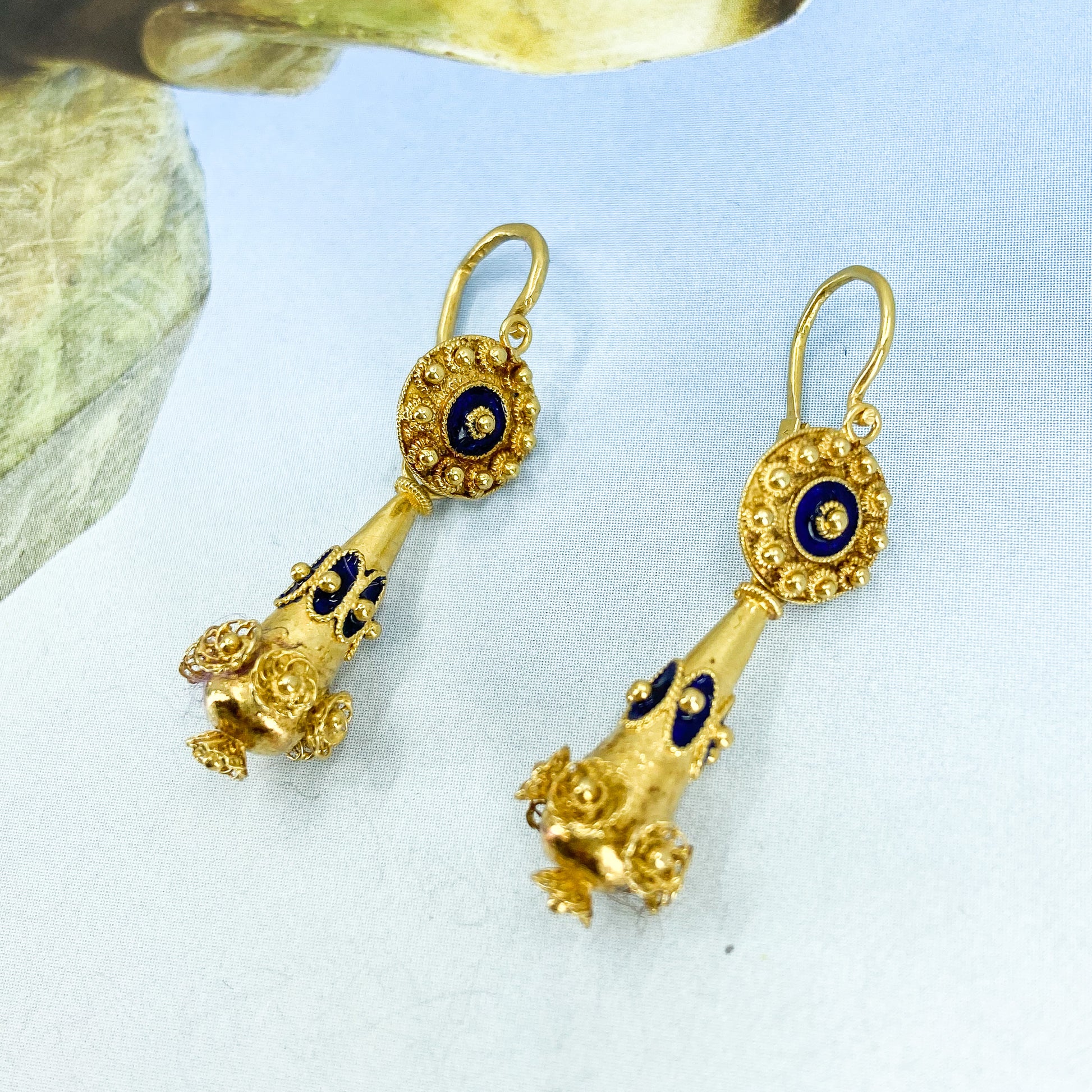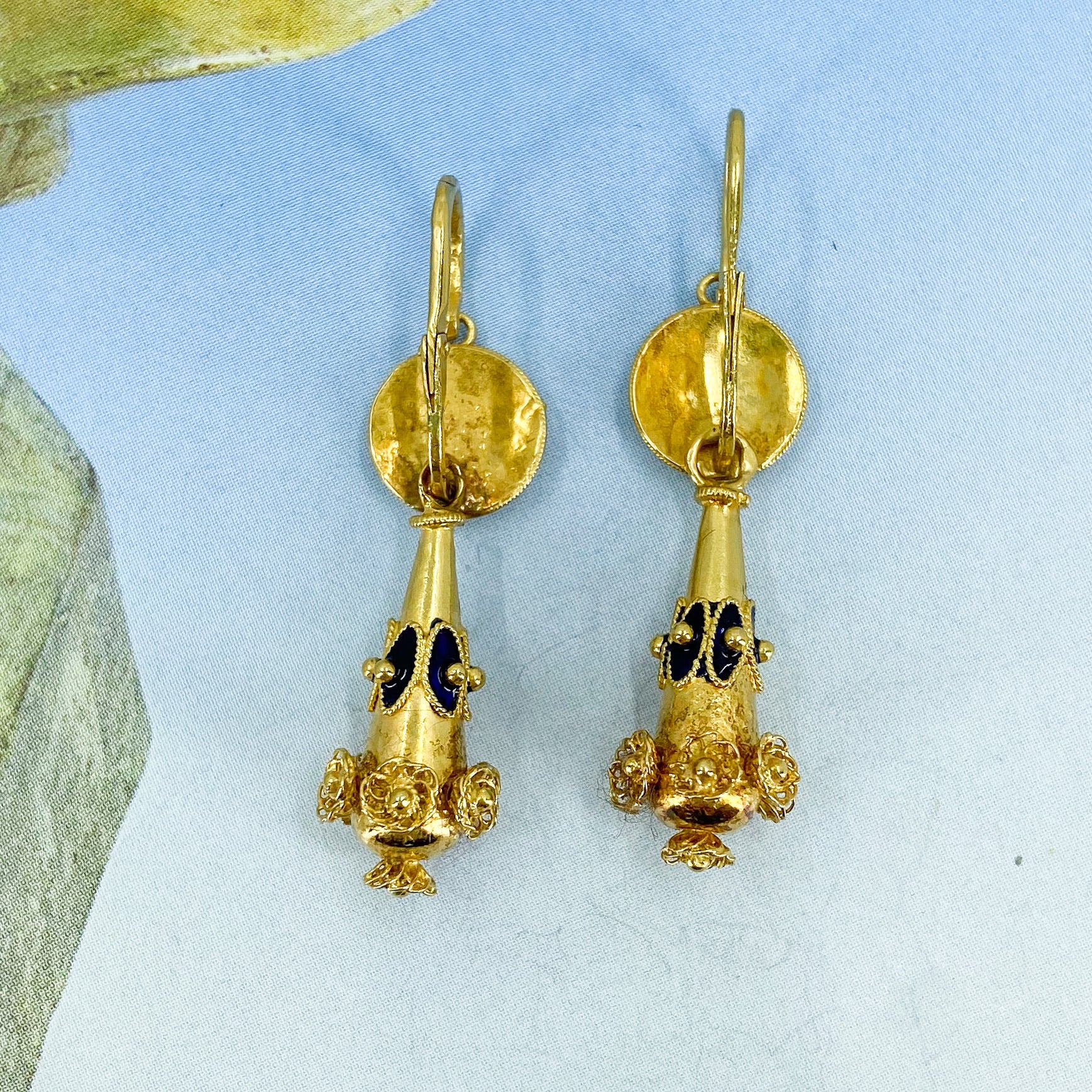 Look at these beauties! If you couldn't tell by now, I love a beautiful pair of day/night earrings because you get two earrings in one! These Mid-Century circa 1950's Victorian Revival earrings were made in Portugal with the Portuguese gold standard of 19.2k, so you get that really lush and vibrant gold color that is so reminiscent of Victorian pieces of similar design--and it really pops against the traditional cobalt blue enamel accents. Wear the drop for a swingy, more antique look or unhook the drop and wear just the top as your go-to everyday pair!