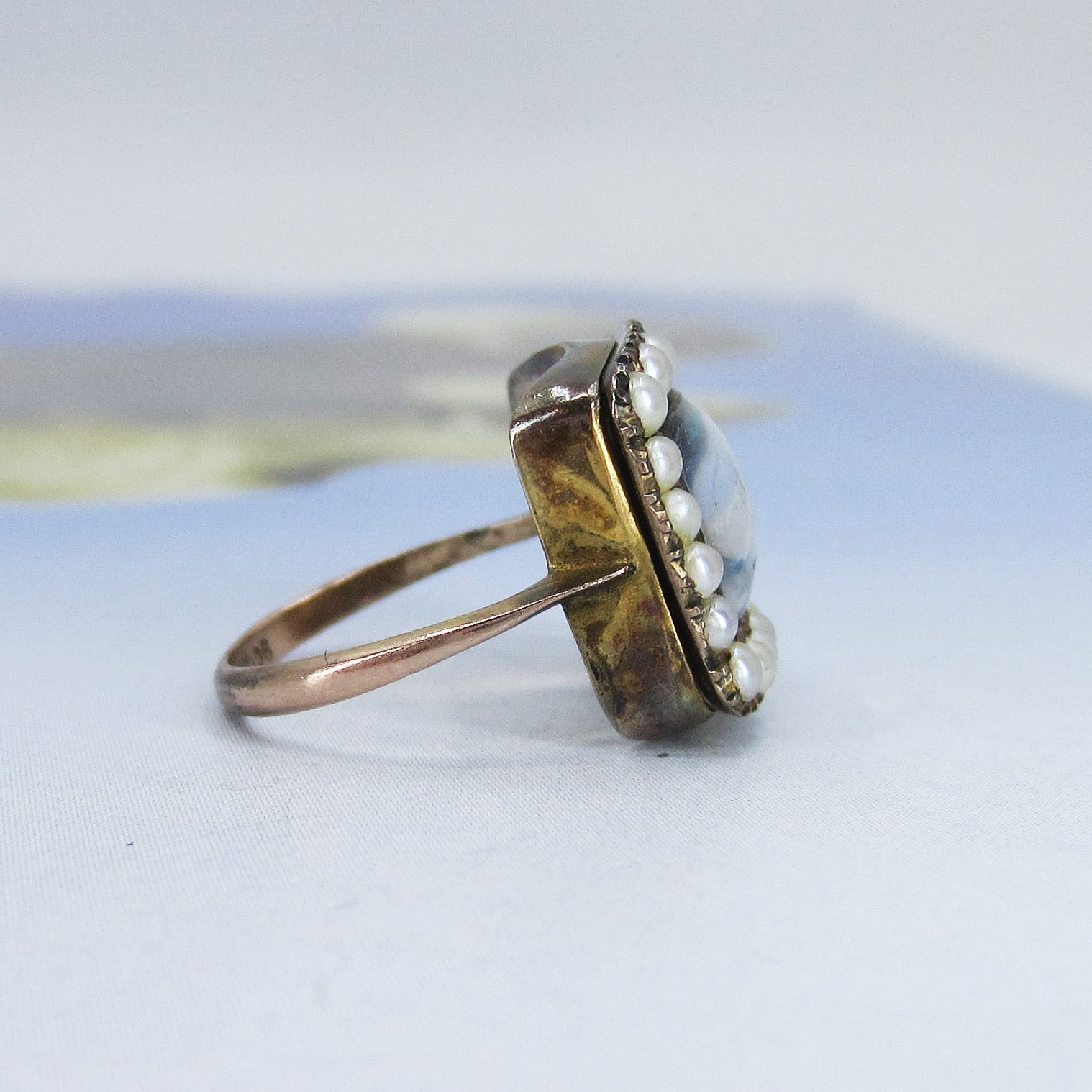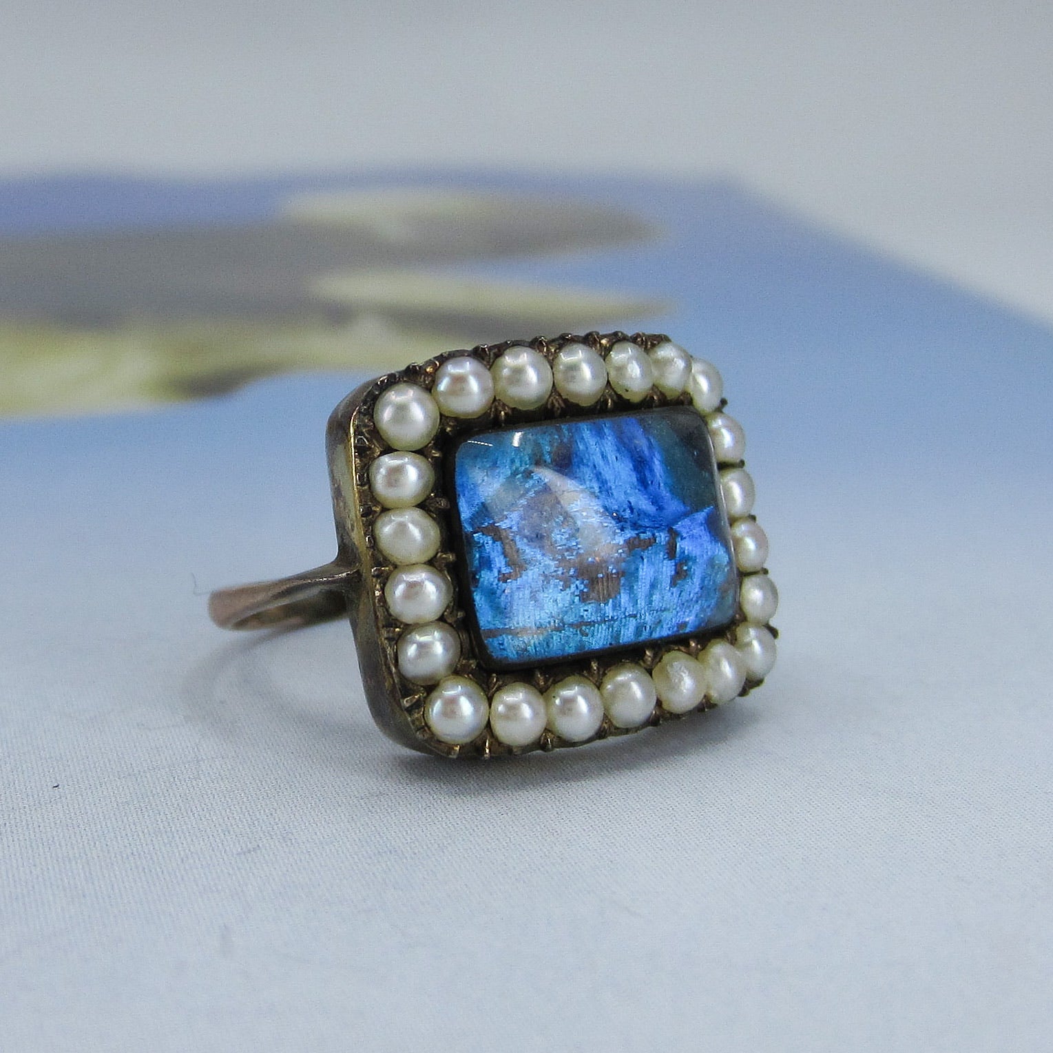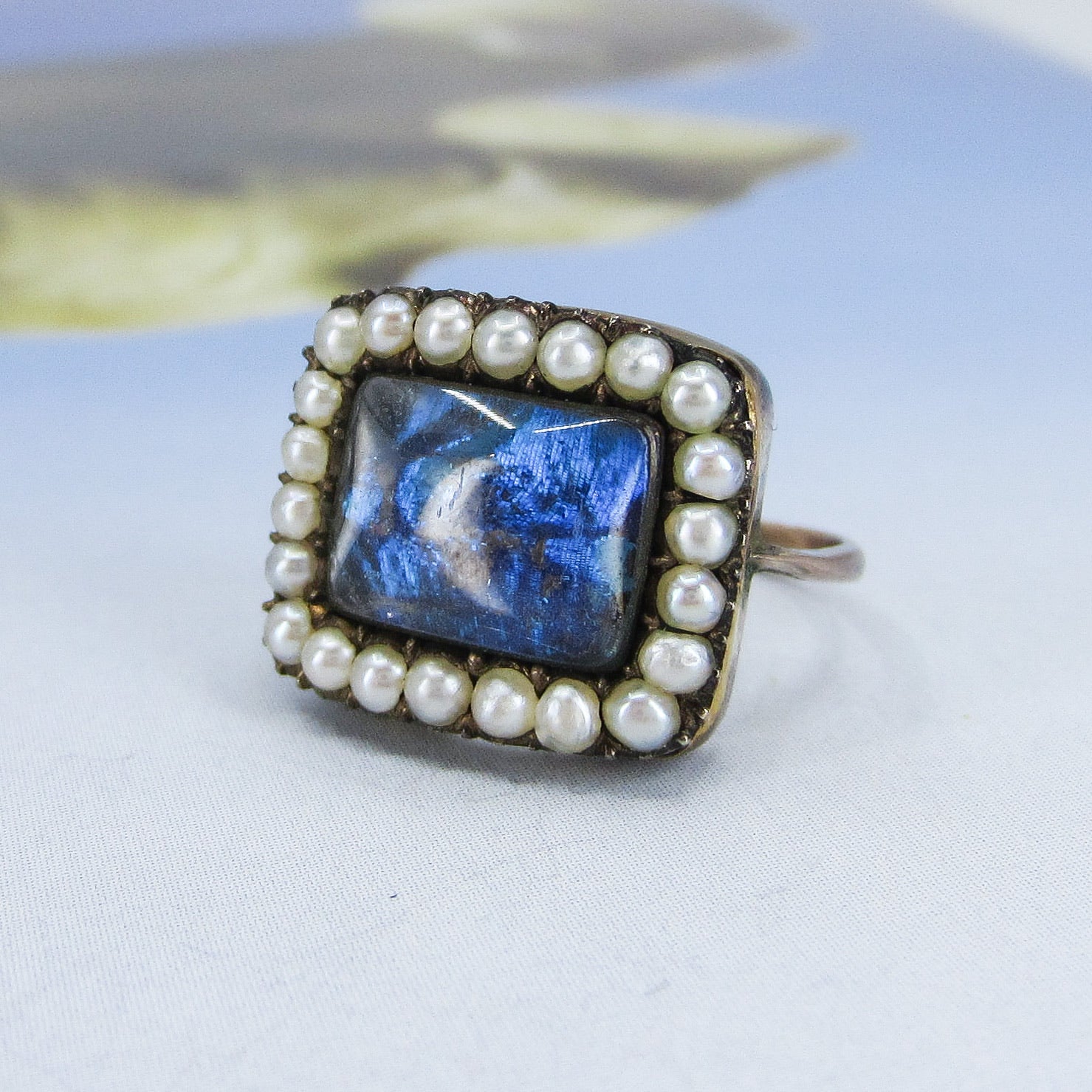 This unique antique ring dates from the late Georgian/early Victorian period circa 1840 and has a frame of pearls surrounding a butterfly wing under glass in 14k yellow gold. Usually we see butterfly wing jewelry in late 19th and early 20th century pieces, but I have seen a rare few Georgian pieces. Butterfly wing is exactly what you think it is--it is a butterfly's wing, generally from the Morpho butterfly, placed under crystal or glass and sealed to prevent moisture from intruding and destroying the wing over time. It has a beautiful blue/violet iridescent glow and looks like nothing else. This ring is in the case at the store and all day long people ask what that gem is! This ring is a special and rare antique that you'll enjoy wearing and owning--and would be a great addition to any Georgian collection!