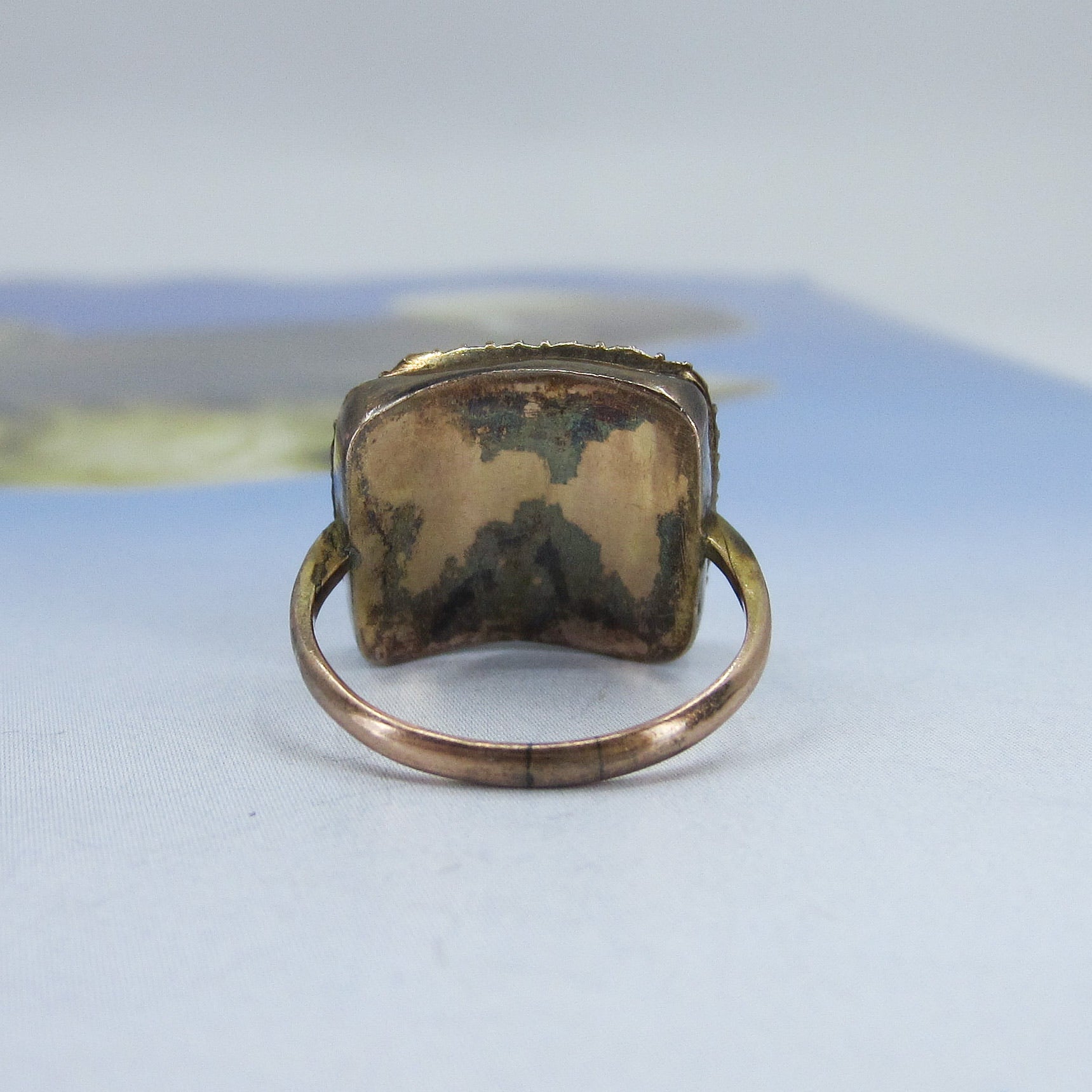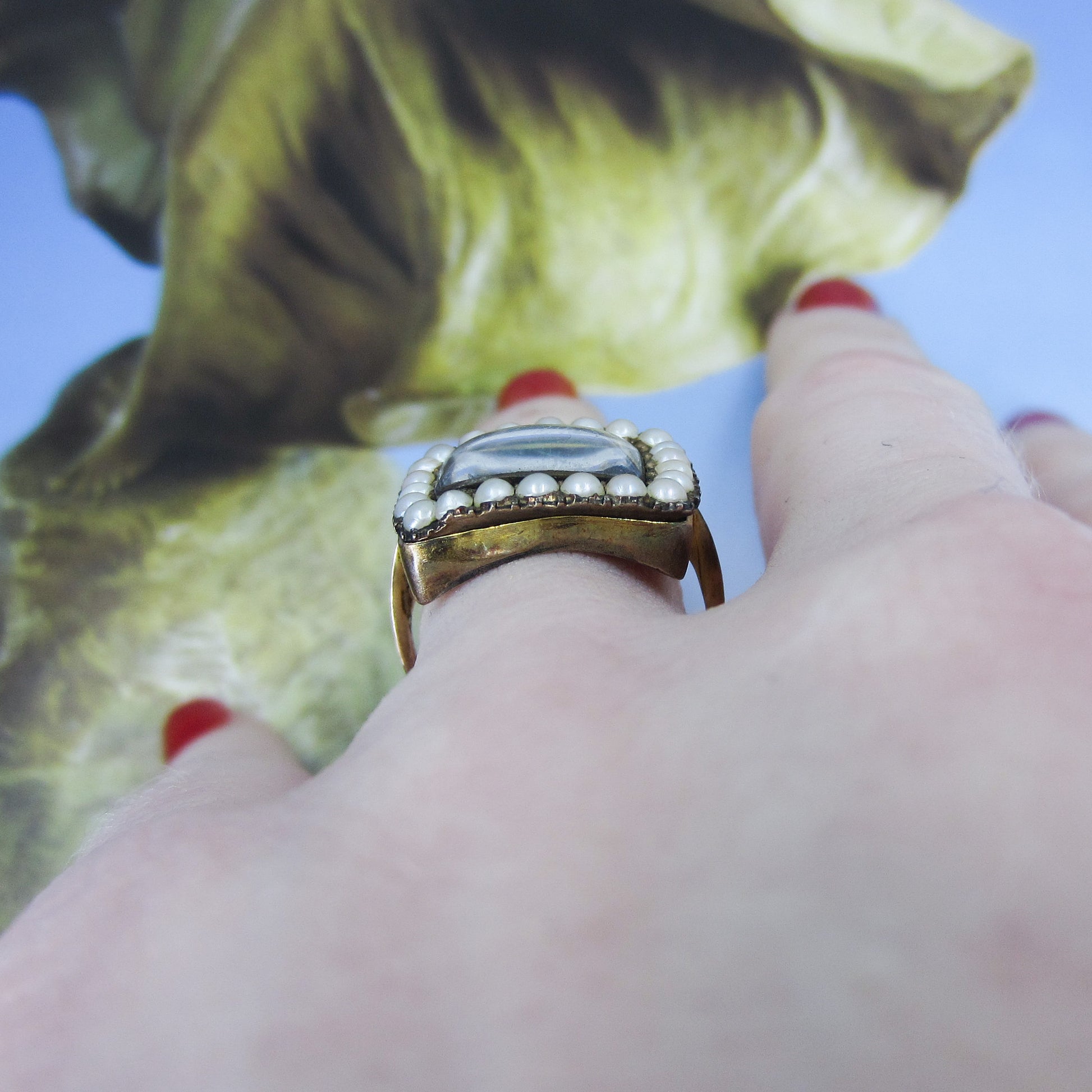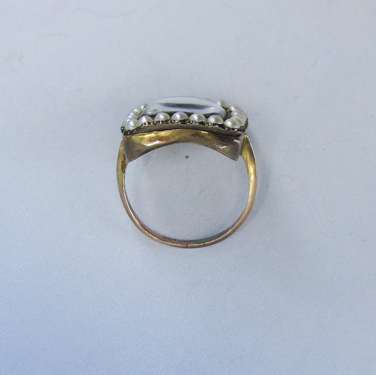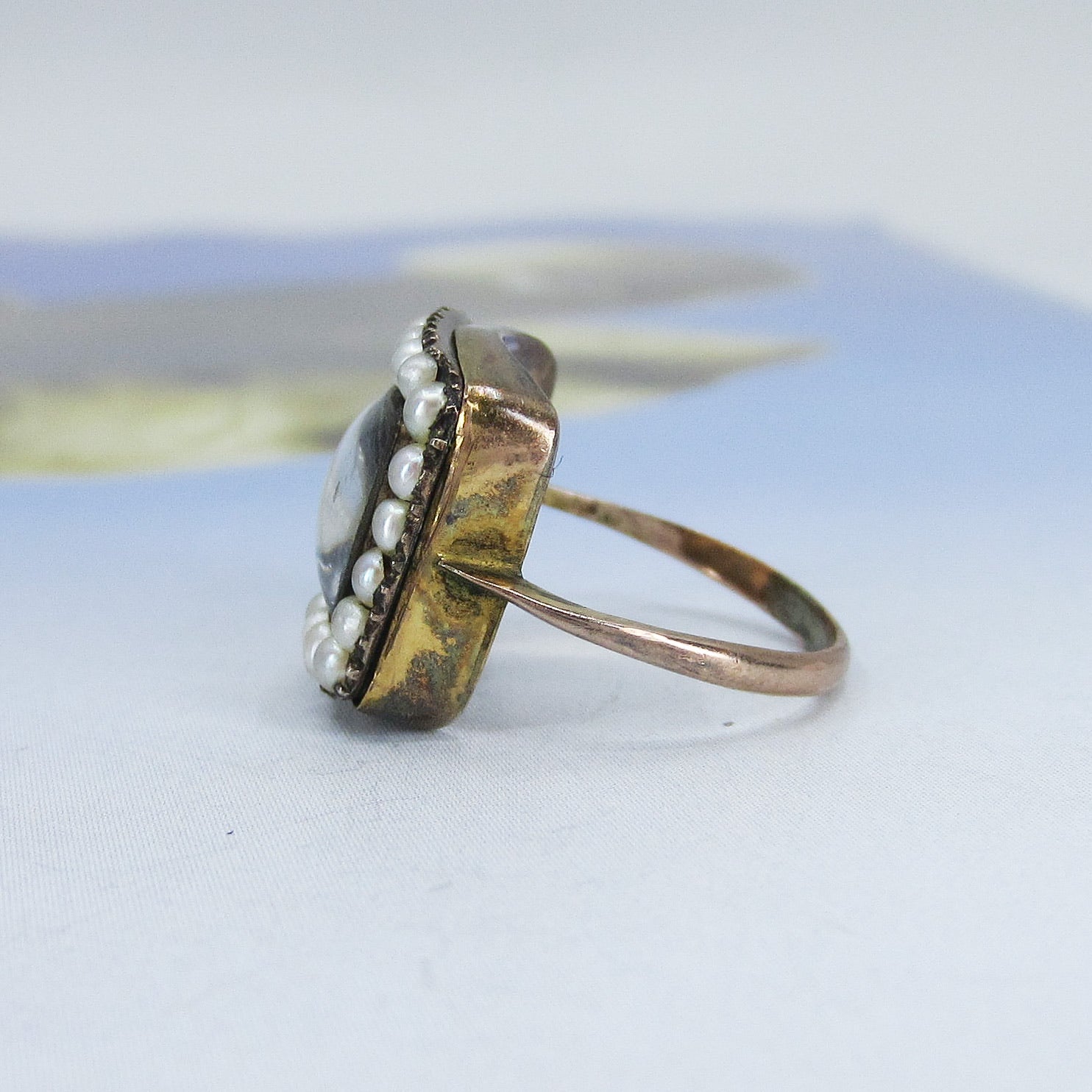 This unique antique ring dates from the late Georgian/early Victorian period circa 1840 and has a frame of pearls surrounding a butterfly wing under glass in 14k yellow gold. Usually we see butterfly wing jewelry in late 19th and early 20th century pieces, but I have seen a rare few Georgian pieces. Butterfly wing is exactly what you think it is--it is a butterfly's wing, generally from the Morpho butterfly, placed under crystal or glass and sealed to prevent moisture from intruding and destroying the wing over time. It has a beautiful blue/violet iridescent glow and looks like nothing else. This ring is in the case at the store and all day long people ask what that gem is! This ring is a special and rare antique that you'll enjoy wearing and owning--and would be a great addition to any Georgian collection!