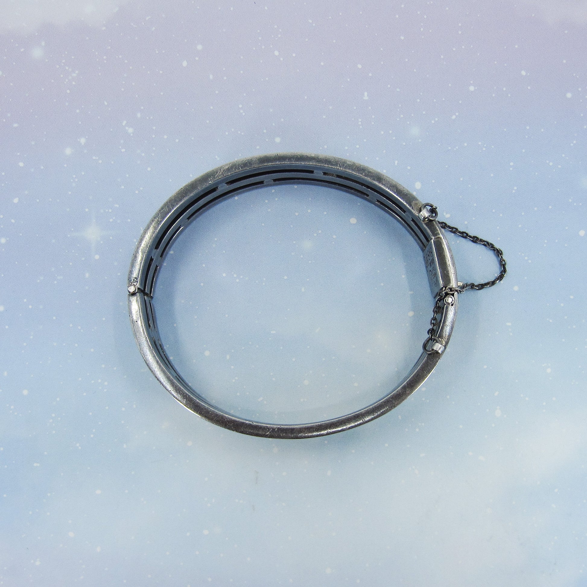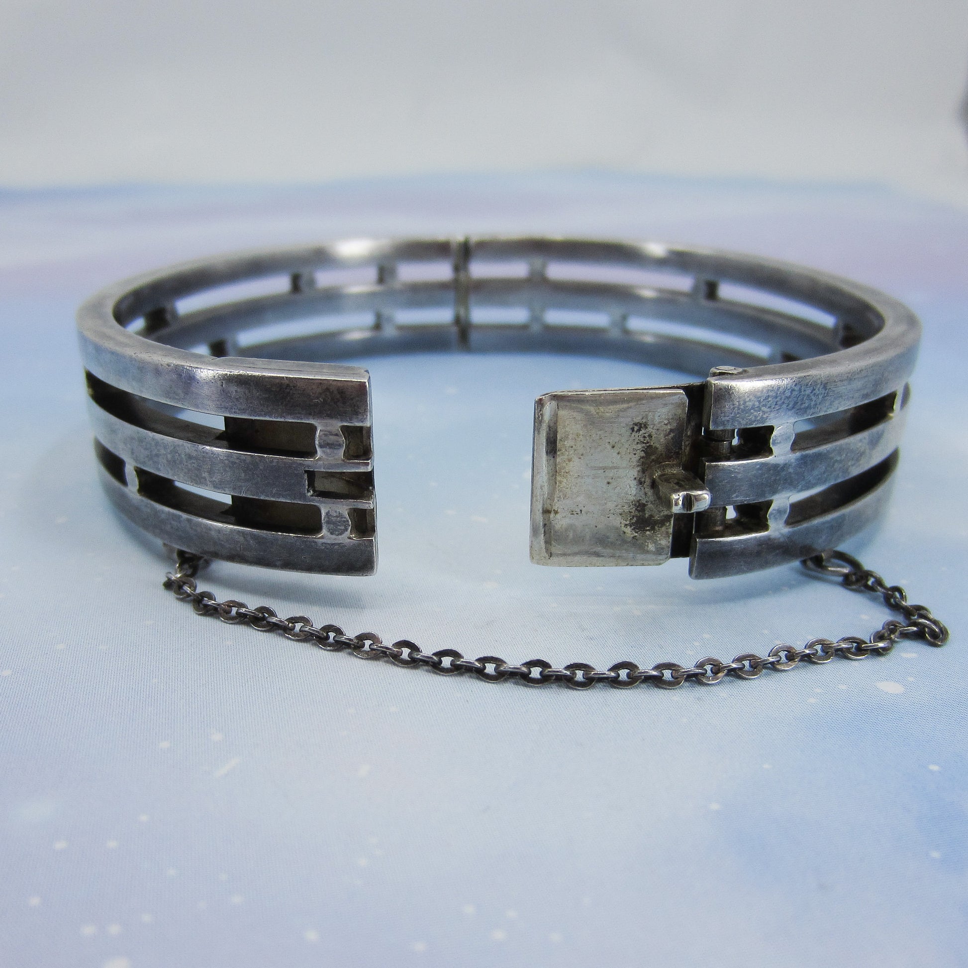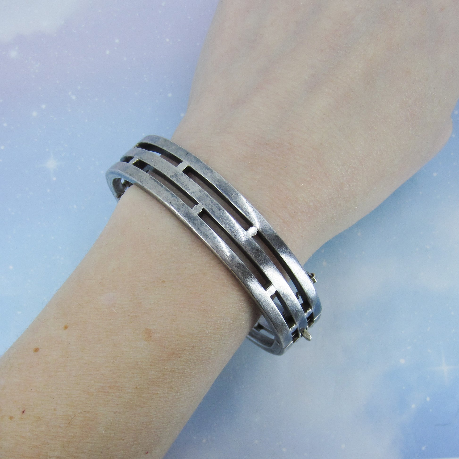 This elegantly designed hinged bangle was made by the famed Cony workshop of Taxco Mexico circa 1950. It has a pleasing, hefty weight and and is well-made, so you can definitely stack it with other bangles and bracelets. Its solid craftsmanship, which this workshop was known for, makes for a great everyday piece!