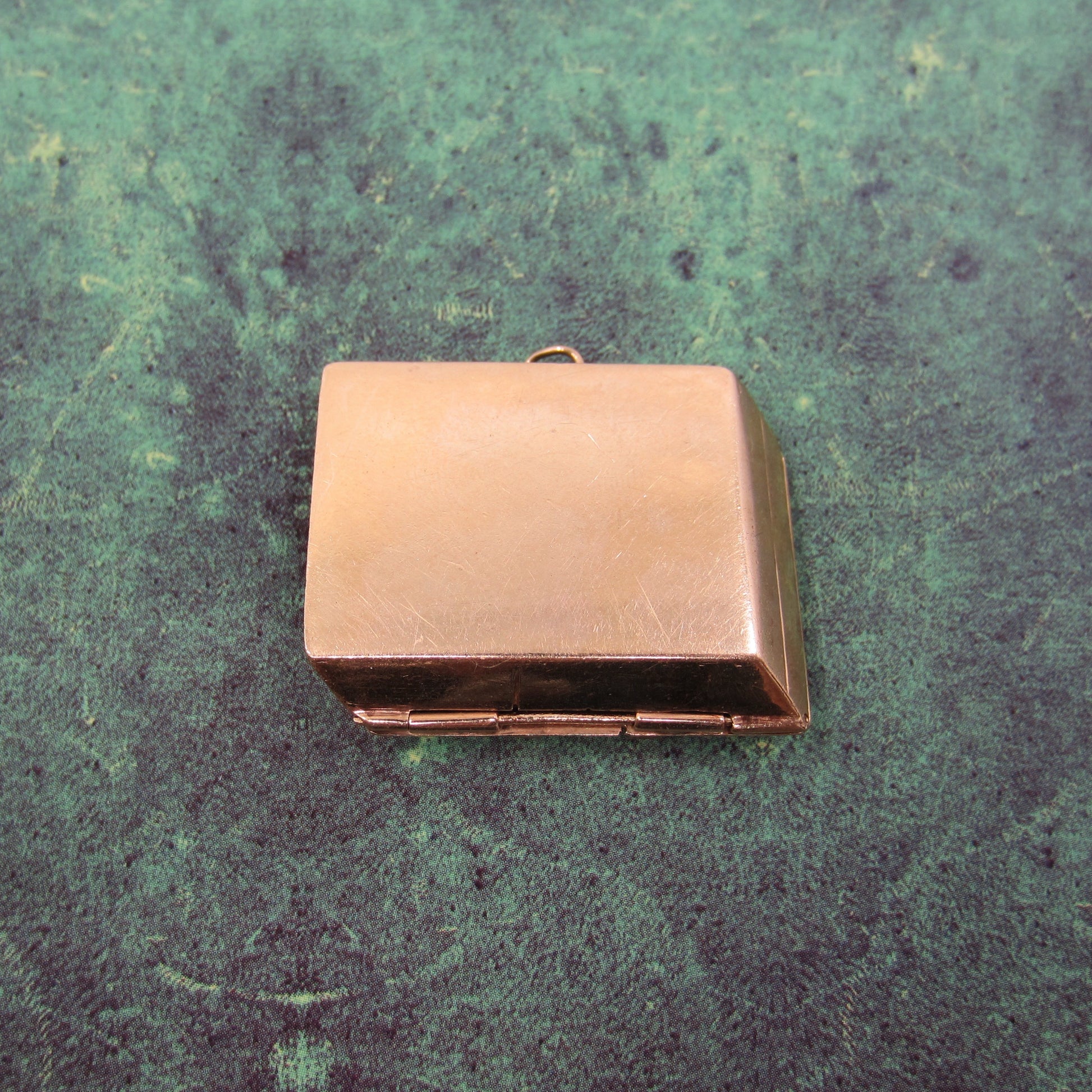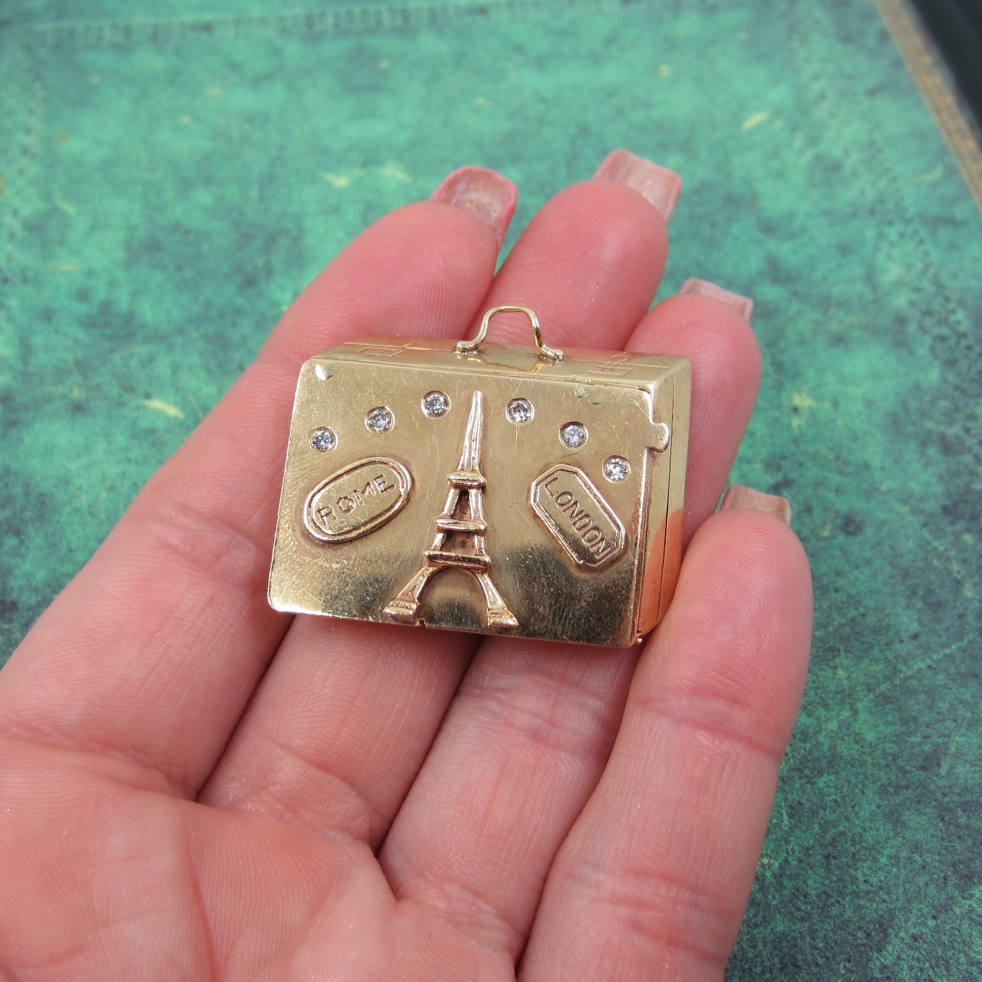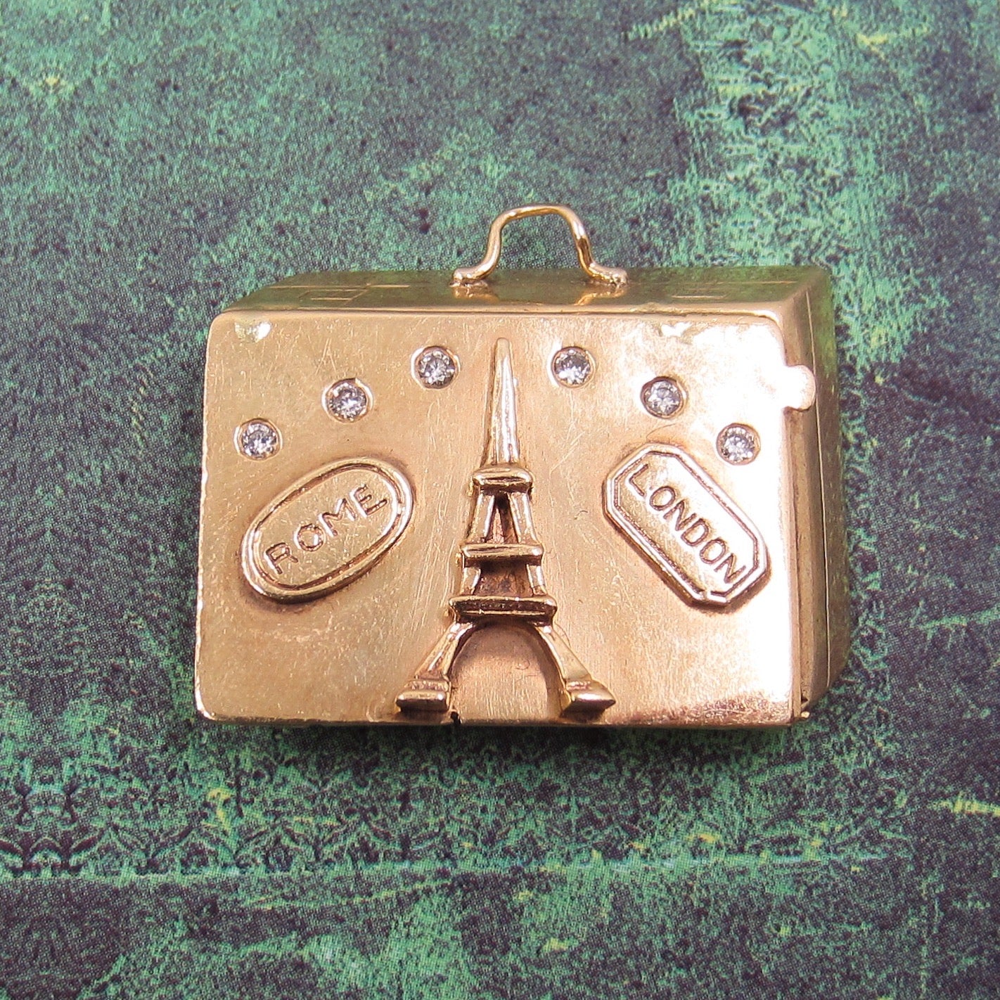 There are a lot of people eyeing this vintage charm at the store--better snap her up quick if you're a collector because you won't be seeing this one again! Fashioned as a jet-setter's suitcase, this large charm is made in 14k yellow/rose gold and set with six sparkling diamonds flanking the Eiffel Tower! Stamps for Rome and London, a tiny little handle and engraved latches make this a sweetheart of a piece. There is a hinge so originally this piece did open, but it has since been soldered shut and there is something rattling about inside. My jeweler will not open it so I leave it up to the new owner as to whether they want to have it opened and find out what is inside!