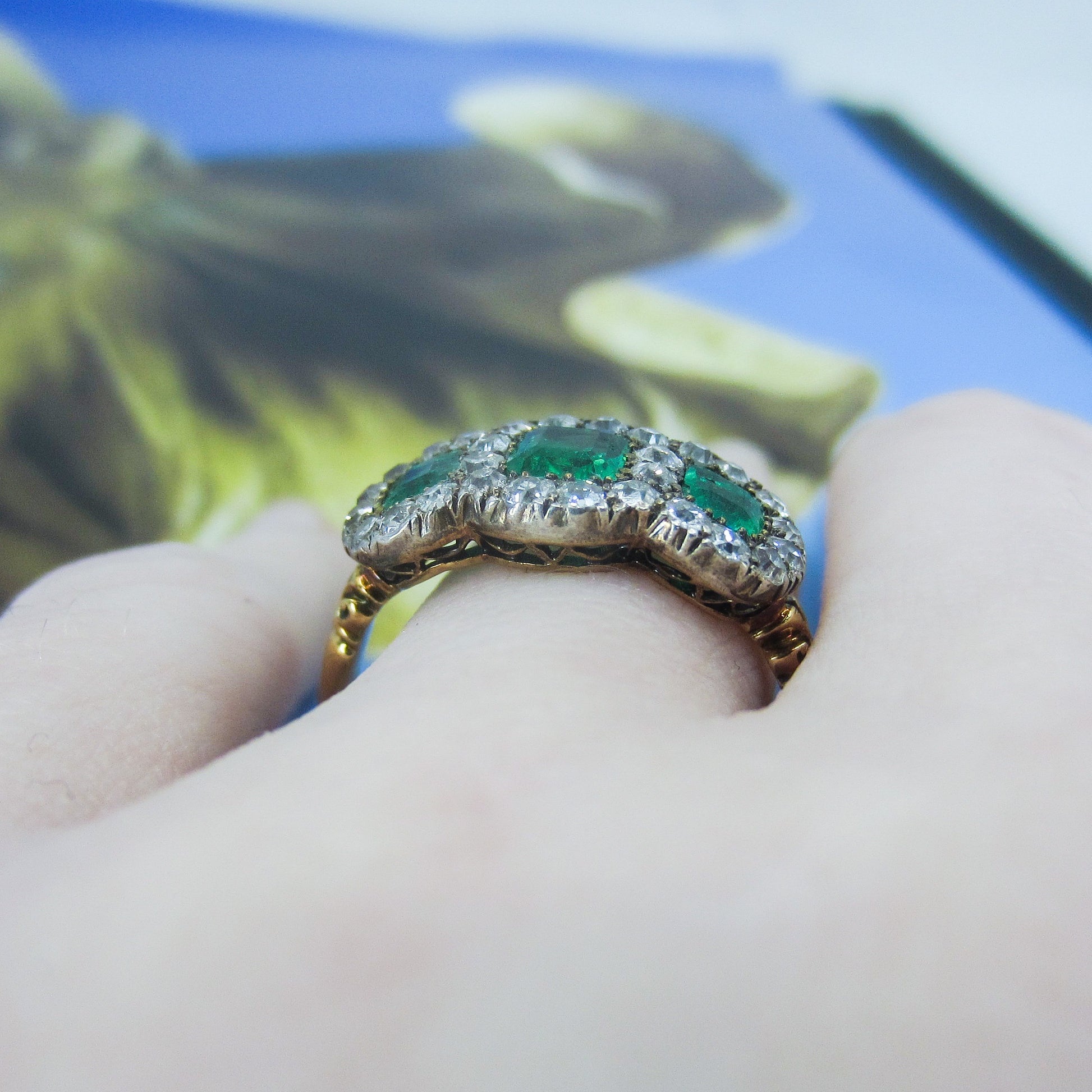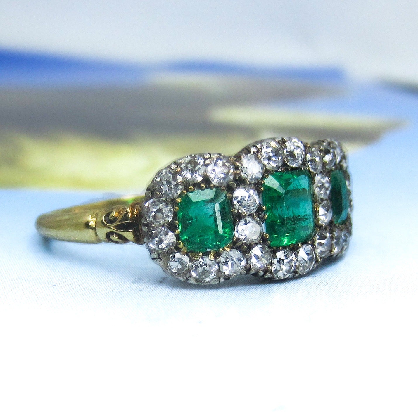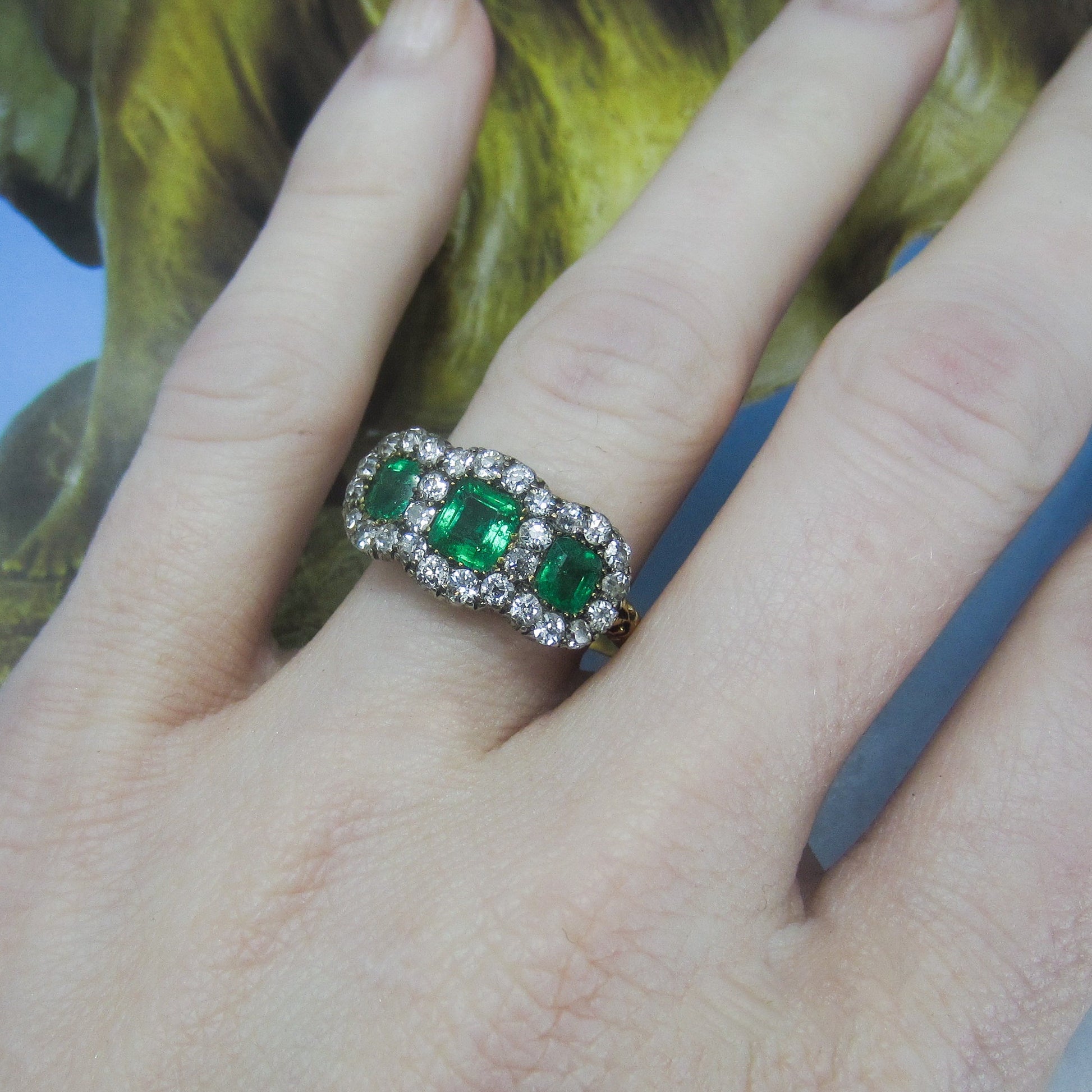 I have to catch my breath as I write this description because I am so in love with this ring. This is it folks, a true mid-Victorian super high-end for the period cluster ring set with three incredibly vibrant natural emeralds set in 18k in a frame of old cut diamonds set in silver. This ring is most likely British in origin. These emeralds are green green GREEN, the perfect emerald color and they will not disappoint even the most discerning emerald lover! Rings from this period and of this level are exceedingly hard to find these days, especially in this condition. I suspect the woman who wore it did so infrequently and did not do much with her hands! That being said, this would make the most special engagement ring but be forewarned that you can't wear this ring all day every day. Between the emeralds and the age, you have to take care and keep an eye on what you're doing when you're wearing it. But if you get that pit-of-your-stomach feeling when you look at it like "this is MY ring" (I've been there!) and you're willing to be careful, then go for it because you will be THRILLED and I will be thrilled for you! It is beyond spectacular!