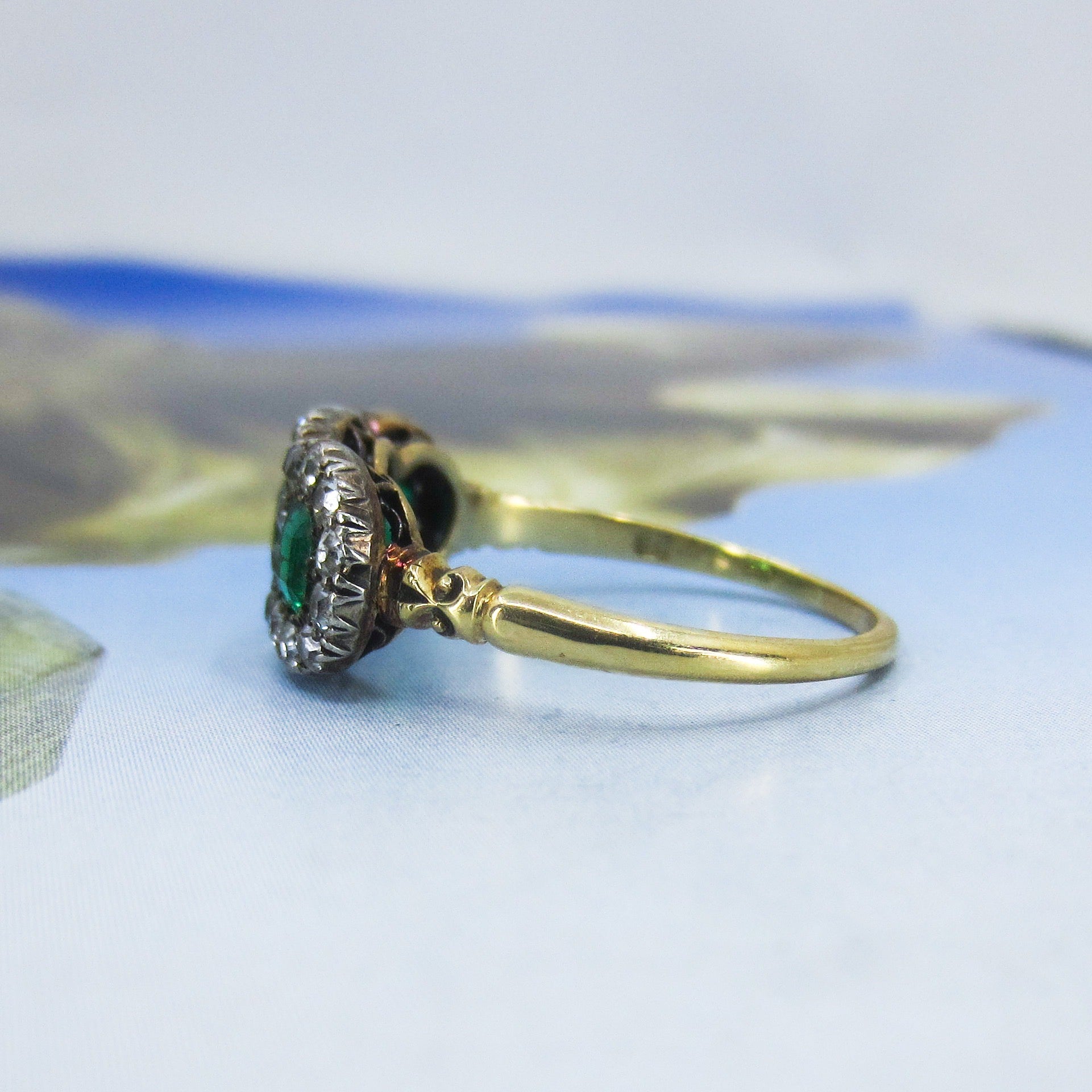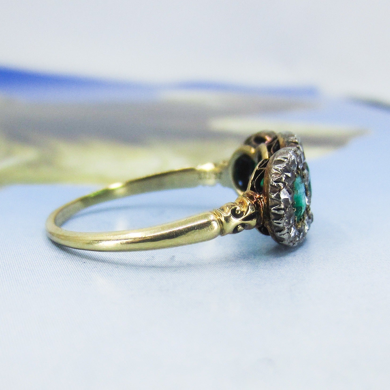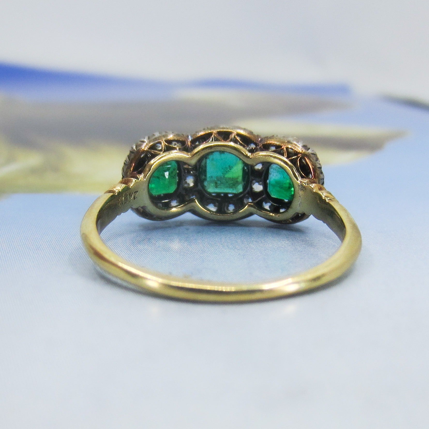 I have to catch my breath as I write this description because I am so in love with this ring. This is it folks, a true mid-Victorian super high-end for the period cluster ring set with three incredibly vibrant natural emeralds set in 18k in a frame of old cut diamonds set in silver. This ring is most likely British in origin. These emeralds are green green GREEN, the perfect emerald color and they will not disappoint even the most discerning emerald lover! Rings from this period and of this level are exceedingly hard to find these days, especially in this condition. I suspect the woman who wore it did so infrequently and did not do much with her hands! That being said, this would make the most special engagement ring but be forewarned that you can't wear this ring all day every day. Between the emeralds and the age, you have to take care and keep an eye on what you're doing when you're wearing it. But if you get that pit-of-your-stomach feeling when you look at it like "this is MY ring" (I've been there!) and you're willing to be careful, then go for it because you will be THRILLED and I will be thrilled for you! It is beyond spectacular!