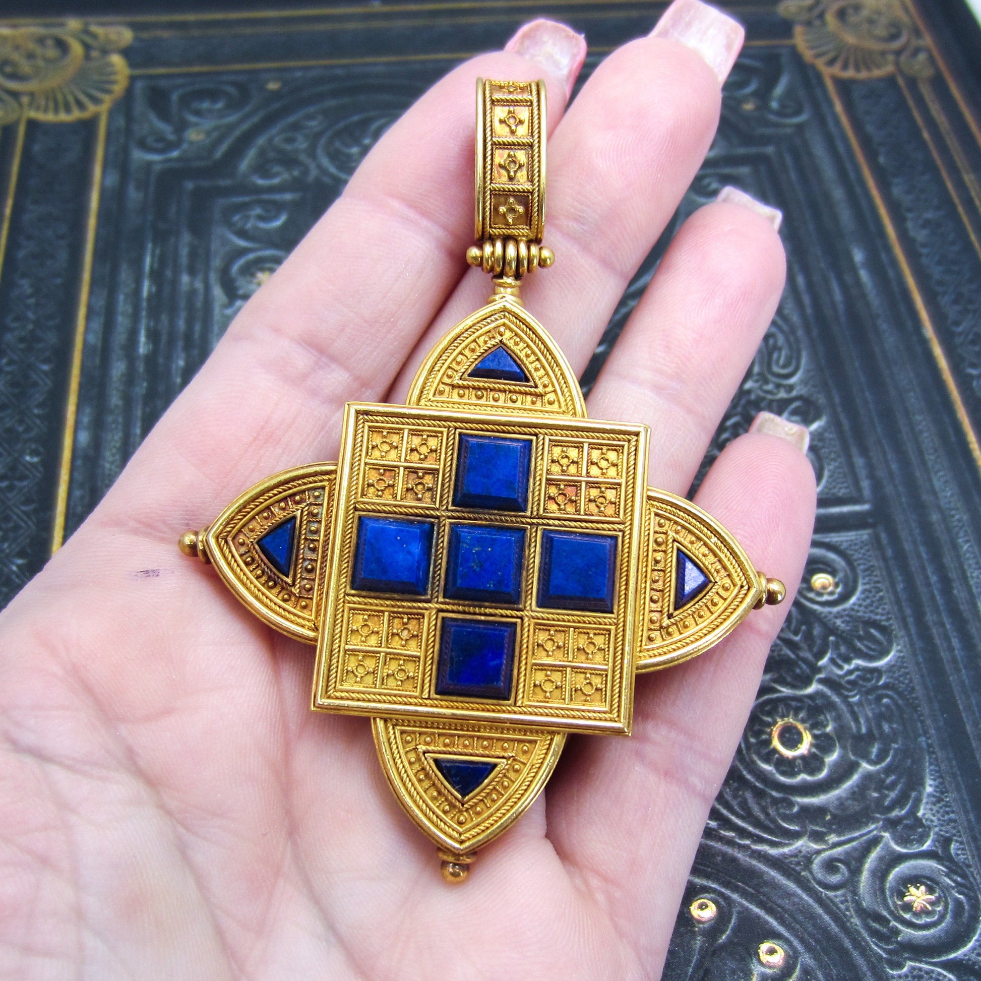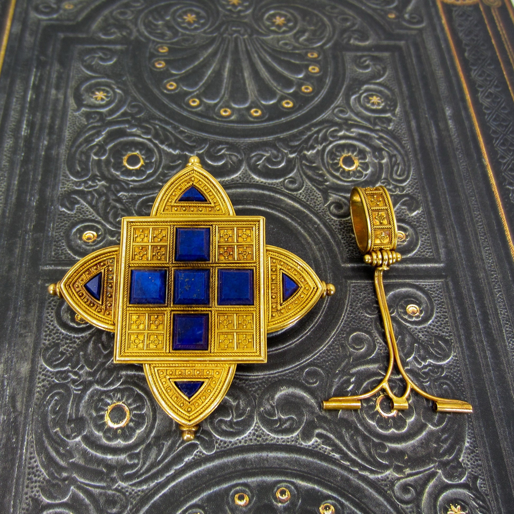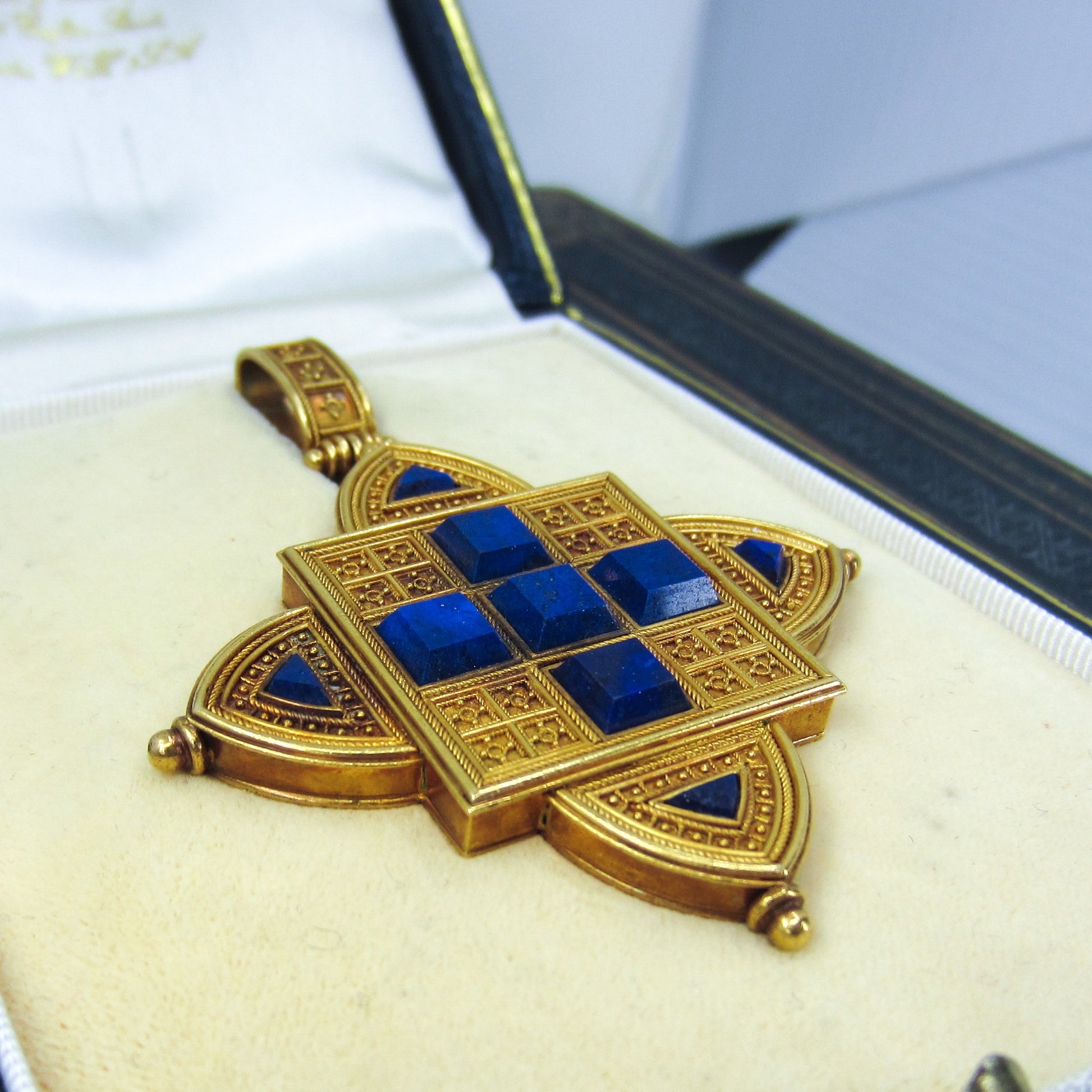 This piece is a literal masterpiece of both the Etruscan Revival and Renaissance Revival style of the Victorian Period circa 1860's. Made in 22k gold with faceted lapis lazuli and hand-applied granulation and wirework throughout, with a fitted case from DL Lavender Antiques, London. The bail detaches from the piece so it can be worn as a brooch as well. In absolutely perfect condition, this work of art is of the level of famed Victorian jewelers Giuliano and Castellani. For the serious collector.