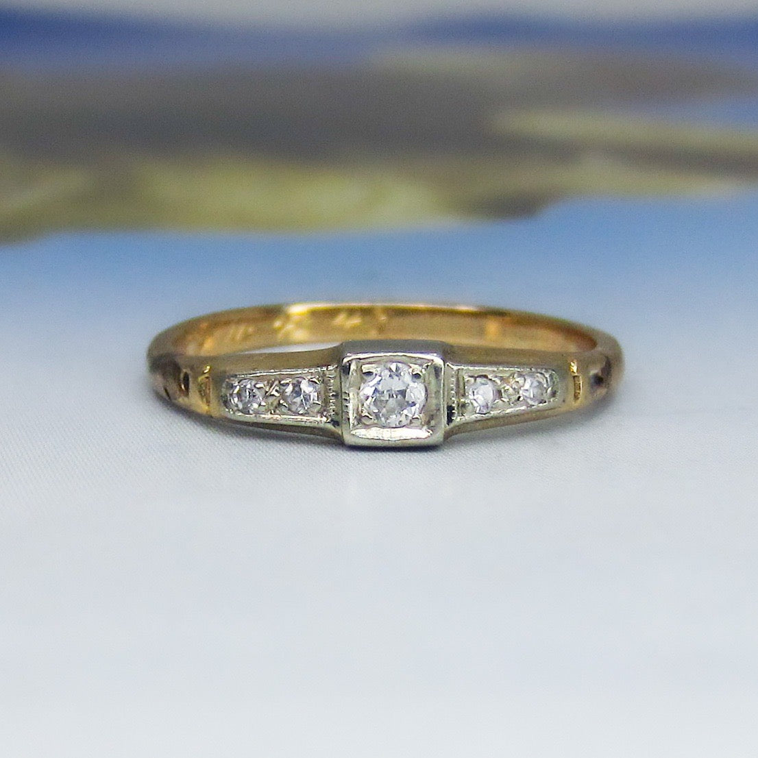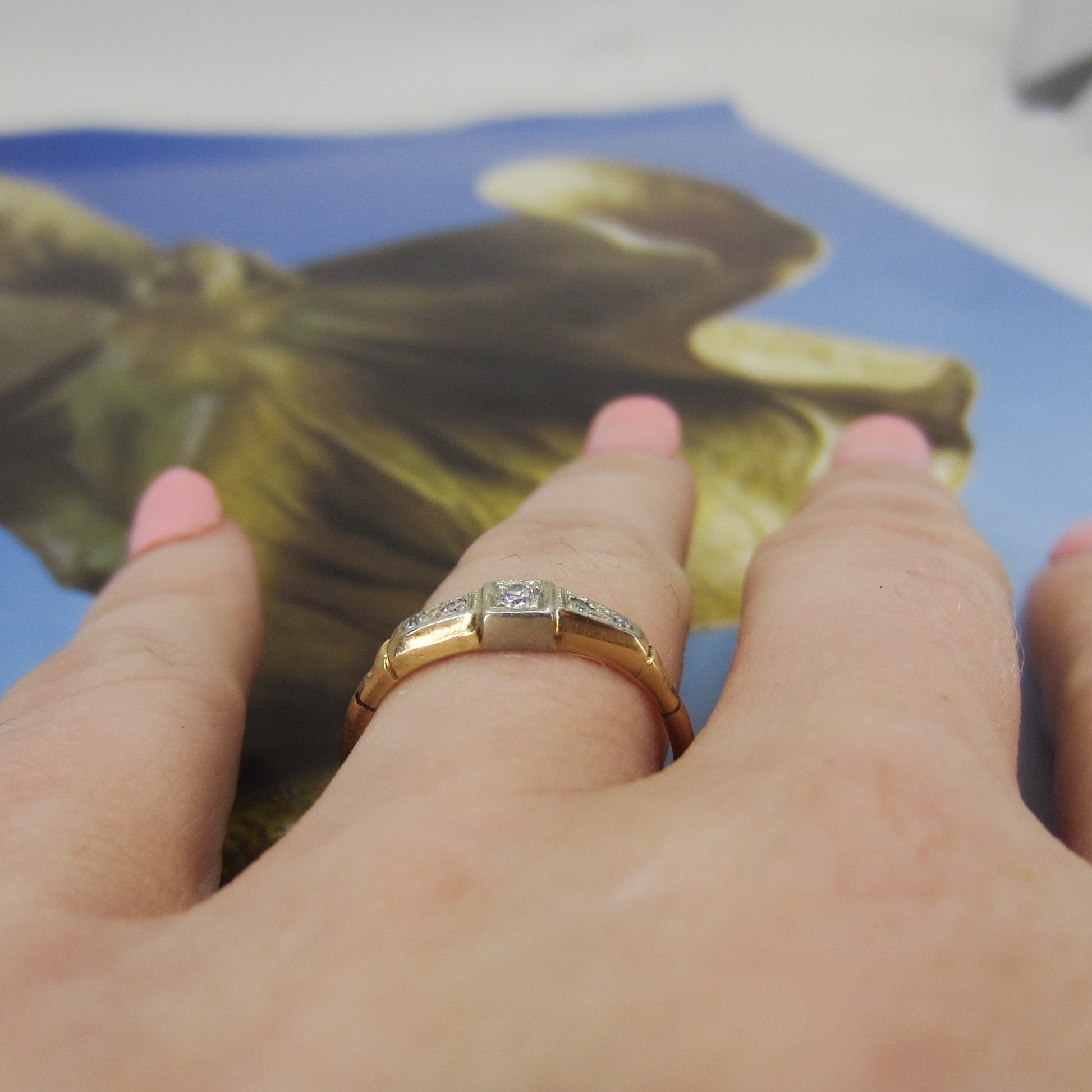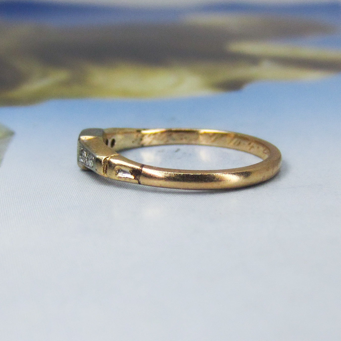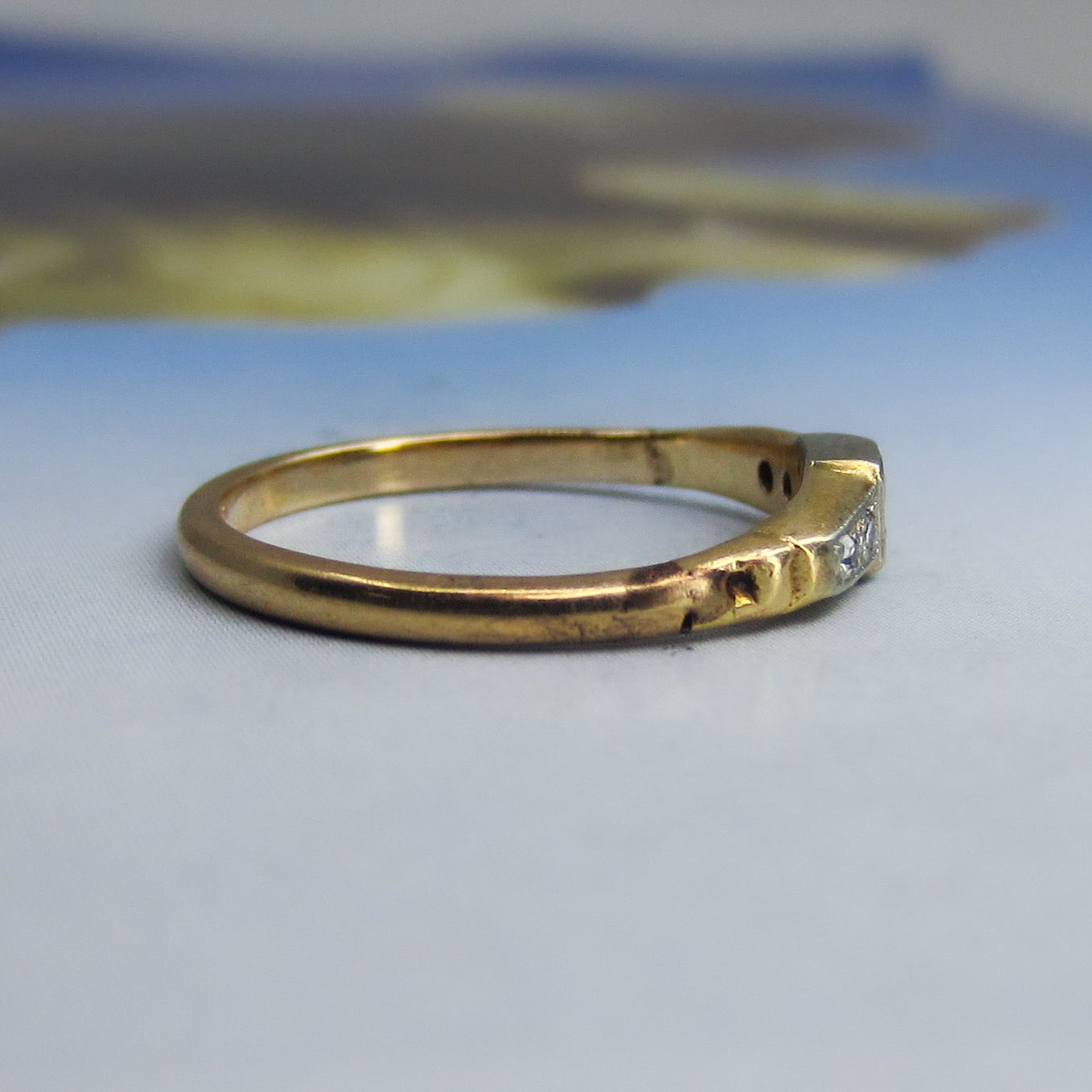 A very pretty and wearable late Art Deco wedding band with a central Transitional Round Brilliant Cut diamond, box set and flanked on either side by two single cut diamonds in 14k gold. Engraved with date of 1943. This would make a lovely engagement ring for someone who wants something understated as well!