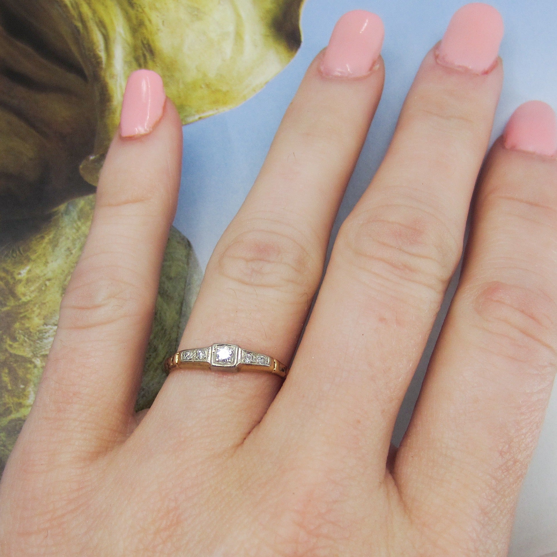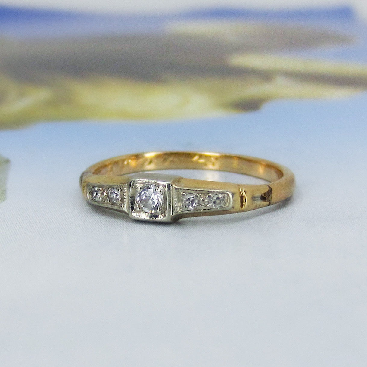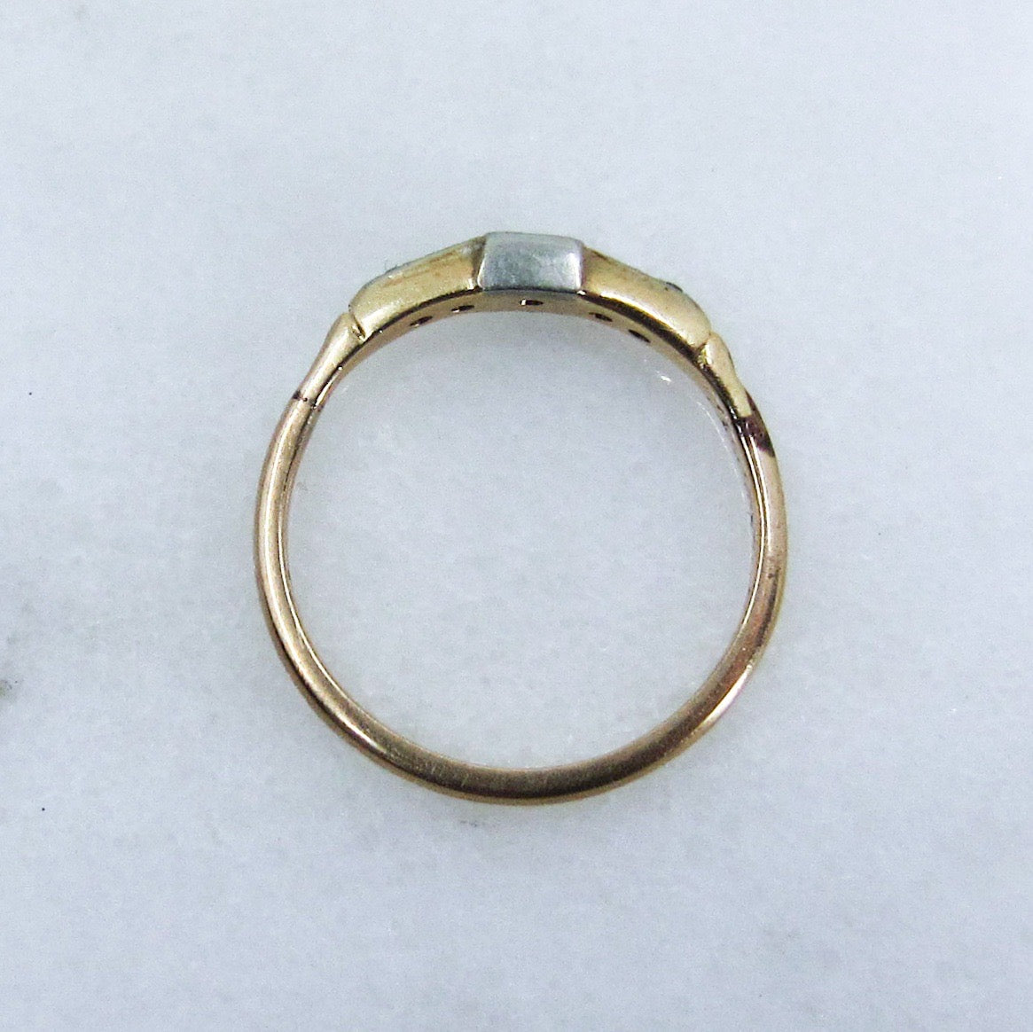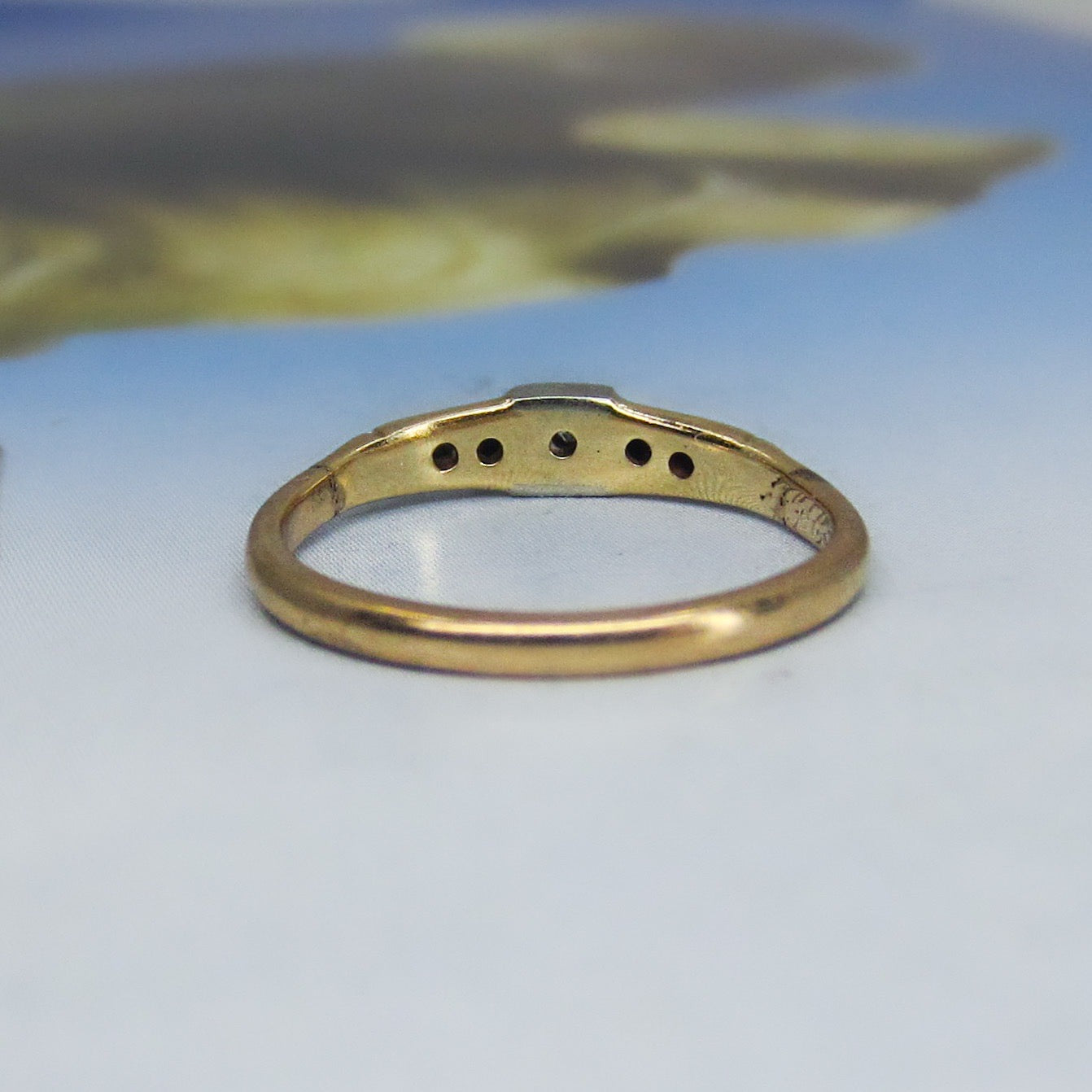 A very pretty and wearable late Art Deco wedding band with a central Transitional Round Brilliant Cut diamond, box set and flanked on either side by two single cut diamonds in 14k gold. Engraved with date of 1943. This would make a lovely engagement ring for someone who wants something understated as well!