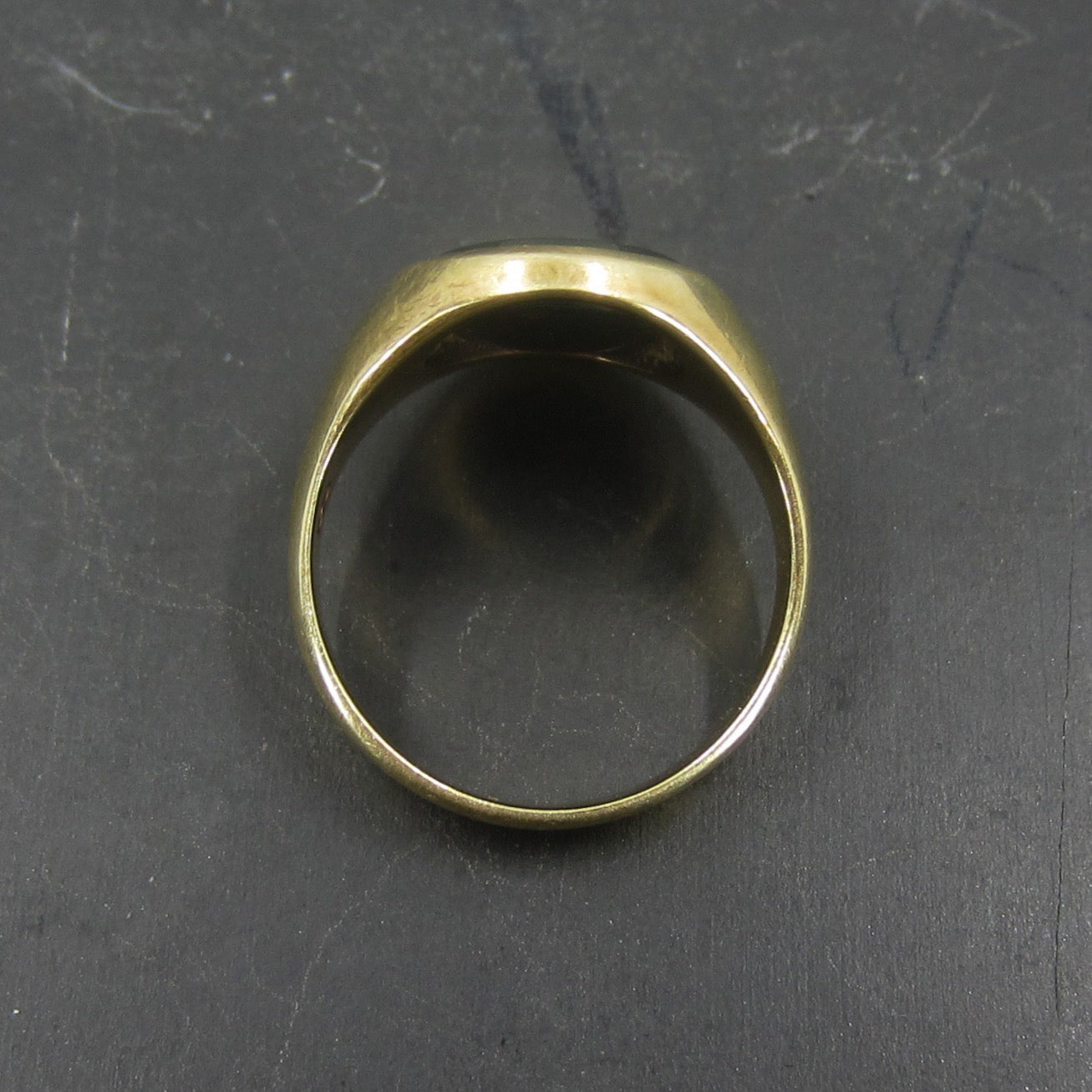 Here's a classic antique signet ring, initially made for man but can now be worn by anyone, hailing from the late Victorian/early Edwardian era circa 1900. A flat tabular bloodstone is set in 14k gold with a nice weight and flat look on the hand. People often ask me what bloodstone is--bloodstone is a variety of chalcedony (onyx, chrysoprase, marble, jasper are also chalcedony) that is known for it's dark green background color and orange flecks of iron oxide, resembling blood. We see this stone quite a bit in Victorian jewelry, then again in Deco all the way through the Mid-Century. It's a gorgeous stone; dark, brooding and mysterious.