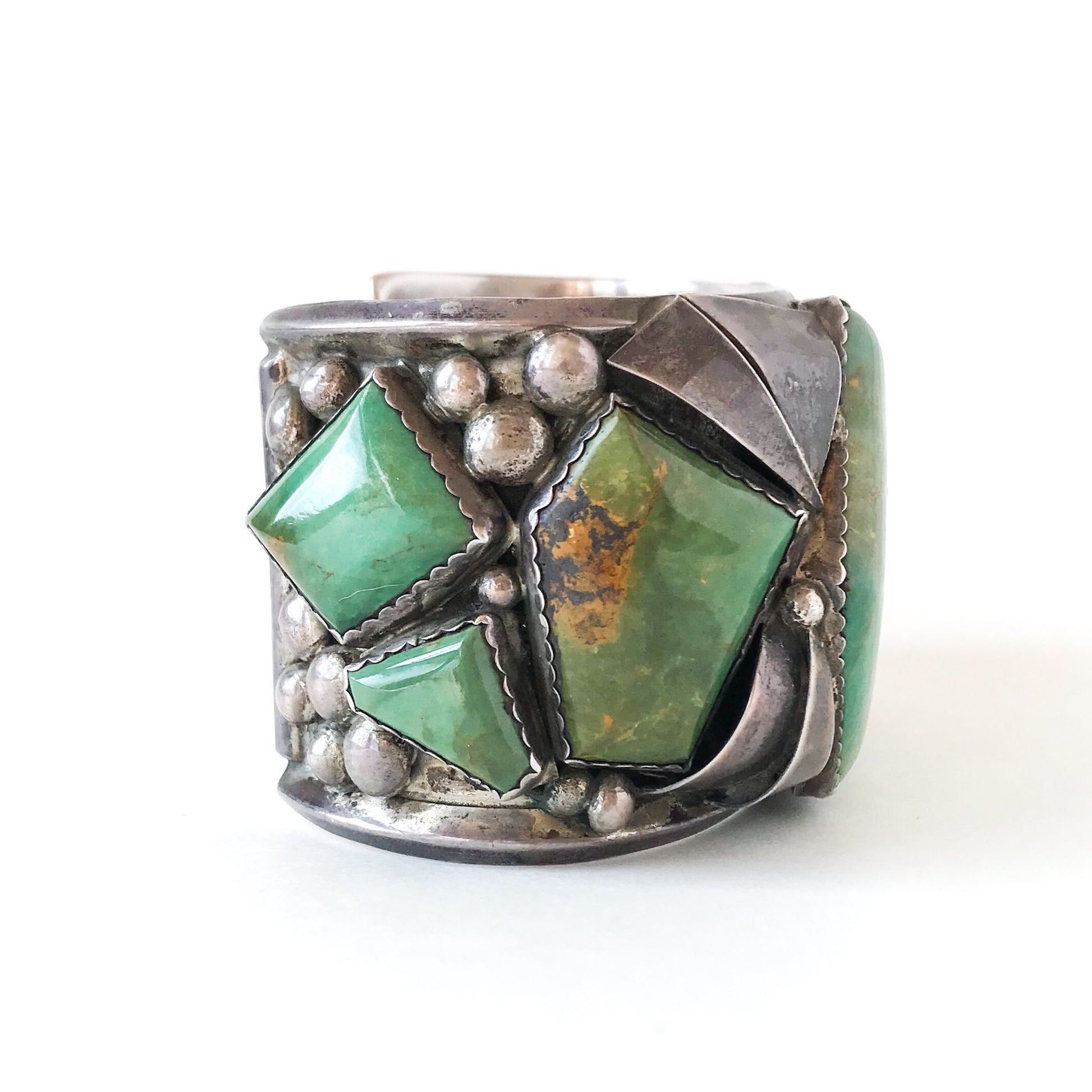 Here we have a truly gigantic cuff by Navajo artists E & C Fierro. Handmade in sterling silver circa early 2000's, this badass bracelet is set with eight gorgeous, slightly faceted green turquoise stones with a high polish and beautiful golden matrix showing throughout. An unforgettable piece!