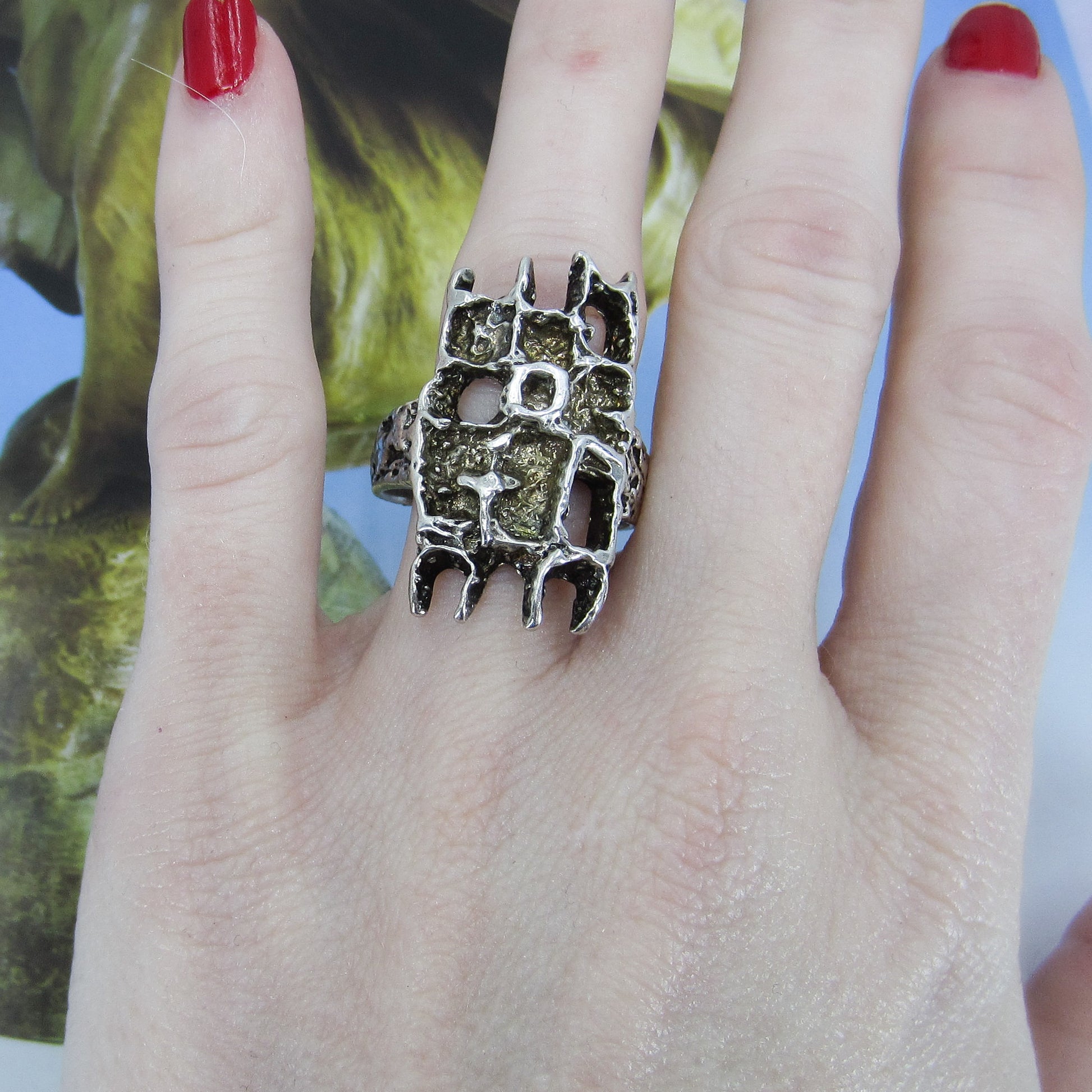This is a VERY cool ring made during the Mid-Century Brutalist period consisting of a spiky, organic openwork rectangle with recessed gilt areas, made in sterling silver circa 1970. One of the things I love most about Brutalist jewelry is how truly crazy it looks on--you see this ring on someone's finger and your brain goes wtf is that? Which is exactly what Brutalism is supposed to do! It is now and will always be one of my favorite periods of jewelry--so short, so distinct and focused, there is no mistaking a Brutalist piece and I encourage anyone who is thinking of taking the plunge into wearing Brutalist pieces to just do it!!