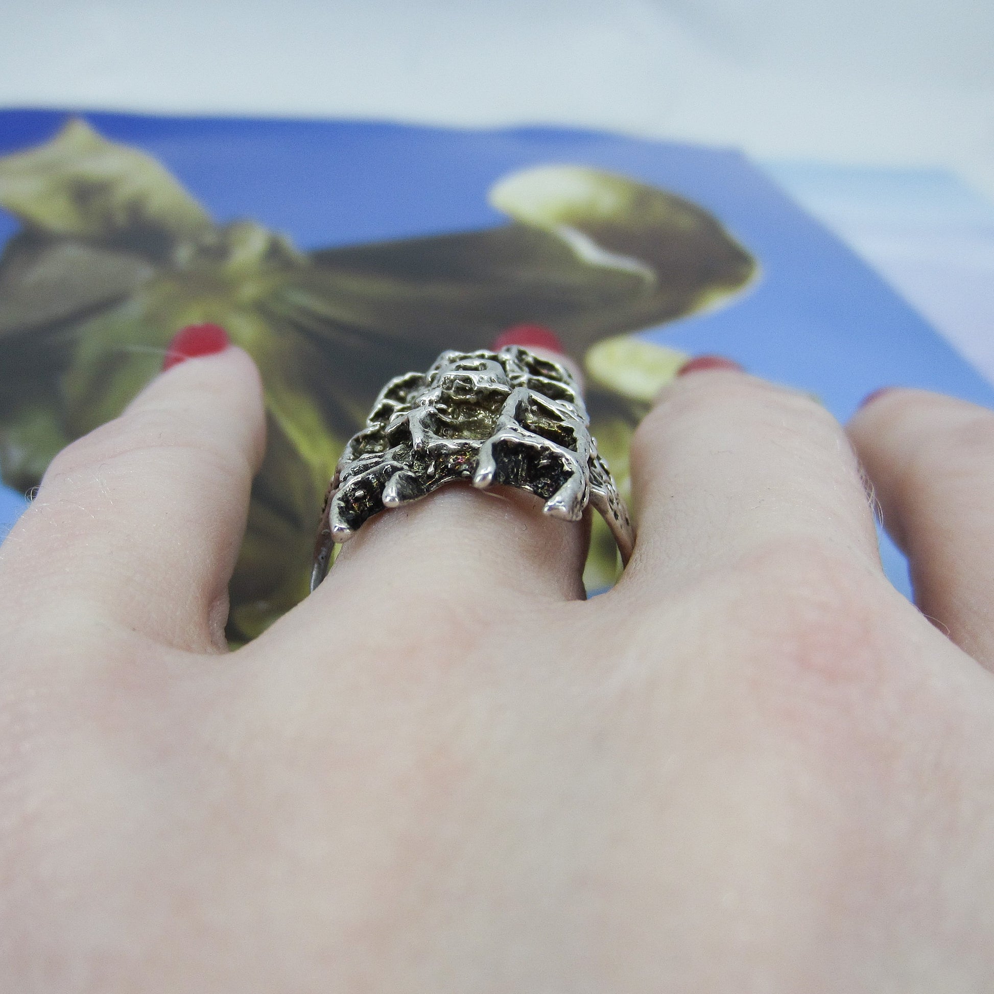 Face of the ring measures 1 3/16" x 5/8". Sits flat on the finger.