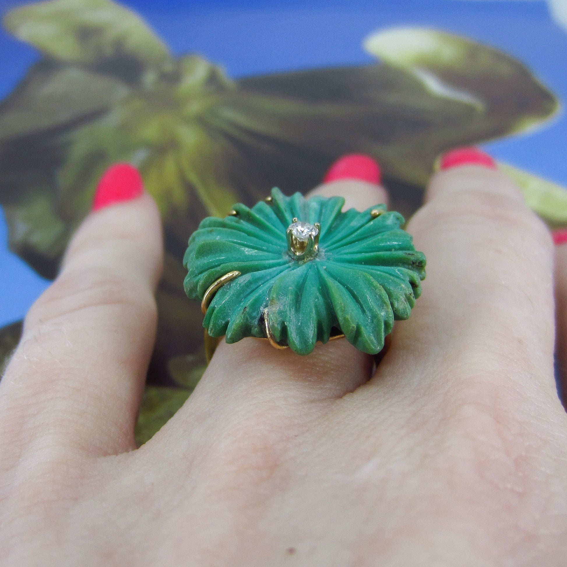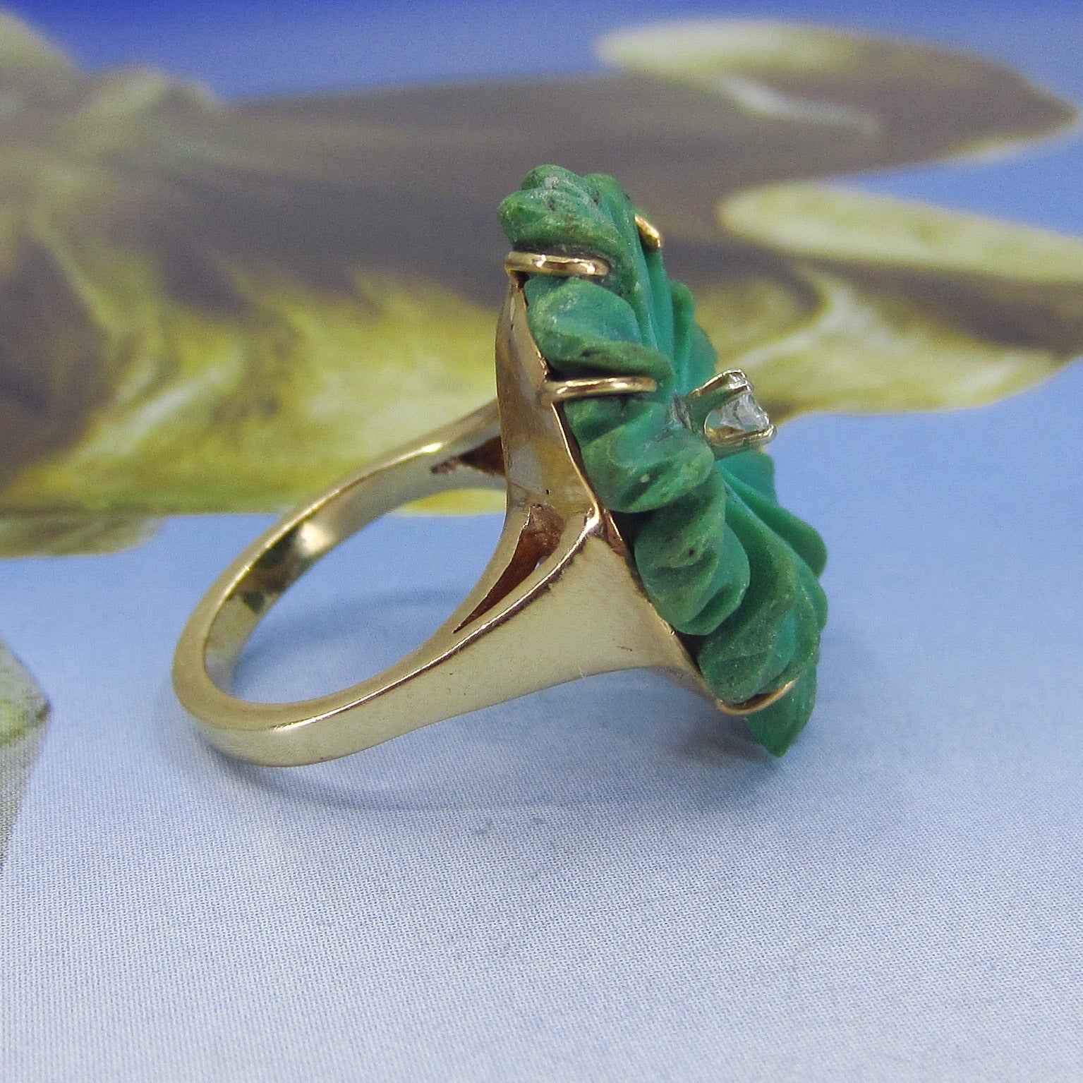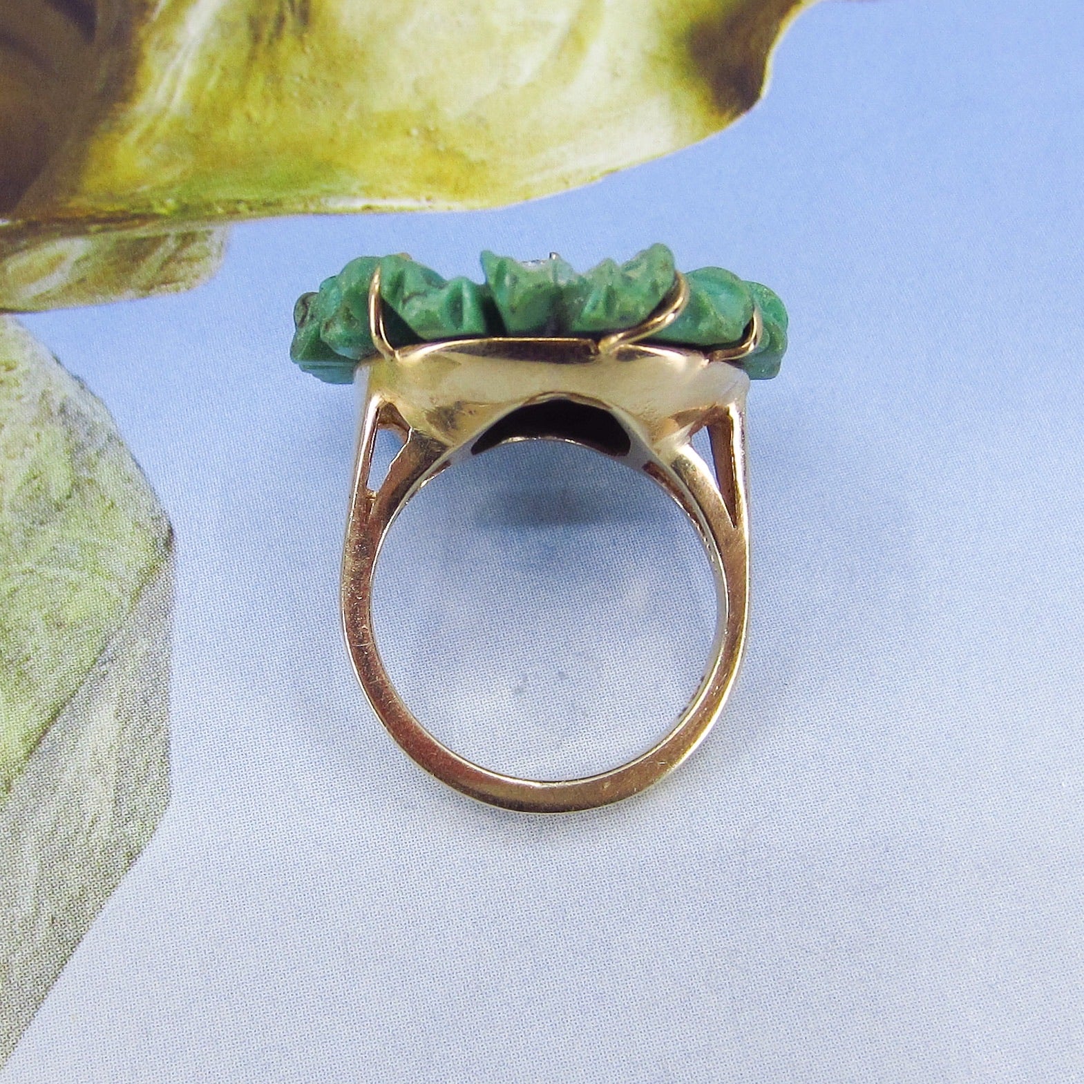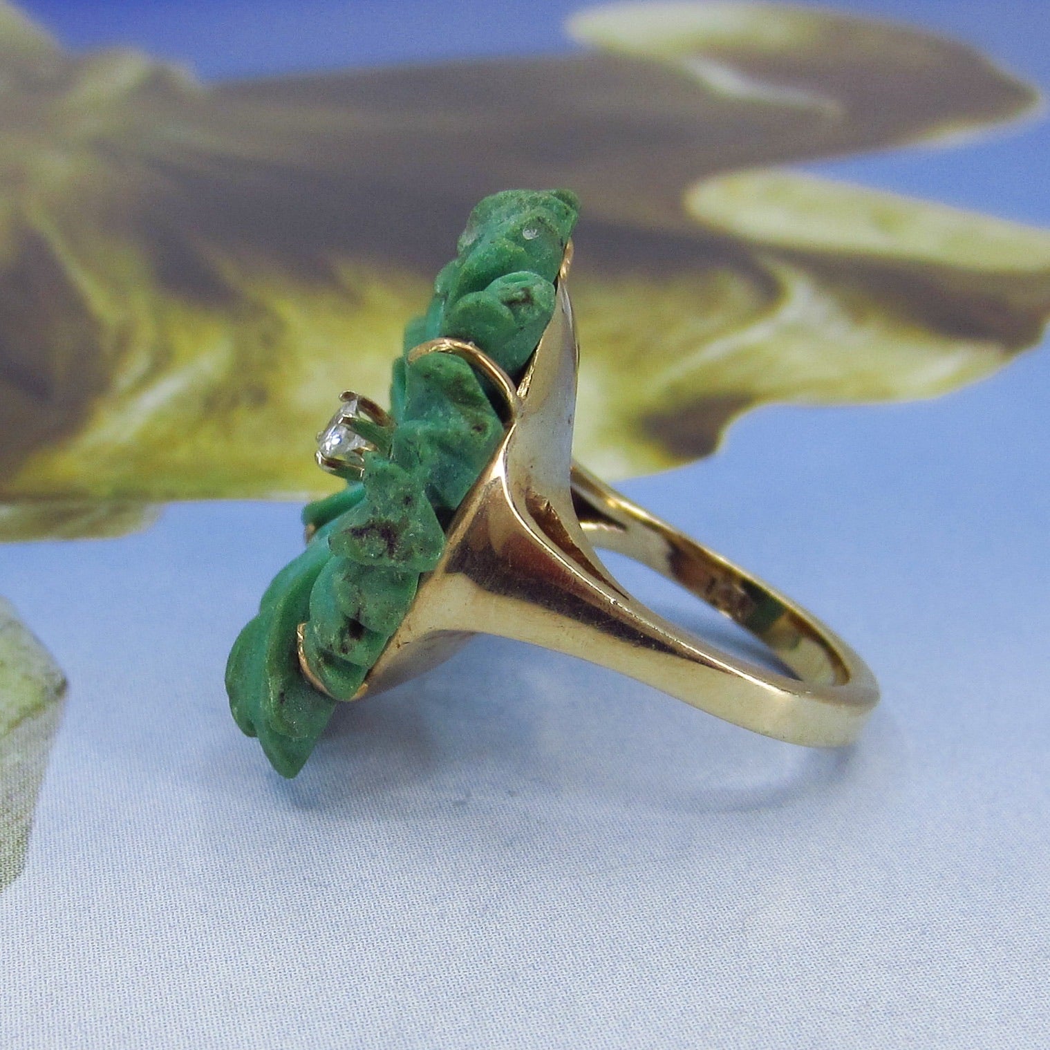 SOLD - Mid-Century Diamond and Carved Aventurine Ring 14k c. 1960