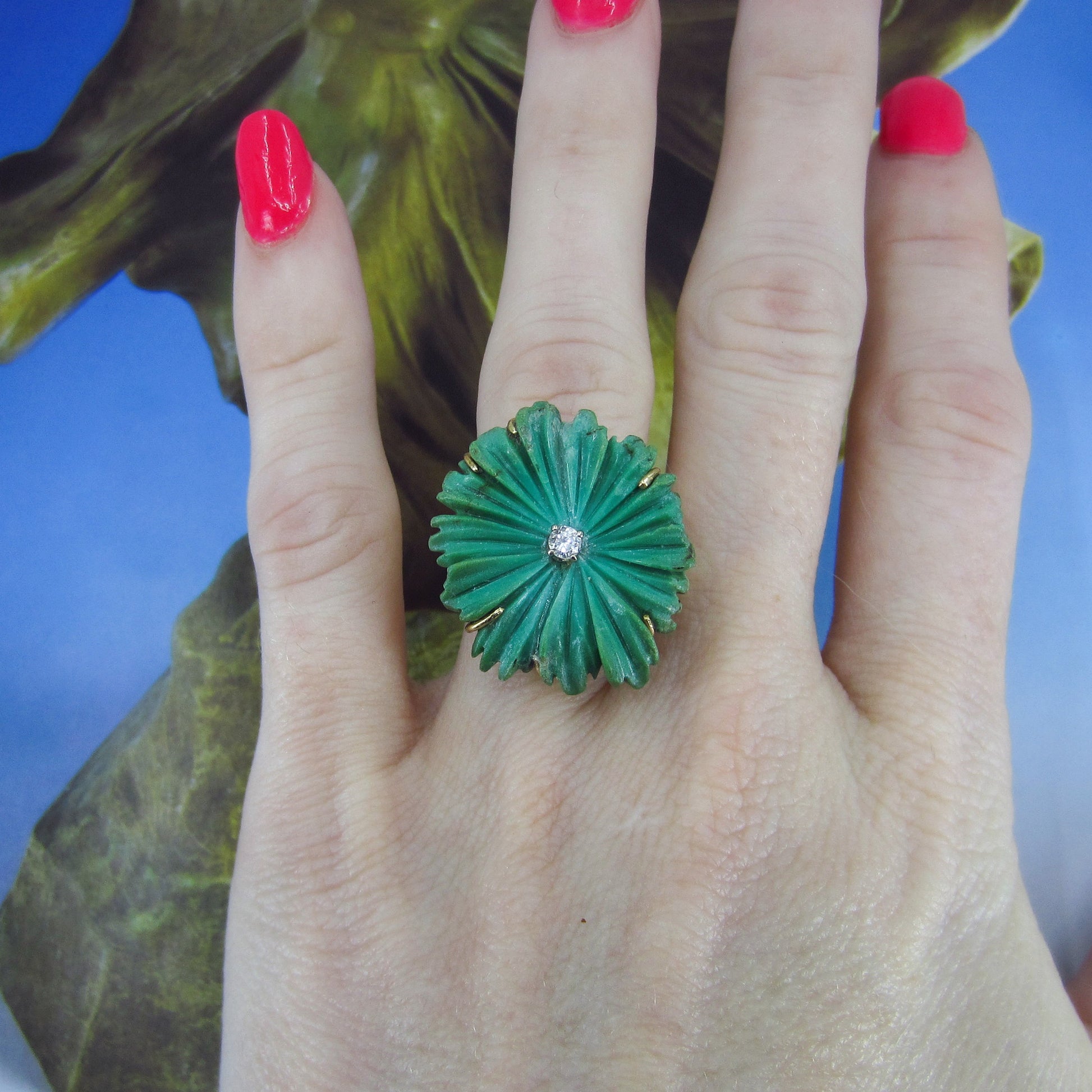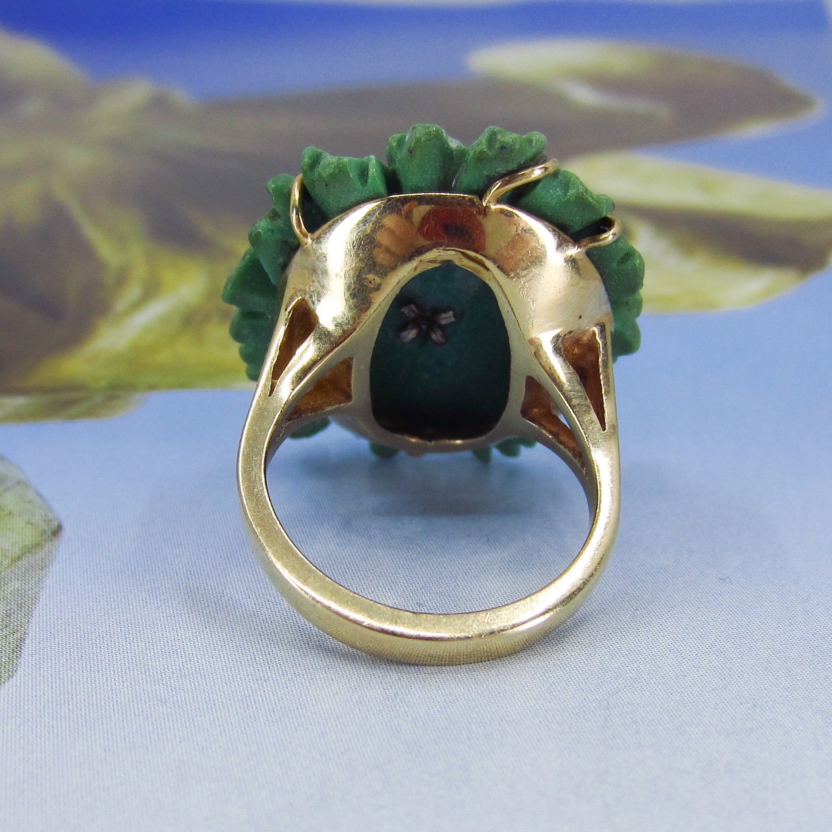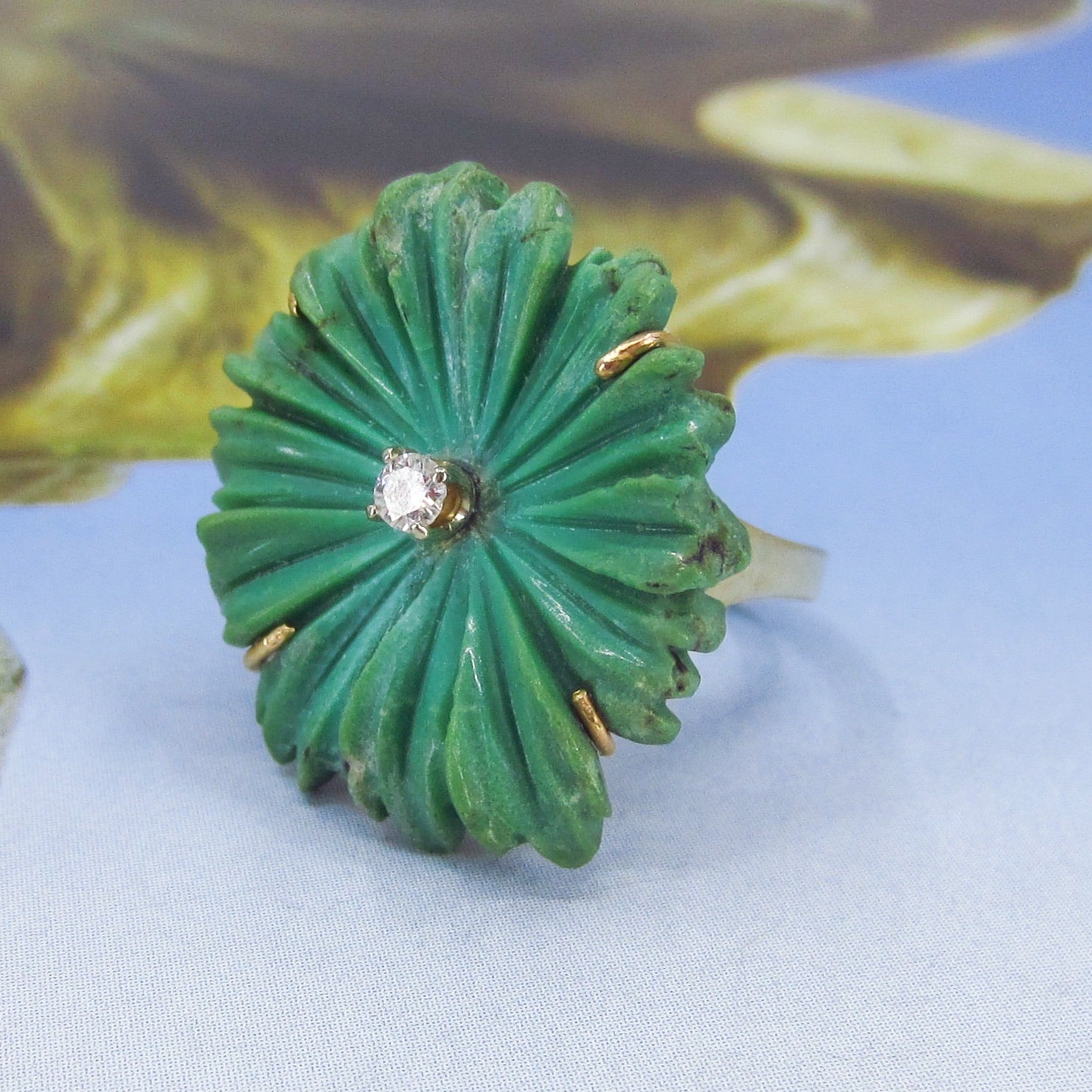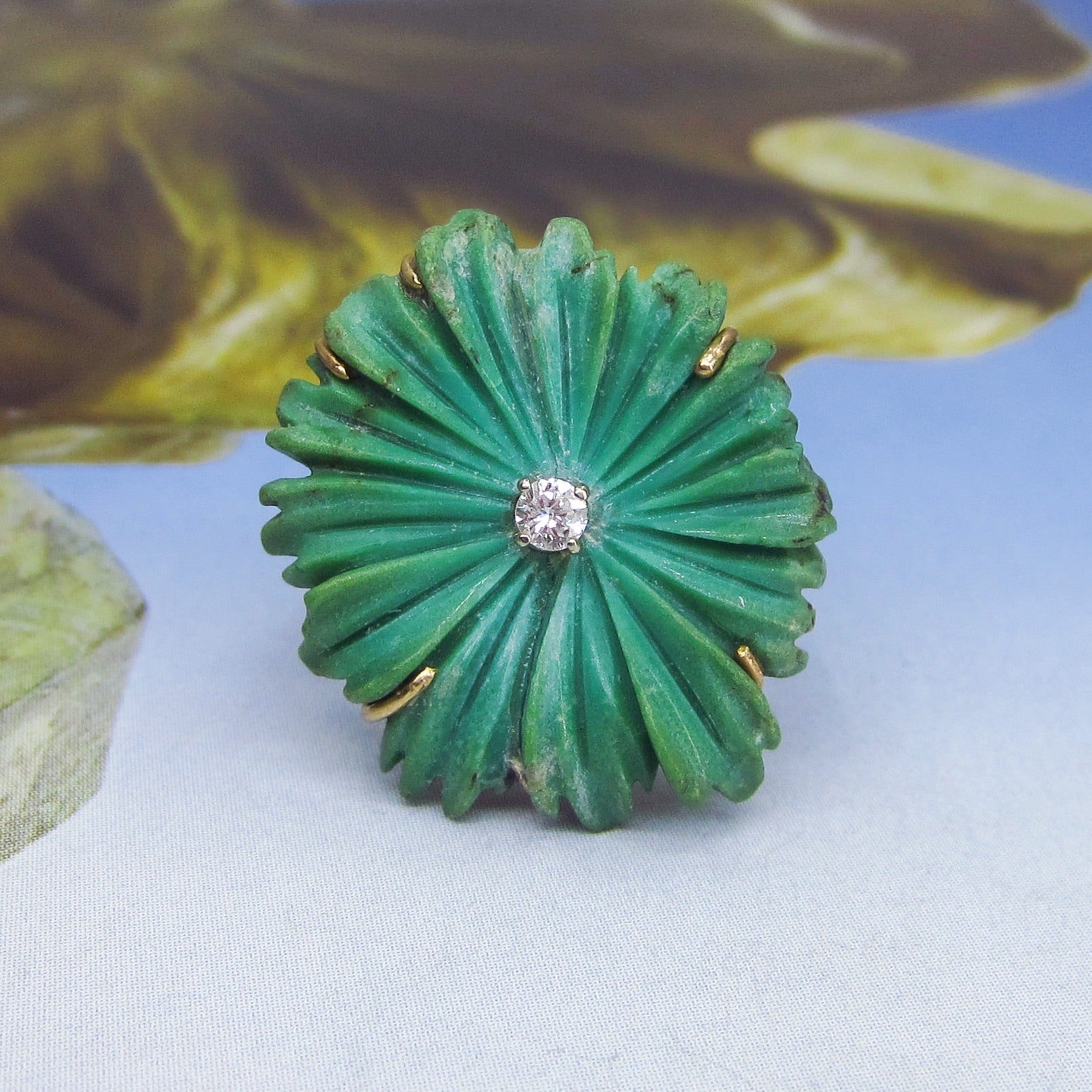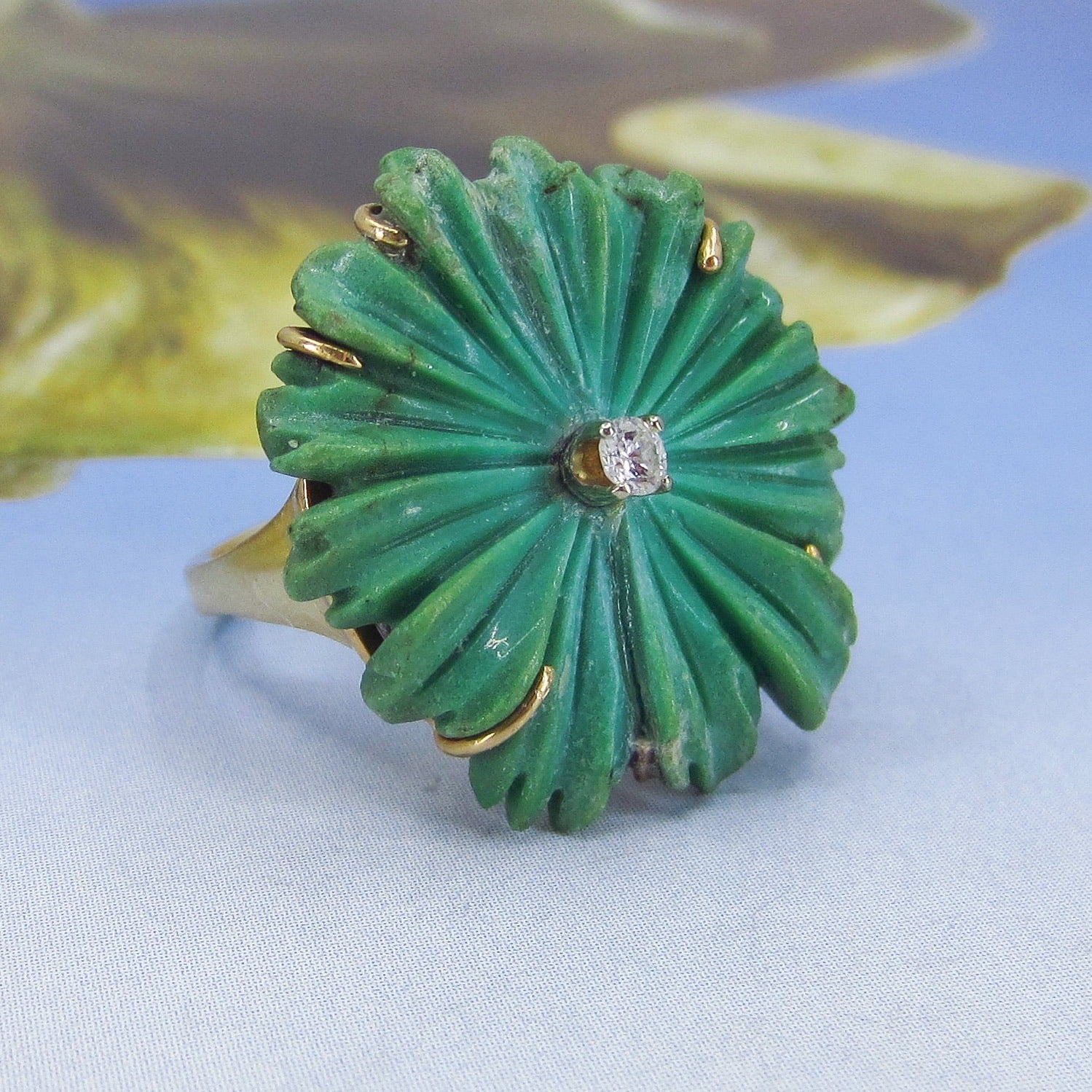 SOLD - Mid-Century Diamond and Carved Aventurine Ring 14k c. 1960