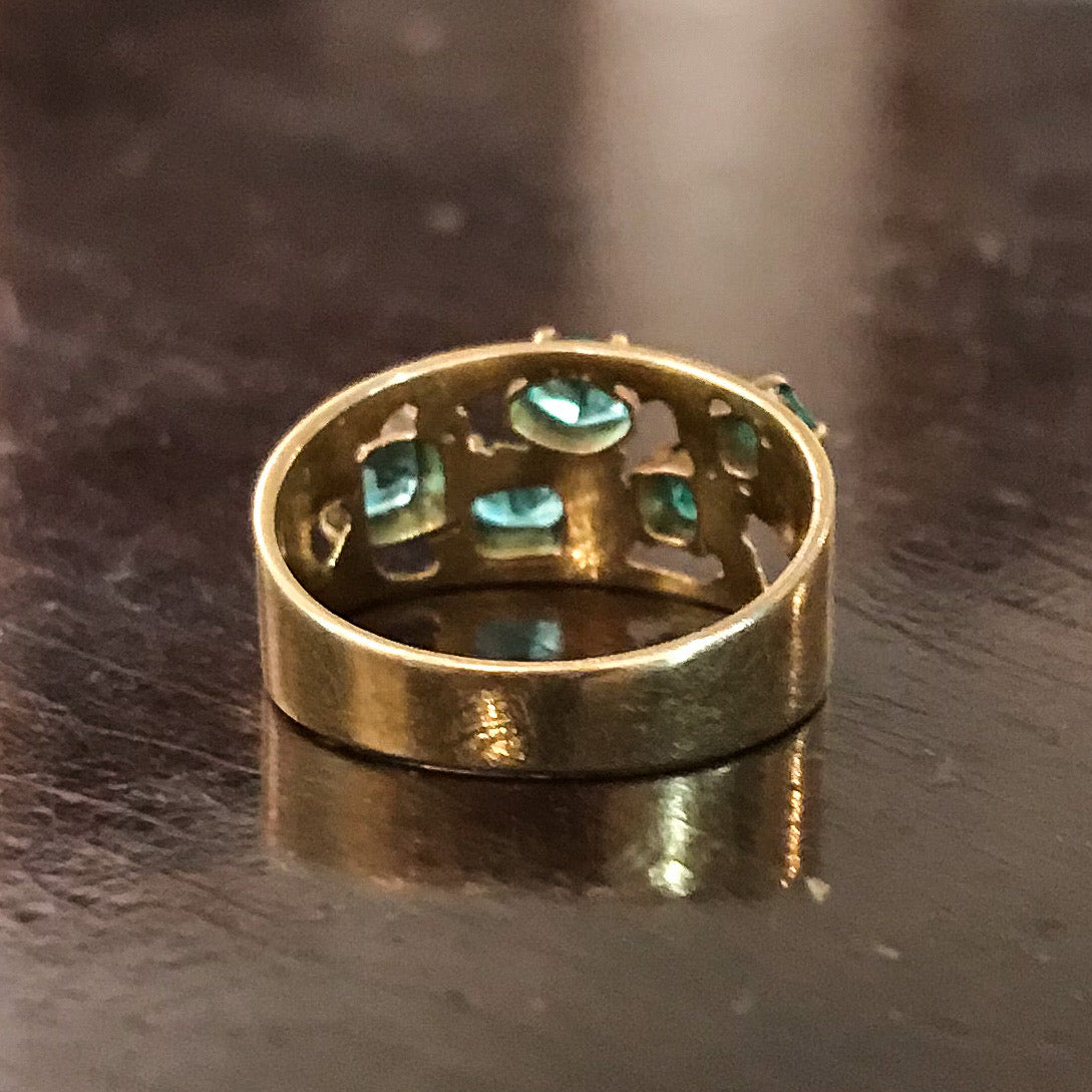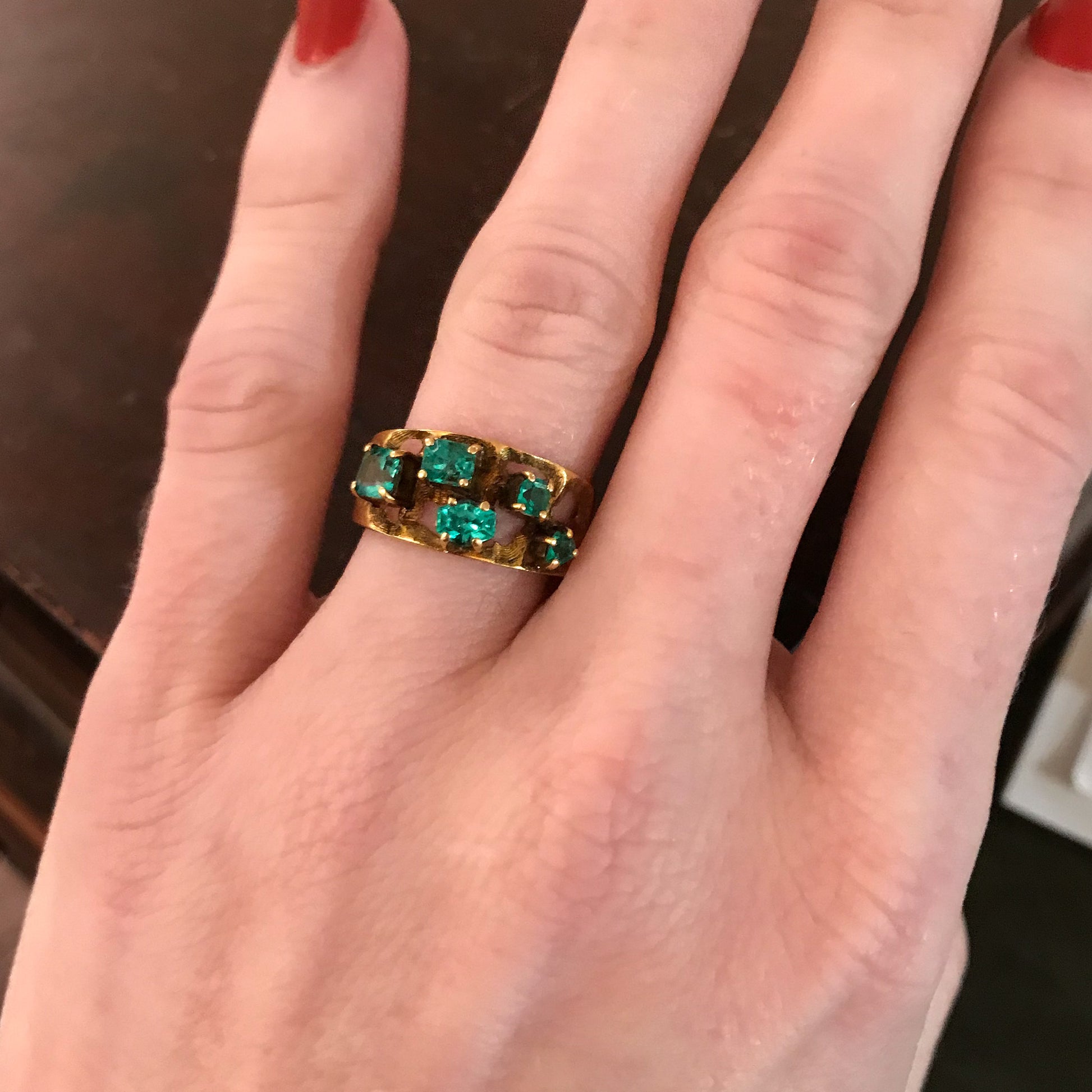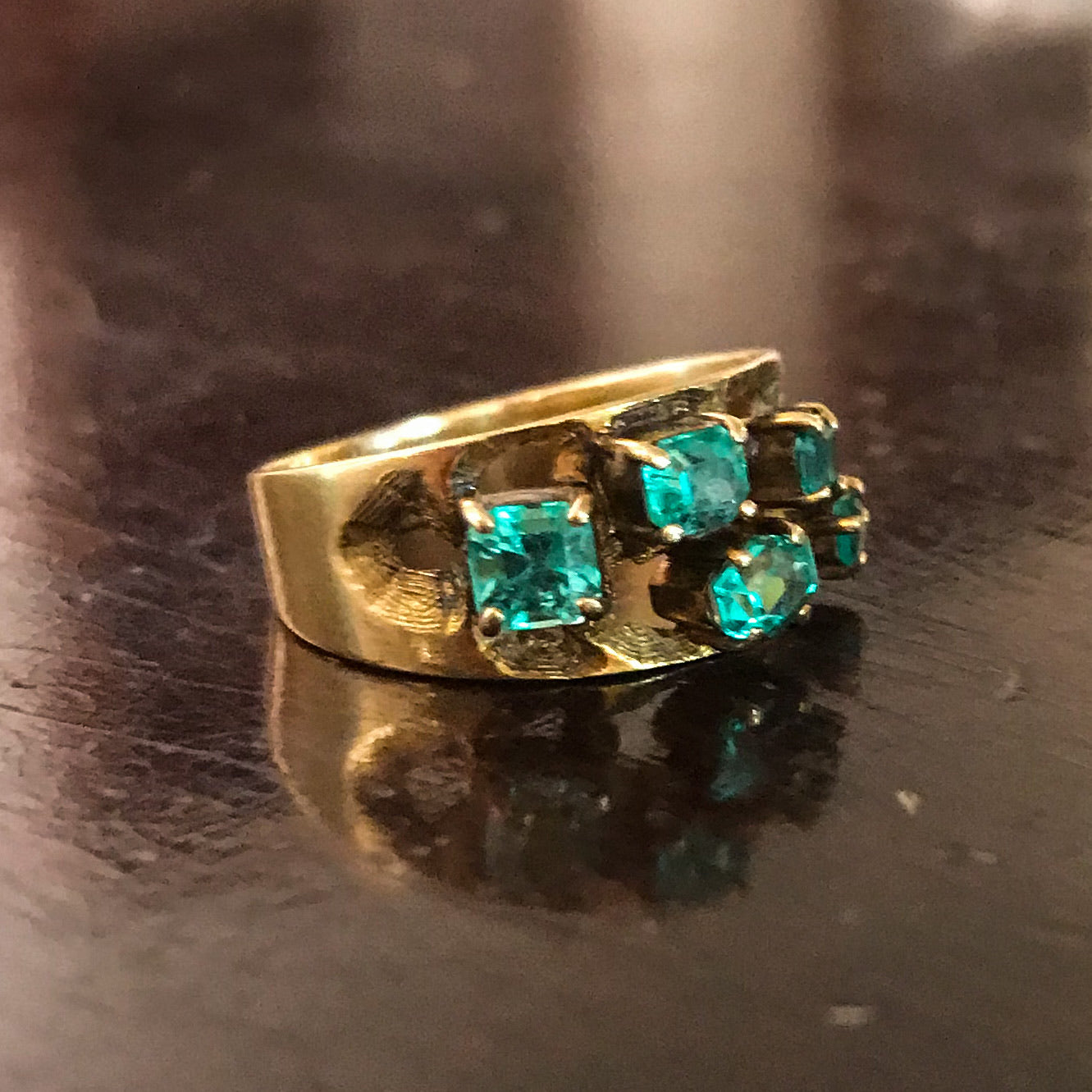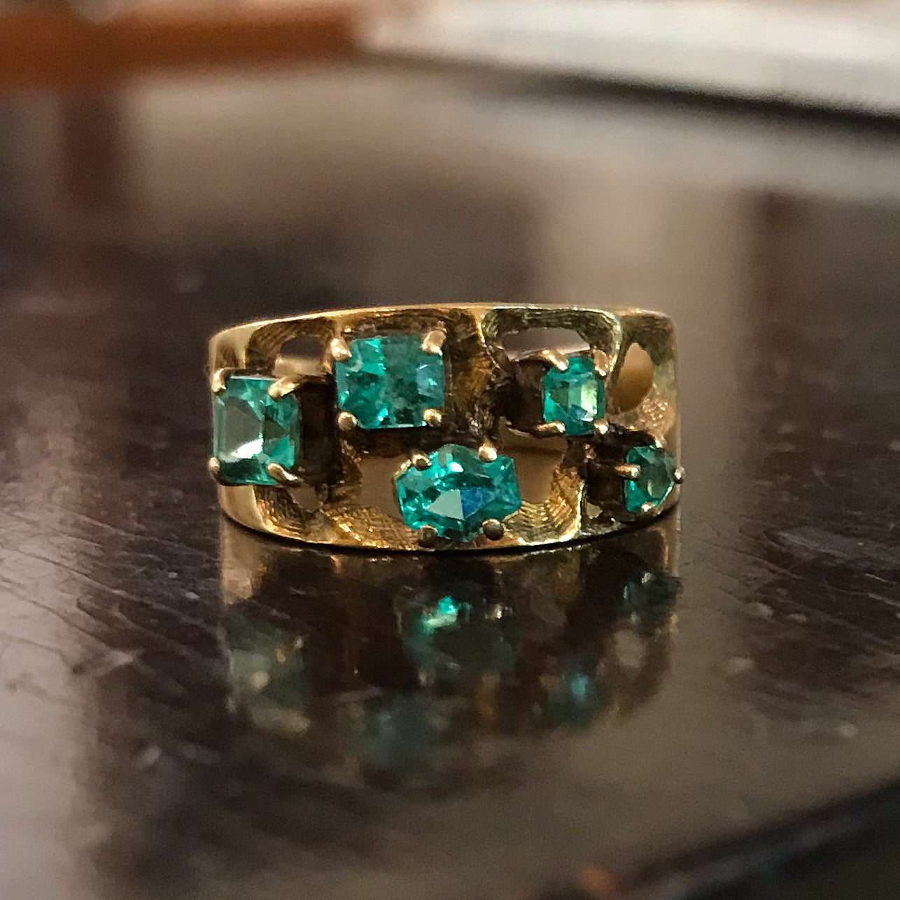 A superb Mid-Century ring circa 1960 with five bright natural emeralds of varying shapes set in an 18k yellow gold textured openwork band.