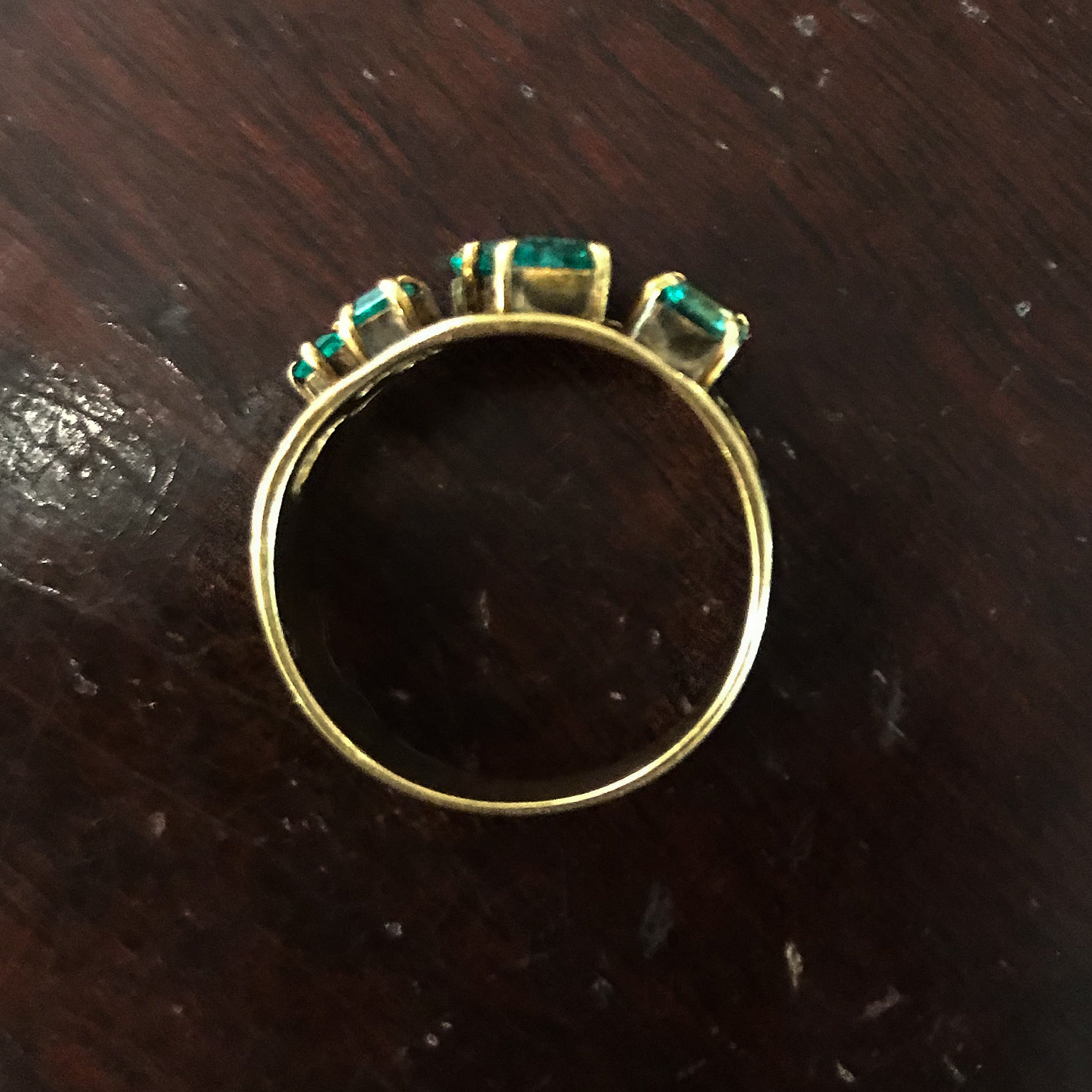Natural emeralds in excellent condition except for one small chip to the corner of the smallest emerald.