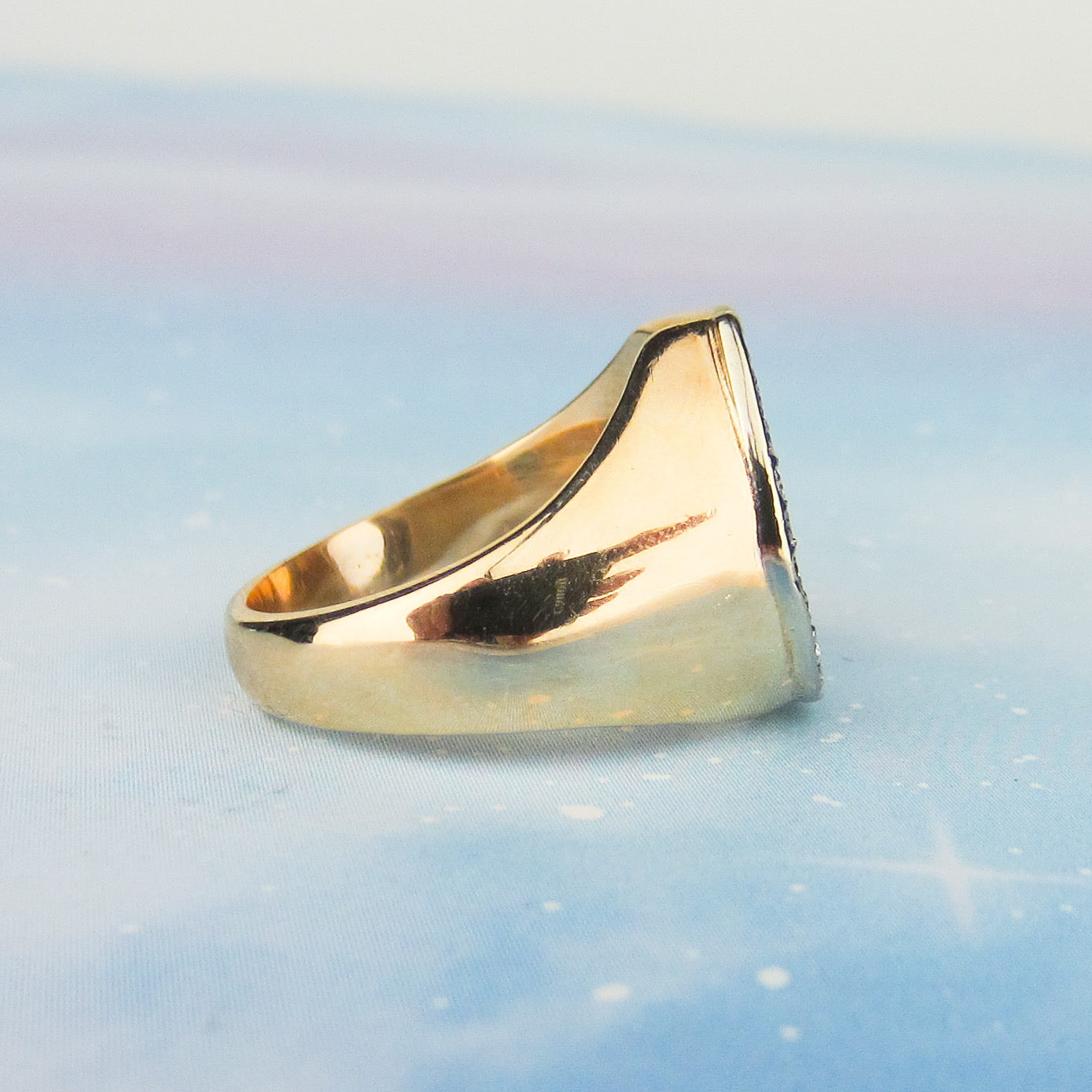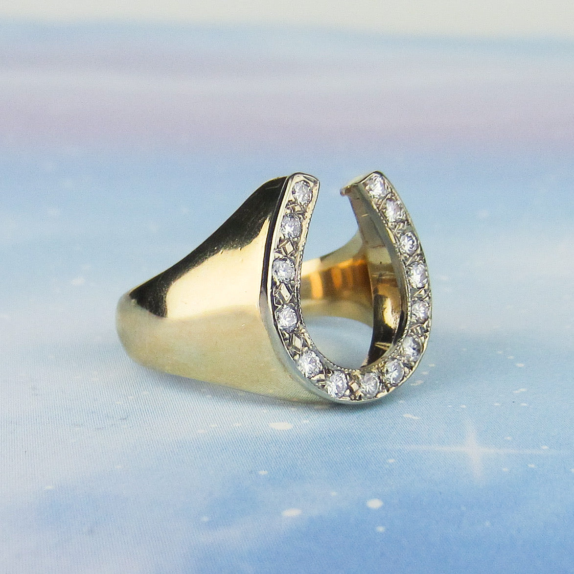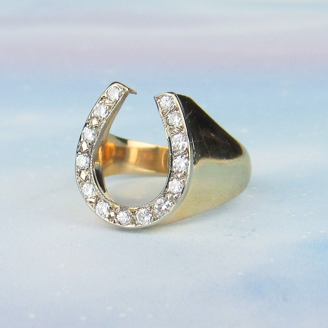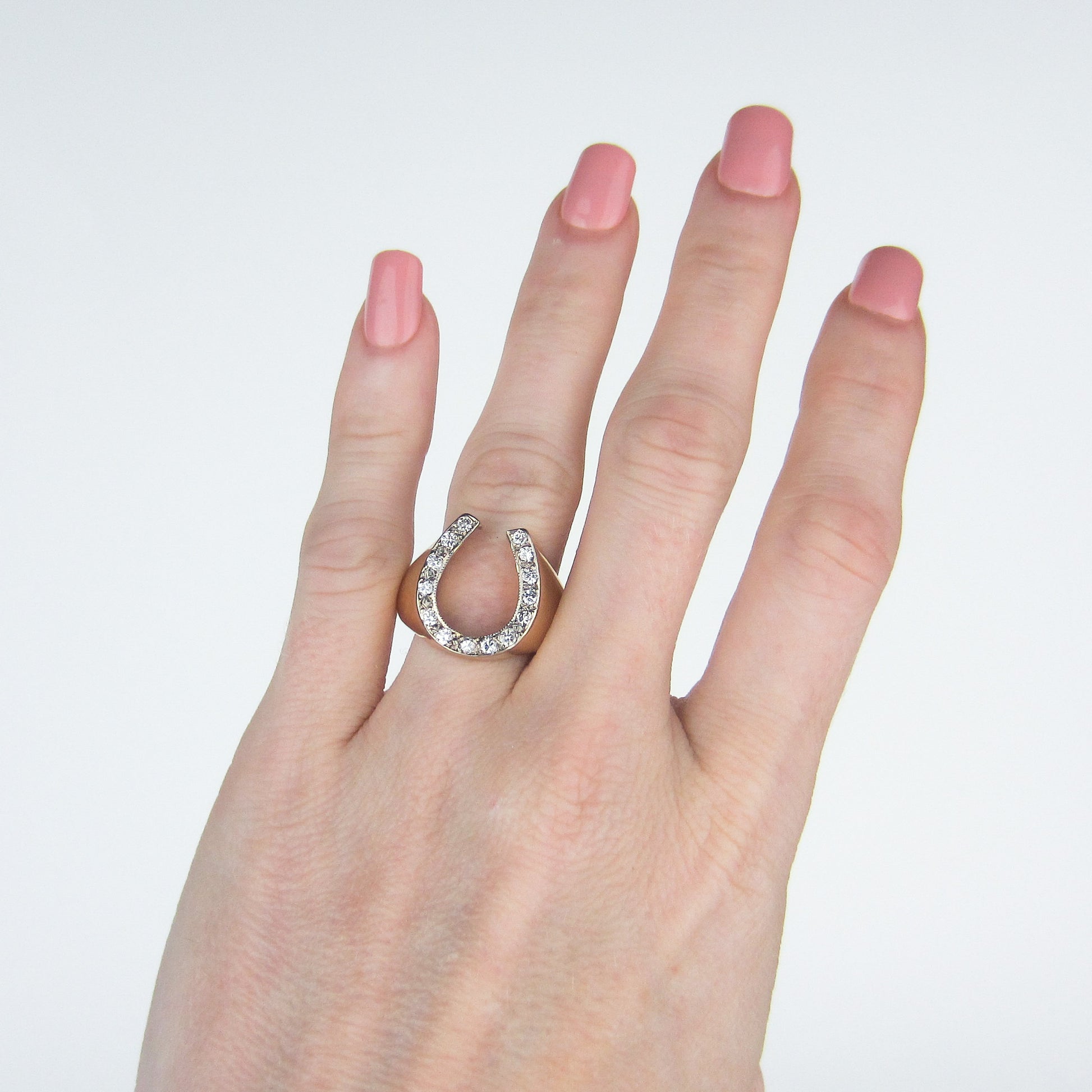 This great ring is a larger version of the classic diamond horseshoe pinky ring worn by men in the Mid-Century period. It contains fourteen Round Brilliant Cut diamonds set in white gold on a 14k yellow gold setting. Big and bold, sparkly and with a nice weight, this ring evokes warms nights in Vegas watching Sinatra, cigar in hand. Could absolutely be worn by a woman now and would be badass!