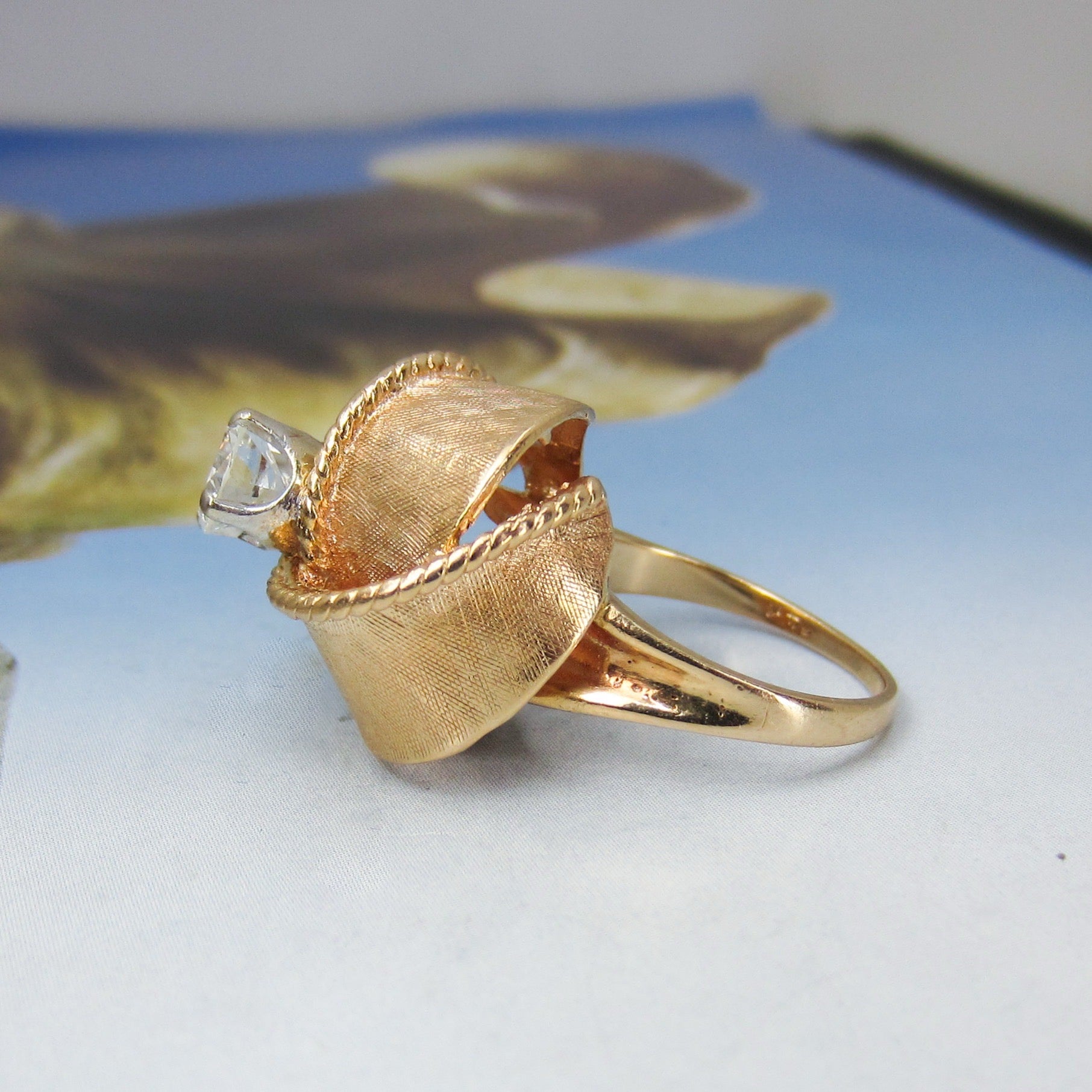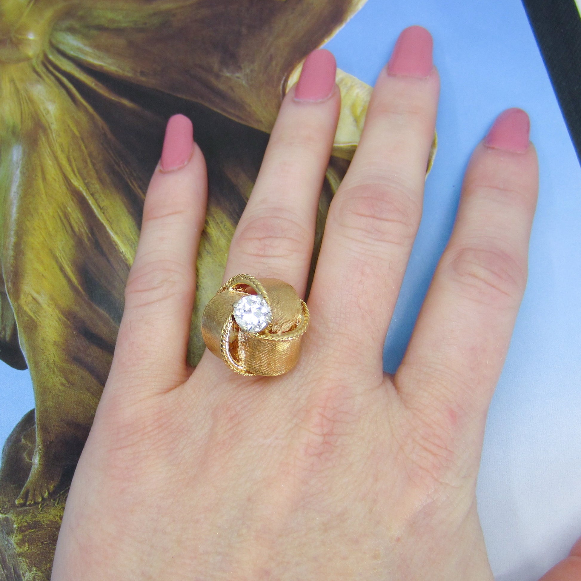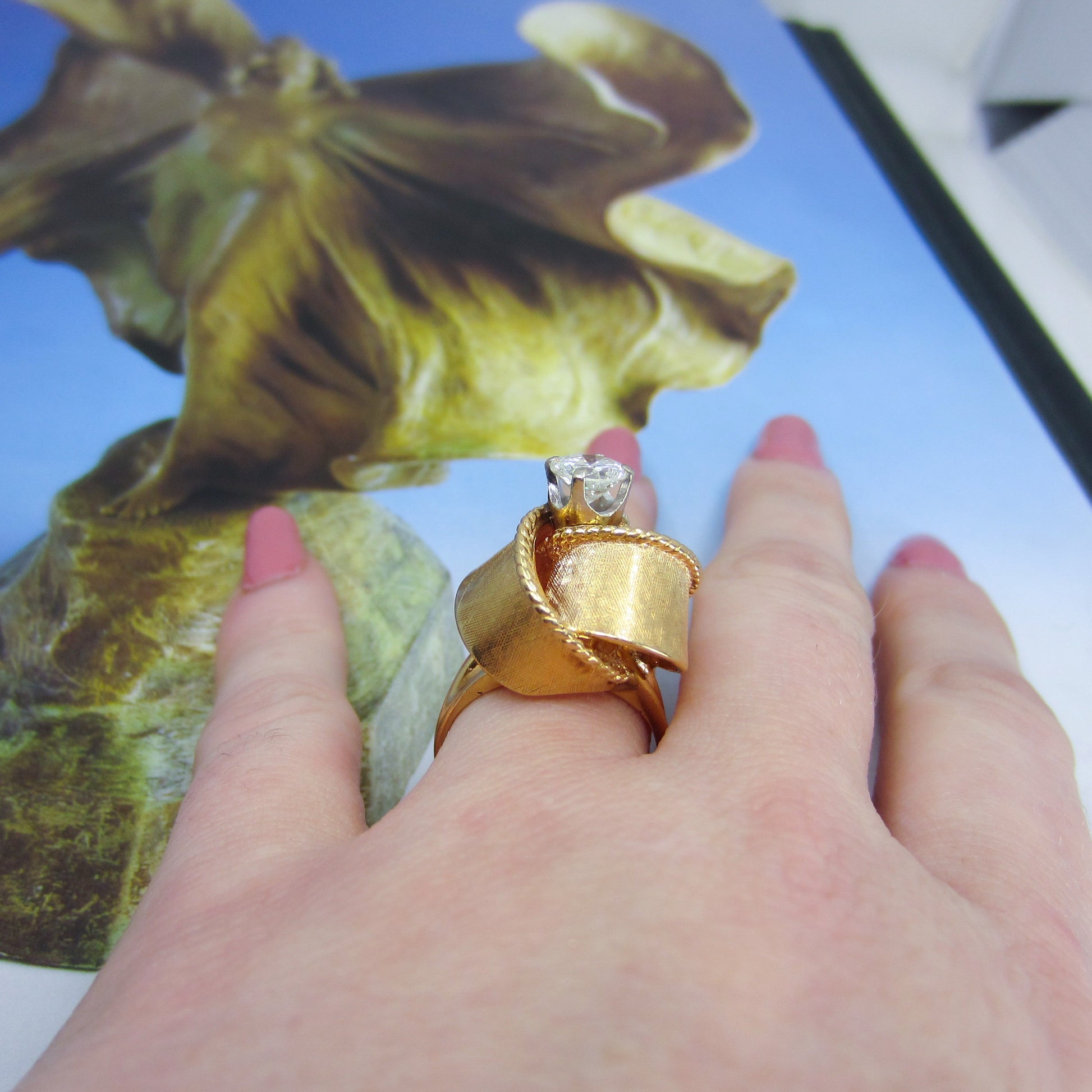 This ring is a custom piece made in the 1950's using an .92ct Old European Cut diamond from an older engagement ring and updated with this one-of-a-kind ribbon motif setting in 14k rosy yellow gold. Yes, this ring is tall! And it will take a special person to choose this as their engagement ring, but I know that the person that does choose this beauty will not be disappointed! It is very well-made and despite the height is sturdy enough to wear all day, every day. This ring is a beautiful, unique piece with lovely energy and if you are at all inclined, come into the store and try it on!