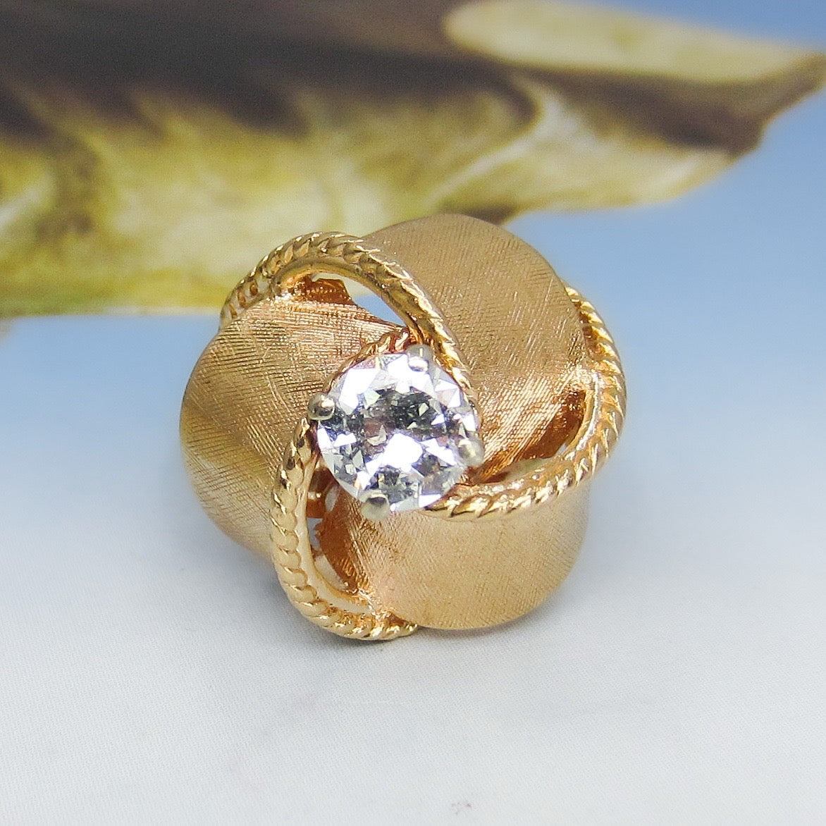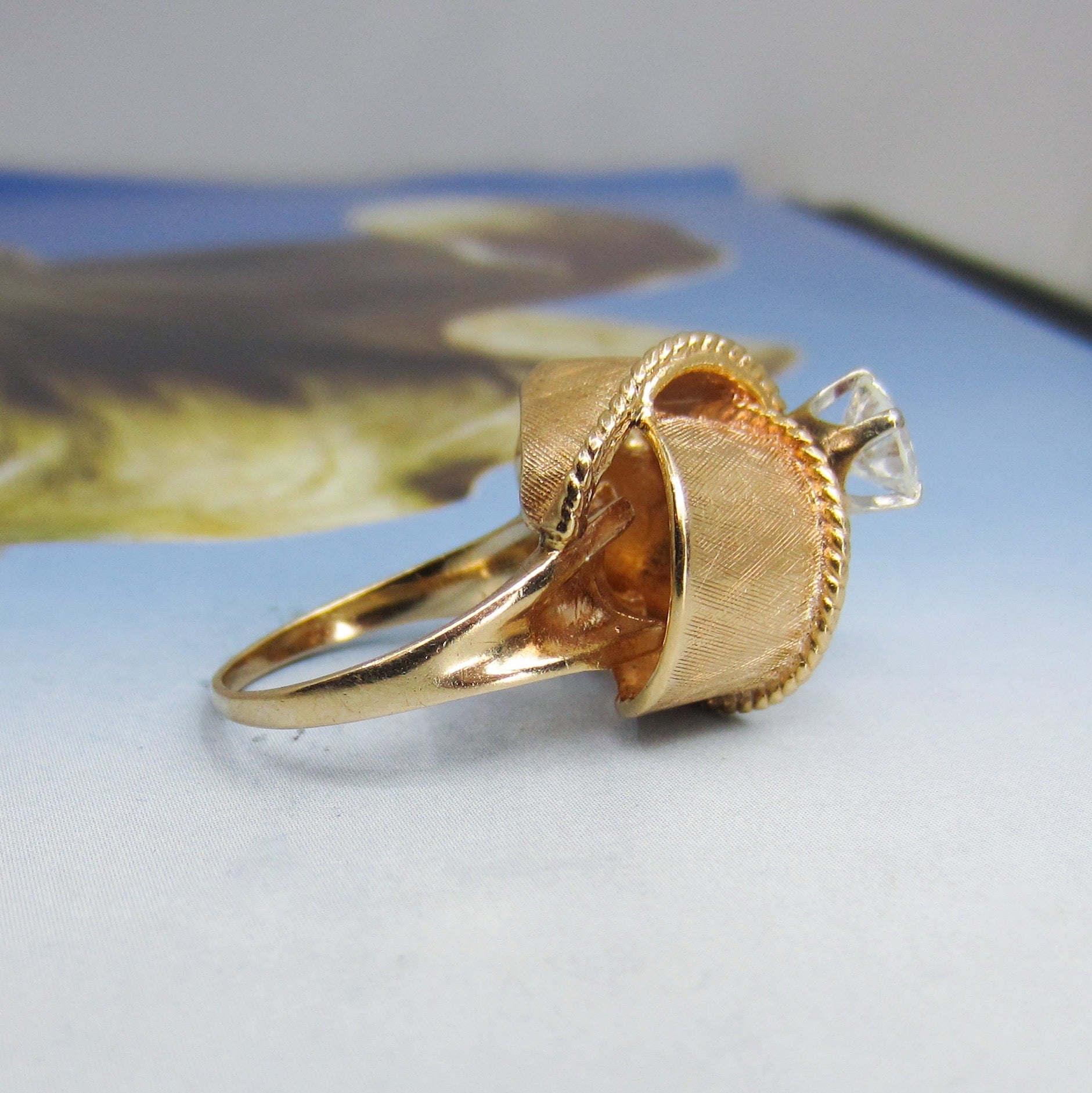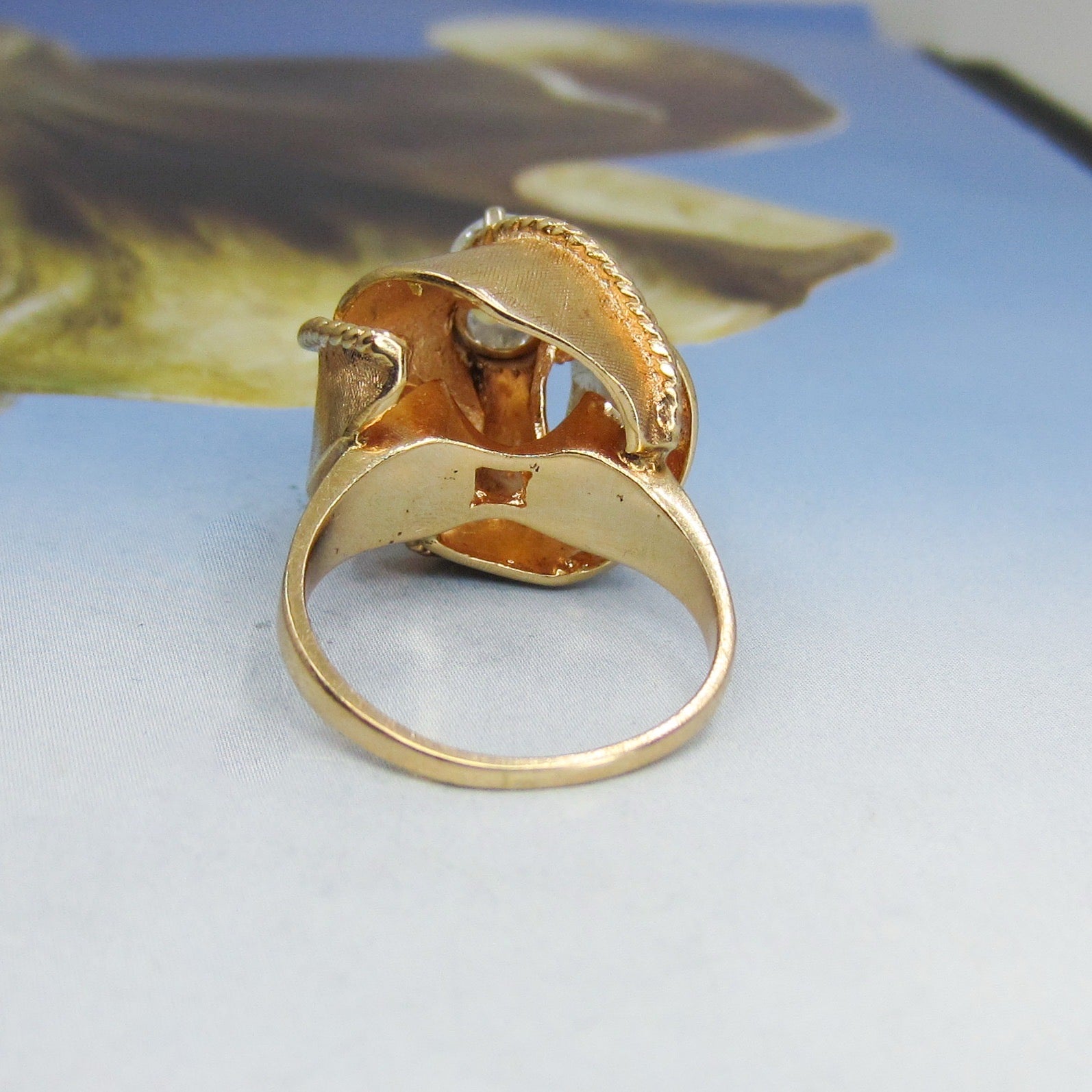 This ring is a custom piece made in the 1950's using an .92ct Old European Cut diamond from an older engagement ring and updated with this one-of-a-kind ribbon motif setting in 14k rosy yellow gold. Yes, this ring is tall! And it will take a special person to choose this as their engagement ring, but I know that the person that does choose this beauty will not be disappointed! It is very well-made and despite the height is sturdy enough to wear all day, every day. This ring is a beautiful, unique piece with lovely energy and if you are at all inclined, come into the store and try it on!