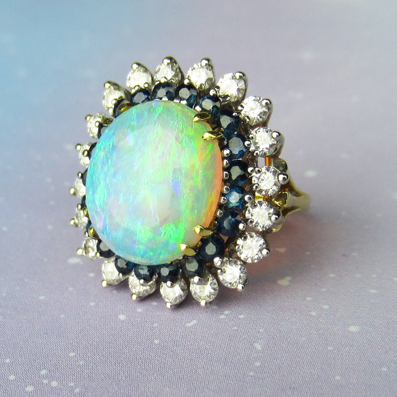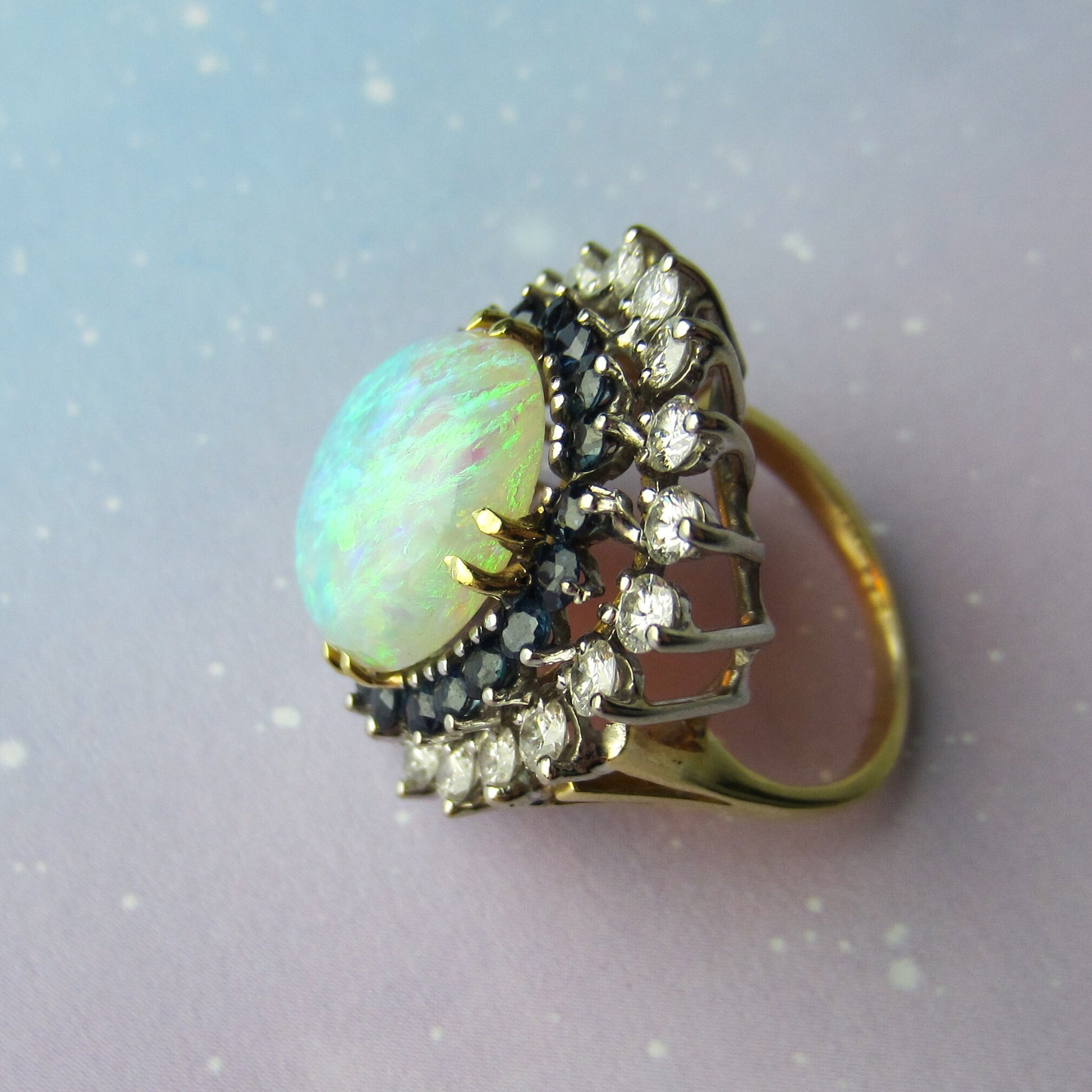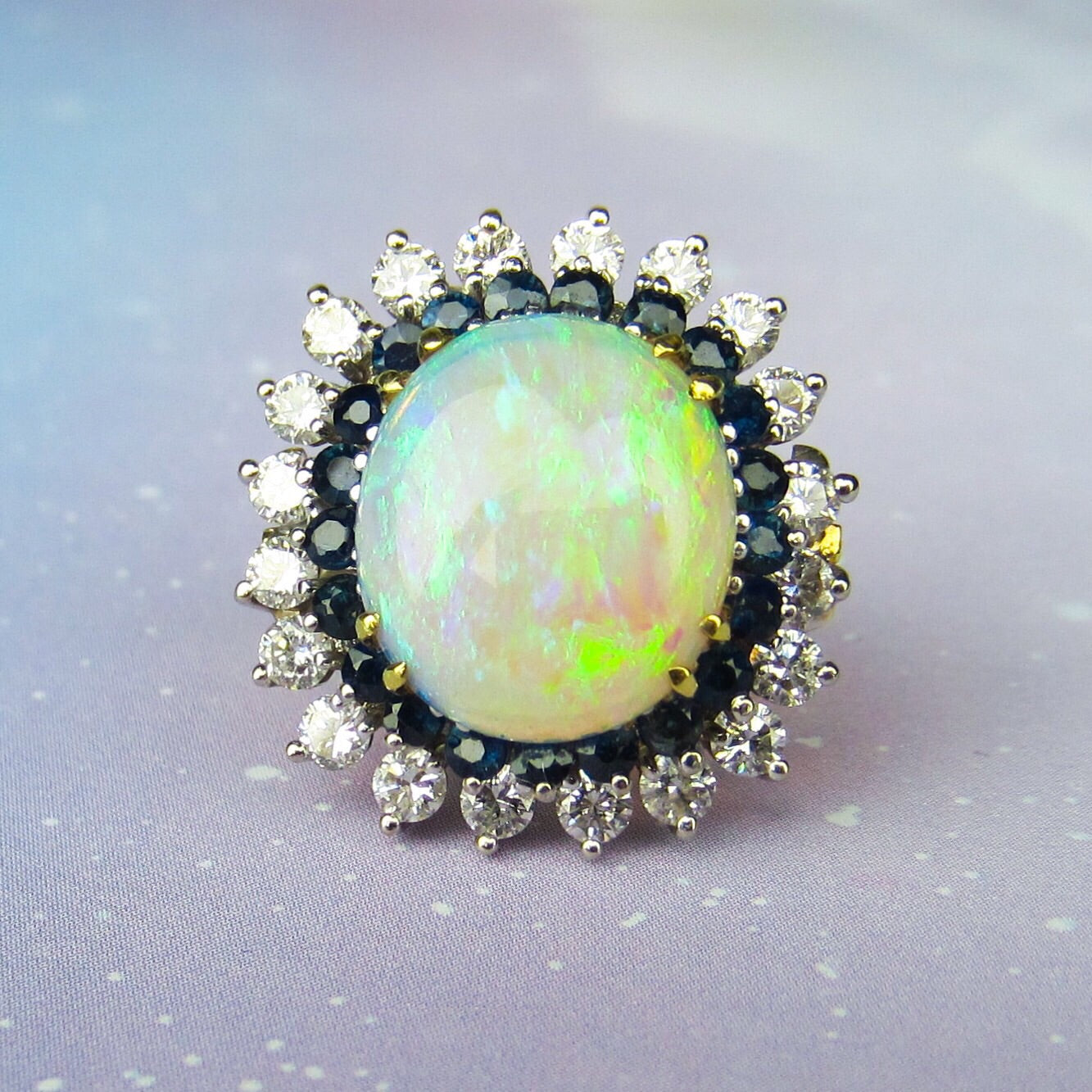 SOLD--Fabulous Mid-Century Opal, Diamond and Sapphire Ring 18k c. 1960