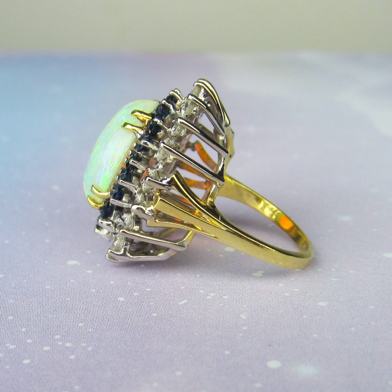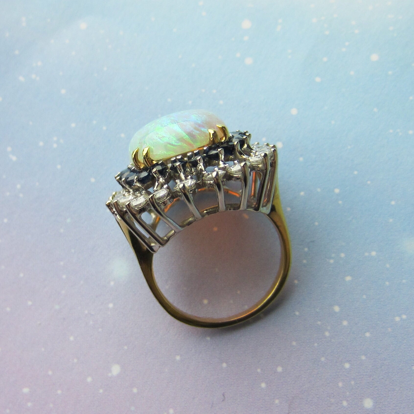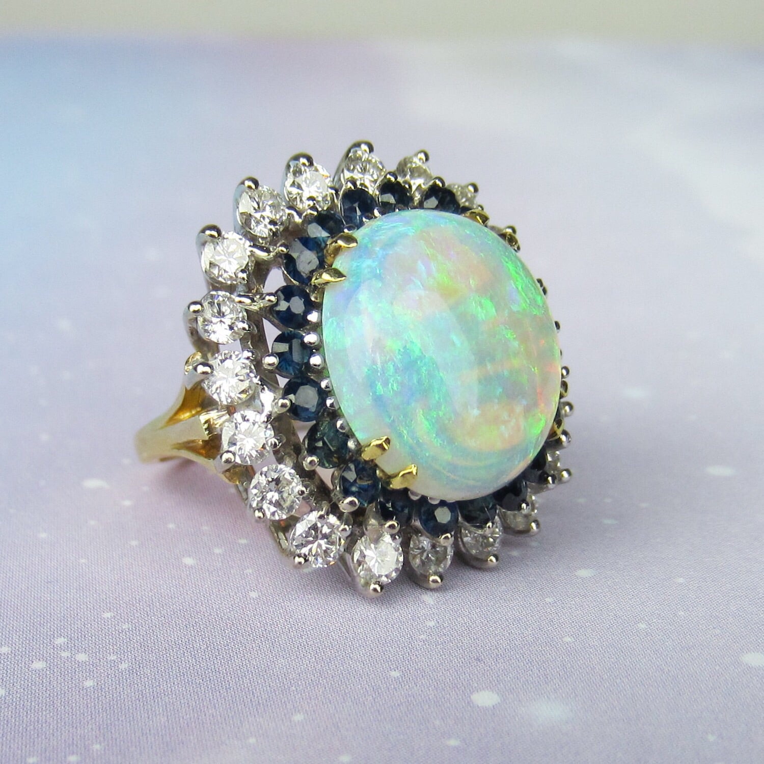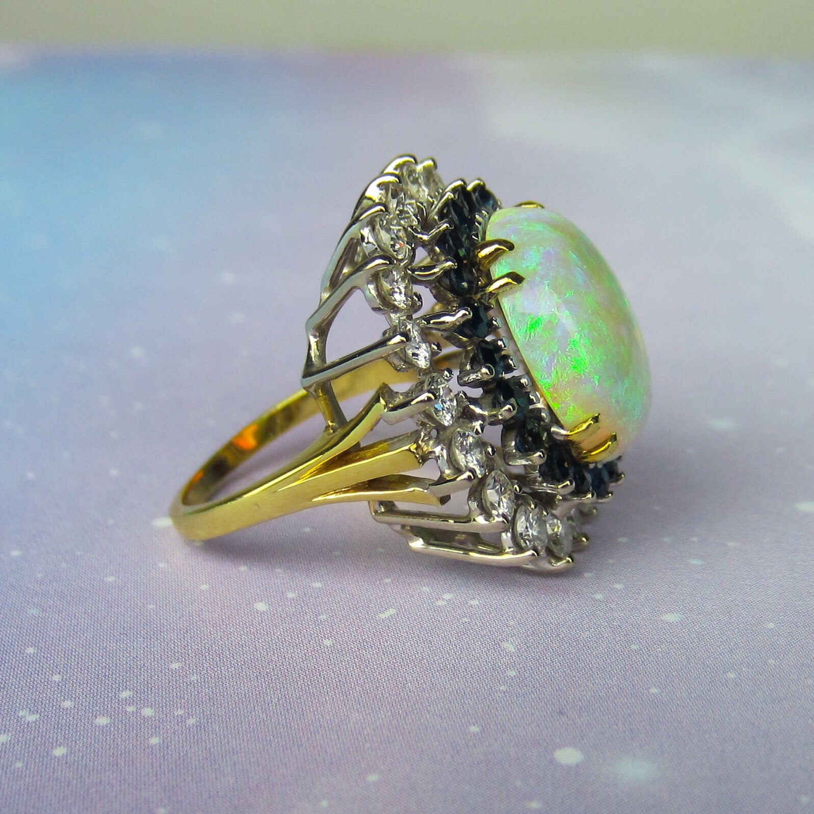 SOLD--Fabulous Mid-Century Opal, Diamond and Sapphire Ring 18k c. 1960