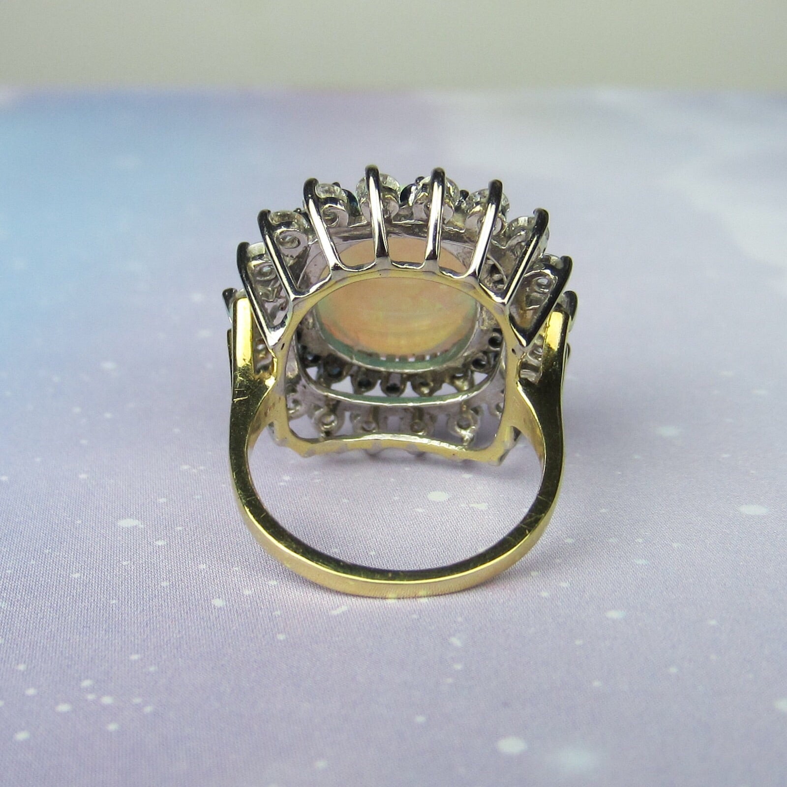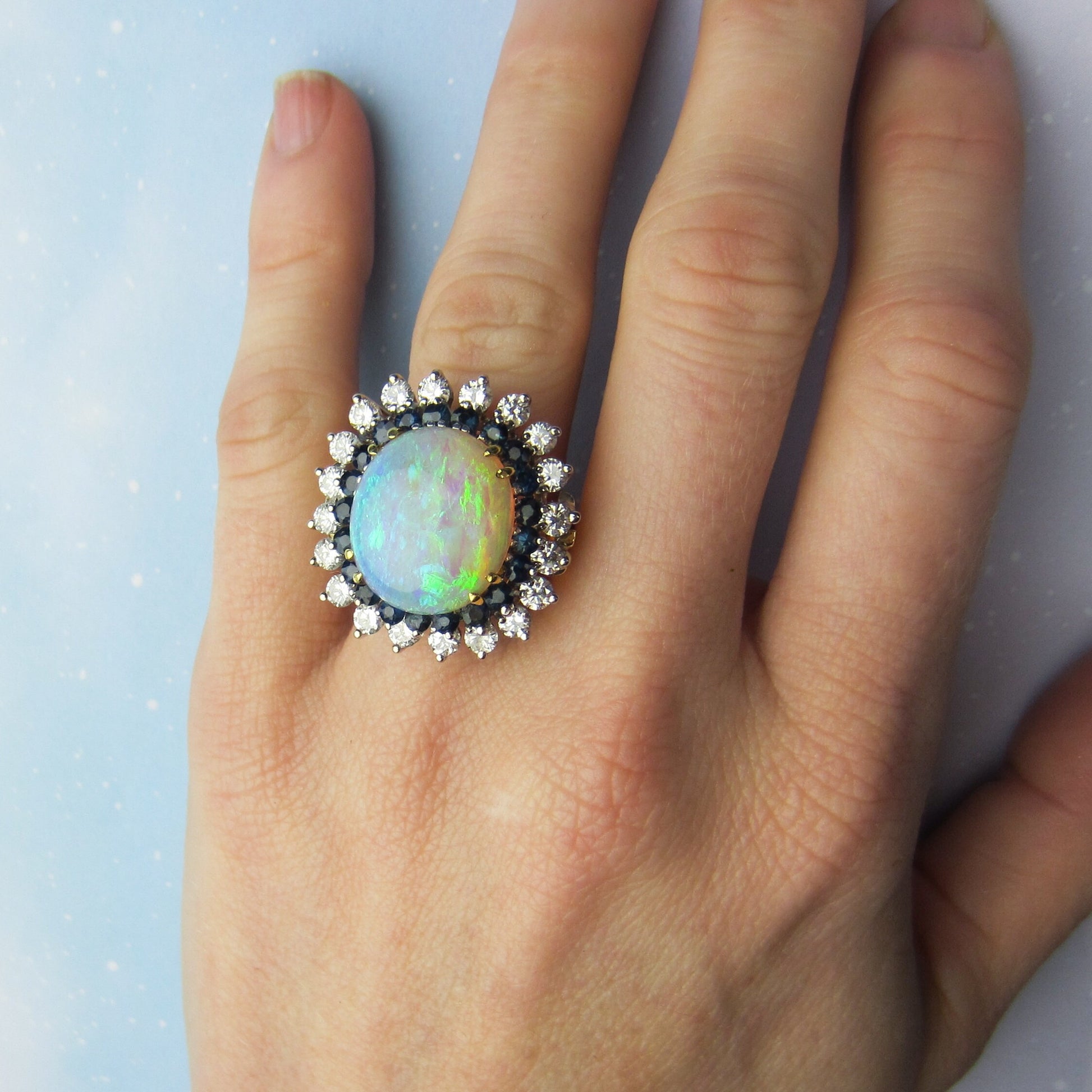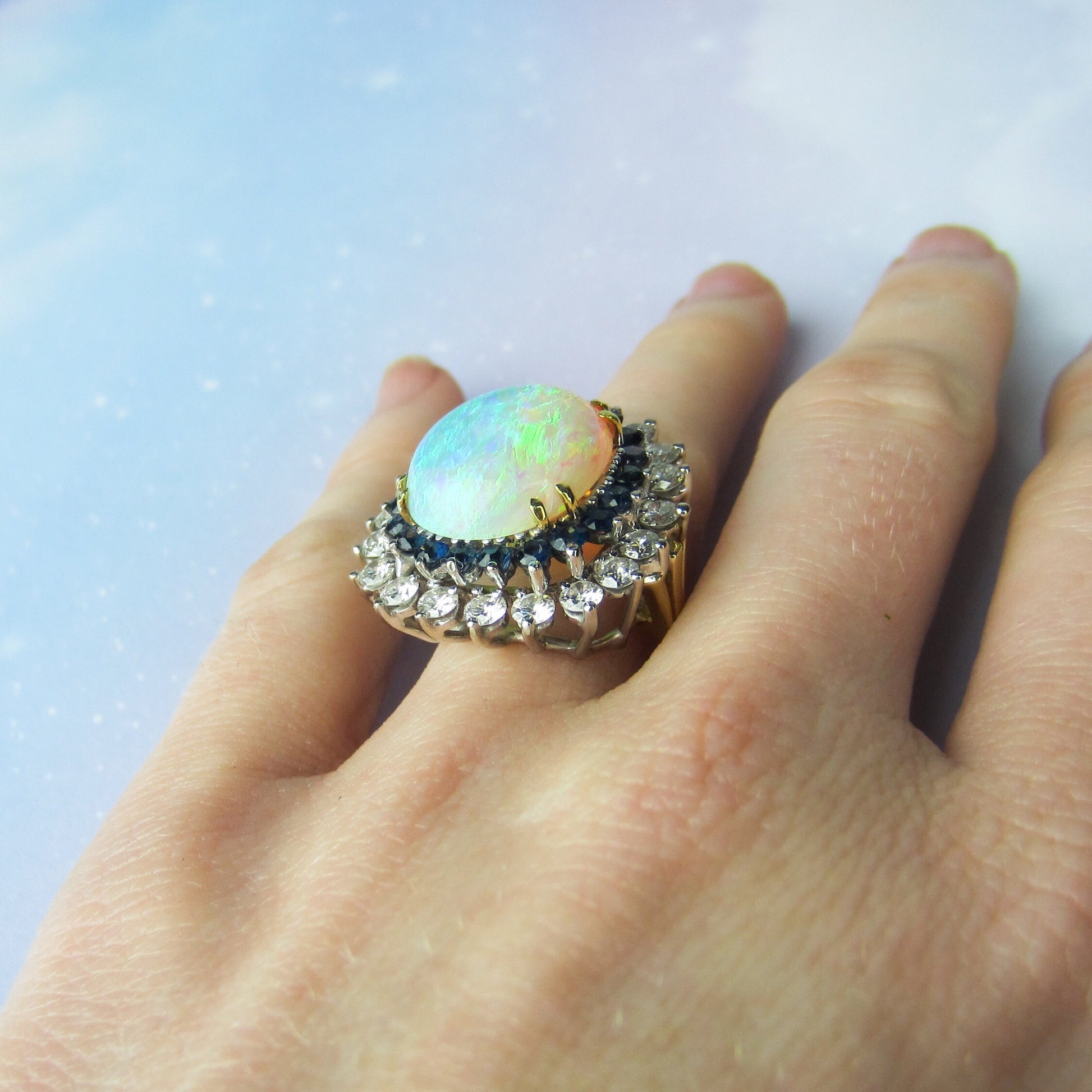 This ring is so gorgeous, this opal so fiery and the size so BIG that you can see this ring across the store--it is the first piece you spot when you walk in the door! This glam ring was made in the 1960's and came from a local estate, it centers a massive natural crystal opal surrounded by round cut natural sapphires which are then surrounded by a sparkling frame of diamonds. Put this ring on and tell me it isn't one of the most beautiful rings you've ever seen. Think it's too tall? You won't care. This opal is so beautiful it looks like it came from outer space. This ring is a true stunner in every respect and I strongly recommend coming in to see it in person if you are at all inclined because it is waaaaay better than the photos!