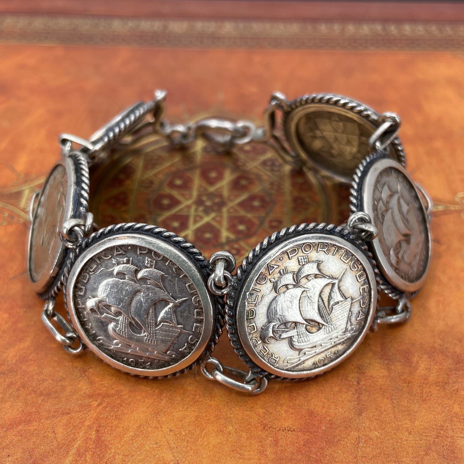 Look at this crazy cool bracelet! Six Portuguese 2.5 Escudos silver coins dated 1951 are set in roped bezels, creating a graphic, kitschy Mid-Century look. And the coins themselves are just beautiful, with Portuguese galleons on the front and the coat of arms of Portugal on the reverse. Solidly made with a nice weighty feel, this can be your everyday signature bracelet that NOONE else will have!