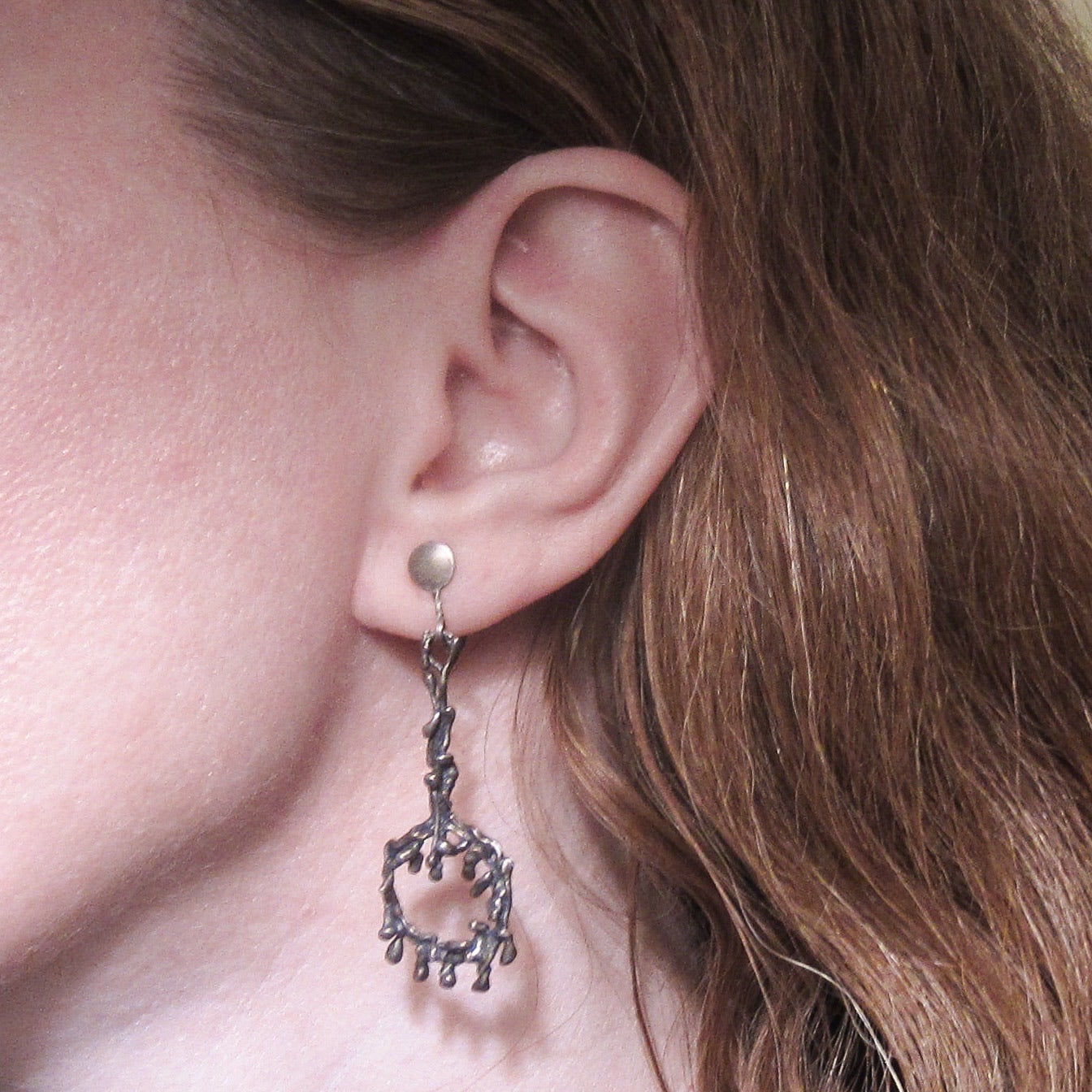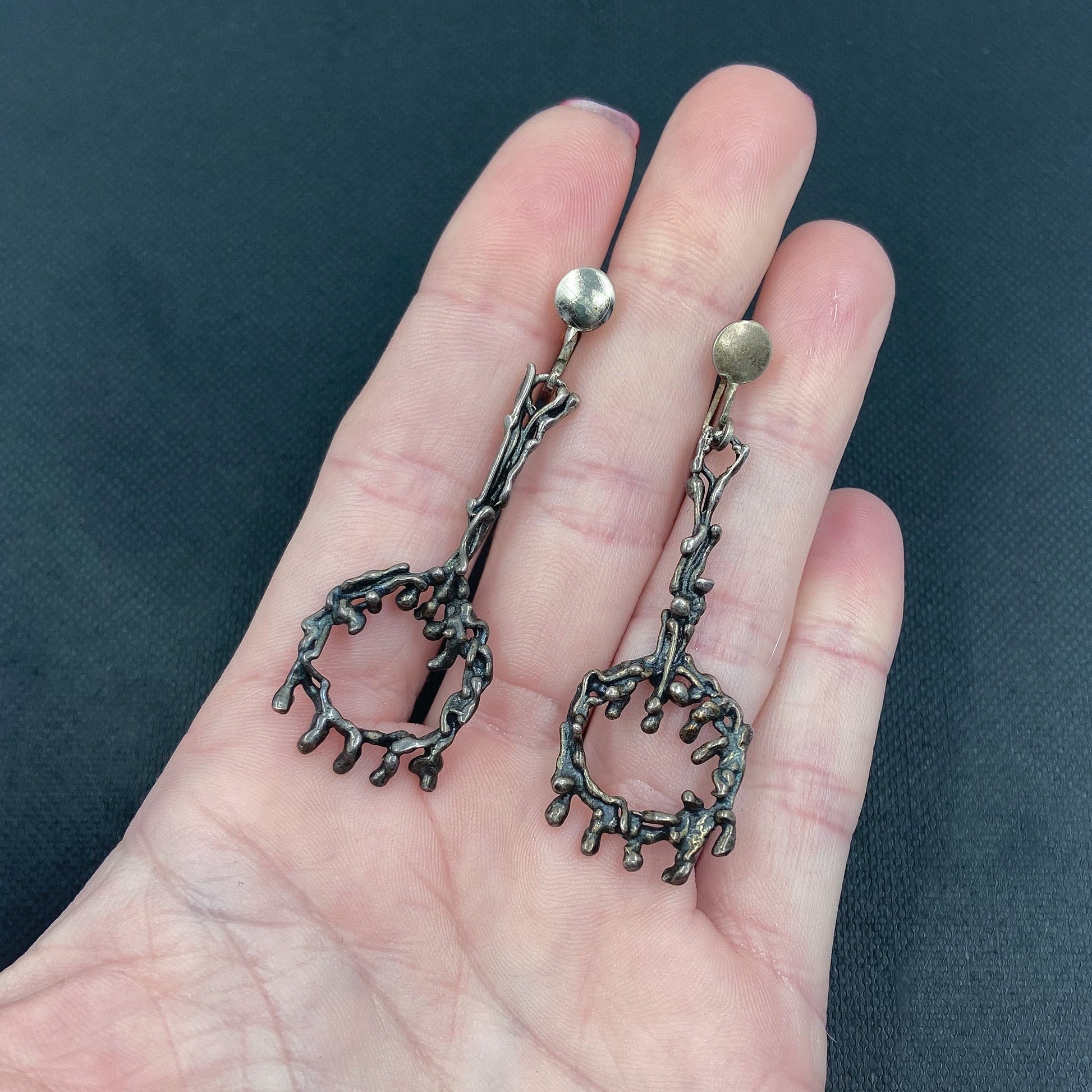 A fabulous pair of Brutalist drop earrings, made in a drippy, organic design in sterling silver circa 1960. Sadly these are unsigned so we can't give credit to this talented artist!