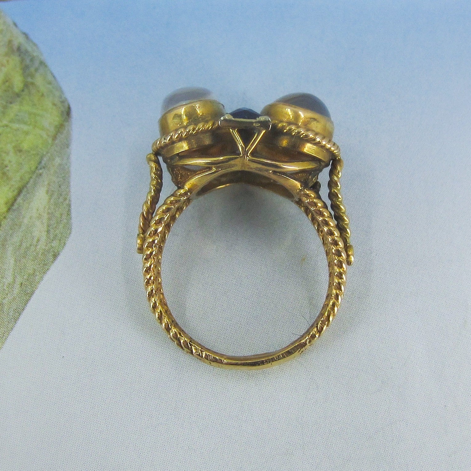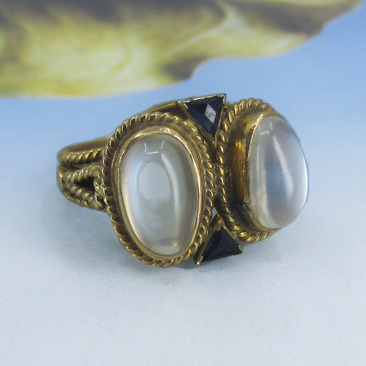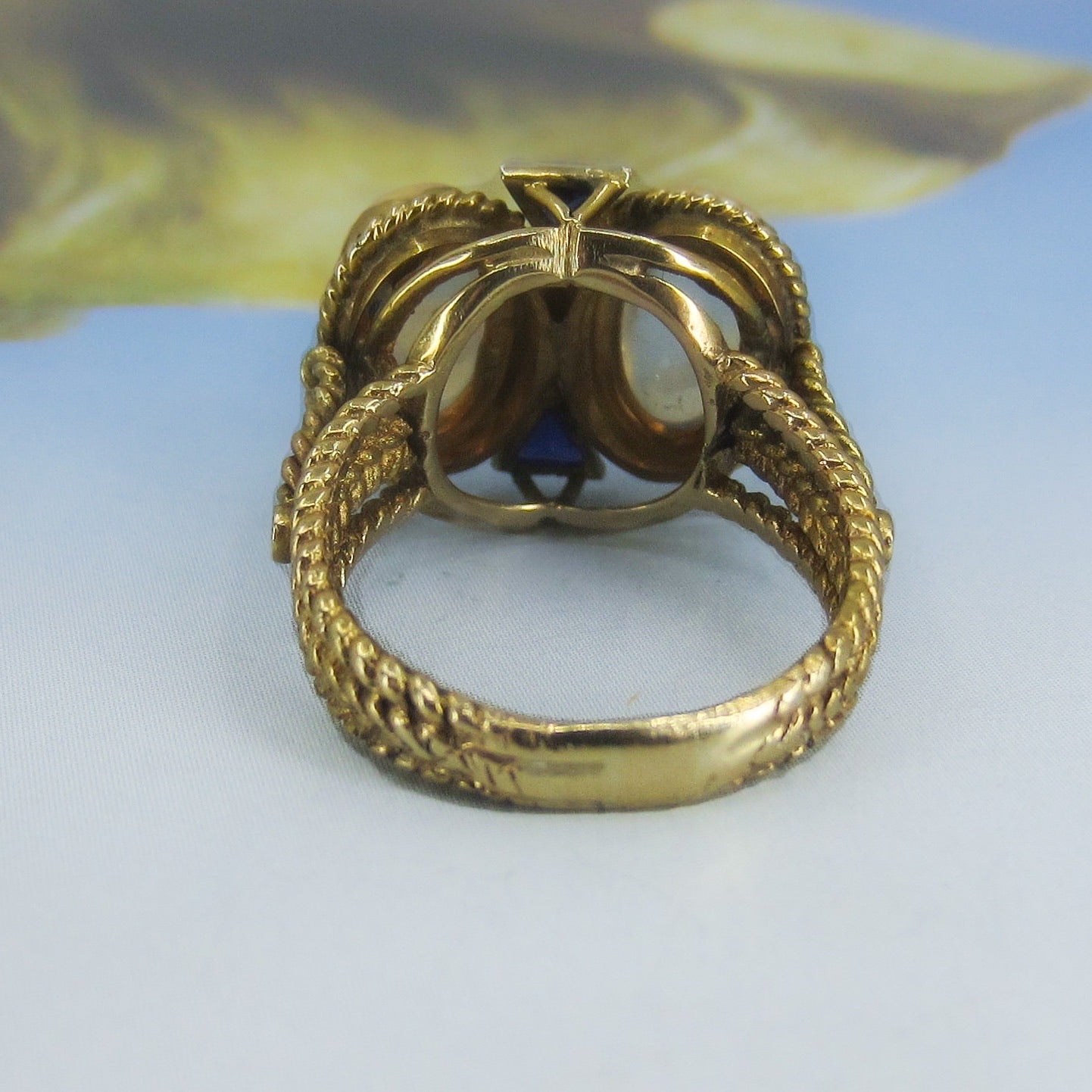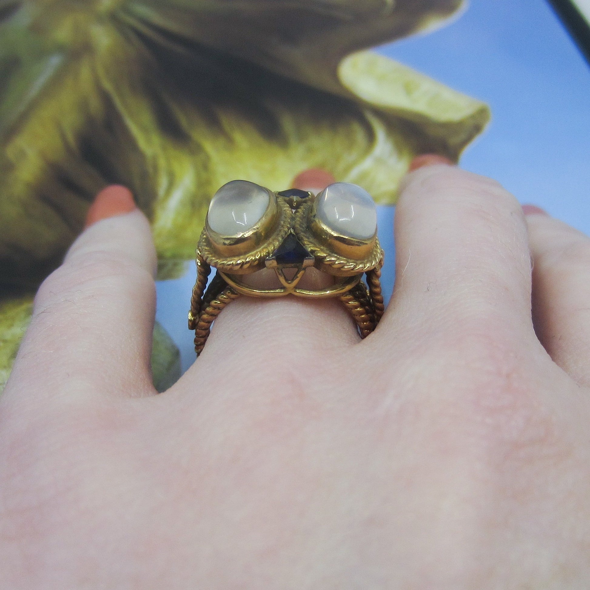 This ring has so much presence and it is much better in person than I was able to capture in the photos! I believe it was made in the 1960's but there's part of me that thinks it could be much earlier. Or perhaps it was an earlier element that was customized in the 1960's. It has that vibe. Made in golden and heavy 14k with rope twists throughout, this ring holds two blue moonstone cabochons and two triangular cut sapphires. It is big, it is tall and it makes itself KNOWN! Super chic and overall a really interesting piece for someone who likes more unusual pieces.